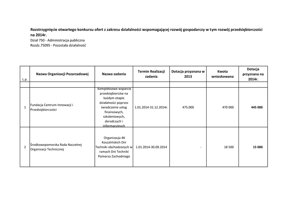 Rozstrzygnięcie otwartego konkursu ofert z zakresu działalności wspomagającej rozwój gospodarczy w tym rozwój przedsiębiorczości na 2014r. Dział 750 - Administracja publiczna Rozdz.75095 - Pozostała działalność Nazwa Organizacji Pozarzadowej L.p. 1 2 Fundacja Centrum Innowacji i Przedsiębiorczości Środkowopomorska Rada Naczelnej Organizacji Technicznej Nazwa zadania Termin Realizacji zadania Kompleksowe wsparcie przedsiębiorców na każdym etapie działalności poprzez świadczenie usług 1.01.2014-31.12.2014r. finansowych, szkoleniowych, doradczych i informacyjnych Organizacja 46 Koszalińskich Dni Techniki obchodzonych w 1.01.2014-30.09.2014 ramach Dni Techniki Pomorza Zachodniego Dotacja przyznana w 2013 475.000 - Kwota wnioskowana Dotacja przyznana na 2014r. 470 000 445 000 18 500 15 000 3 4 5 6 Forum Gospodarcze "Biznes w trudnych czasach" 17.02.2014-15.04.2014 Koszalińska Izba Przemysłowo-Handlowa Konkurs gospodarczy "Koszaliński Denar Nagroda Gospodarcza Roku 2013" 1.02.2014-30.12.2014 Koszalińska Izba Przemysłowo-Handlowa Cykl spotkań gospodarczych "Kulturalnie o biznesie" 1.02.2014-30.12.2014 - 12 000 Utworzenie punktu sprzedaży w Centrum Zdrowia Psychicznego w 15.01.2014-25.02.2014 Koszalinie prowadzonego przez osoby niepełnosprawne - 7 250 Koszalińskie Stowarzyszenie Przedsiębiorców "Gospodarni" Spółdzielnia Socjalna Nowa Przystań - 11 800 5 000 10 000 5 000 oferta odrzucona ze względów formalnych 7 Zrzeszenie Kupców i przedsiębiorców Punkt konsultacyjny jako podstawowa forma wspierania przedsiębiorczości poprzez świadczenie usług informacyjno doradczych i szkoleń 01.01.2014-31.12.2014 - 90 000 Razem oferta odrzucona ze względów formalnych 470 000 Akceptuję: