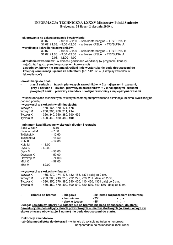 INFORMACJA TECHNICZNA LXXXV Mistrzostw Polski Seniorów Bydgoszcz, 31 lipca - 2 sierpnia 2009 r. - skierowania na zakwaterowanie i wyżywienie: 30.07. - 16:00 -21:00 - sala konferencyjna – TRYBUNA B 31.07. i 1.08. - 9:00 -12:00 - w biurze KPZLA - TRYBUNA A - weryfikacja i skreślenia zawodników : 30.07. - 16:00 -21:00 - sala konferencyjna – TRYBUNA B 31.07. i 1.08. - 9:00 -12:00 - w biurze KPZLA - TRYBUNA A 2.08. -12:00-14:00 -„-„– - skreślenia zawodników: w dniach i godzinach weryfikacji (w przypadku kontuzji najpóźniej 1 godz. przed rozpoczęciem konkurencji) zawodnicy, którzy nie zostaną skreśleni i nie wystartują nie będą dopuszczeni do kolejnej konkurencji łącznie ze sztafetami (art. 142 ust. 4 „Przepisy zawodów w lekkoatletyce”) - kwalifikacje do finału przy 2 seriach : trzech pierwszych zawodników + 2 z najlepszymi czasami, przy 3 seriach : dwóch pierwszych zawodników + 2 z najlepszymi czasami powyżej 3 serii: pierwszy zawodnik + kolejni zawodnicy z najlepszymi czasami - w konkurencjach technicznych, w których zostaną przeprowadzone eliminacje, minima kwalifikacyjne podano poniżej: - wysokości w skokach (w eliminacjach): Wzwyż K - 160, 165, 170, 174, 178 Wzwyż M - 200, 205, 208, 211, 214 Tyczka K - 320, 340, 360, 380, 390, 400 Tyczka M - 420, 440, 460, 480, 490 - minimum kwalifikacyjne w skokach długich i rzutach: Skok w dal K - 6.10 Skok w dal M - 7.60 Trójskok K - 12.60 Trójskok M - 15.50 Kula K - 14.80 Kula M - 18.00 Dysk K - 48.00 Dysk M - 56.00 Oszczep K - 50.00 Oszczep M - 74.00) Młot K - 57.00 Młot M - 62.00 - wysokości w skokach (w finałach) Wzwyż K - 165, 170, 174, 178, 182, 185, 187 i dalej co 2 cm, Wzwyż M - 203, 208, 213, 218, 222, 225, 228, 231 i dalej co 2 cm, Tyczka K - 330, 350, 370, 380, 390, 400, 410, 420, 430 i dalej co 5 cm, Tyczka M - 430, 450, 470, 490, 500, 510, 520, 530, 540, 550 i dalej co 5 cm. - zbiórka na bramce; - biegowe - 20` przed rozpoczęciem konkurencji - techniczne - 25` - „ - skok o tyczce - 45` - „ Uwaga: Zawodnicy, którzy nie zgłoszą się na bramkę nie będą dopuszczeni do startu. Zawodnicy nie posiadający dwóch prawidłowych numerów startowych (w skoku wzwyż i w skoku o tyczce obowiązuje 1 numer) nie będą dopuszczeni do startu. Dekoracja zawodników - zbiórka medalistów do dekoracji – w tunelu do wyjścia na trybunę honorową bezpośrednio po zakończeniu konkurencji Rozpatrywanie protestów – odwołań a/ w konkurencjach biegowych ustny protest przeciwko decyzji startera o spowodowaniu przez niego falstartu zgłasza zawodnik do Startera, który zgodnie z art. 146 ust. 4 zobowiązany jest rozpatrzyć wniosek wspólnie z Sędzią Głównym Biegów pełniącym funkcję Arbitra Startu. Arbiter Startu może podjąć decyzję o warunkowym dopuszczeniu zawodnika do startu, a po zakończeniu biegu ponownie rozpatruje wszystkie okoliczności dotyczące decyzji startera i podejmuje ostateczną decyzję. b/ w konkurencjach technicznych ustny protest przeciwko uznaniu próby za nieważną zgłasza zawodnik do Sędziego Głównego konkurencji natychmiast po podjęciu przez SG decyzji, który zgodnie z art. 146 ust. 5 zobowiązany jest rozpatrzyć wniosek wspólnie z Arbitrem konkurencji. Arbiter może, według własnego uznania, zarządzić dokonanie pomiaru i zanotowanie wyniku, który może być niezbędny po uznaniu protestu. c/ w ciągu 30 minut od oficjalnego ogłoszenia decyzji Arbitra (Startu, Biegów lub konkurencji technicznych) można złożyć na piśmie protest do Komisji Odwoławczej. Protest podpisuje osoba oficjalnie występująca w imieniu zawodnika wraz z kaucją w wysokości 200 PLN. W przypadku nie uznania protestu kaucja przepada. Program minutowy: (korekta z dnia 28.07.2009) 31.07. – przed południem: 10.00 10.30 100 m K pk 10.45 100 m M pk 11.00 100 m K el.(3) 11.30 100 m M el.(4) W dal M elim. I gr. . W dal M elim. II gr. 31.07. – po południu 17.00 17.25 17:50 18.10 18.25 18.40 19.00 19.20 19.25 19.30 19.35 19.45 20:00 20:.20 20:.40 Uroczyste otwarcie zawodów 400 m ppł. K el. (3) 400 m ppł. M el. (3) Wzwyż K el. I gr. 100 m K pF (2) 100 m M pF (2) 800 m K el. (3) 800 m M el. (3) 100 m K Finał B Wzwyż K el. II gr. 100 m K Finał A 100 m K Finał B 100 m M Finał A 400 m K el. (3) 400 m M el. (4) 5 000 m K Finał 5 000 m M (serie) Kula K F Oszczep M el. I gr W dal M F 1.08. – przed południem 9:00 chód 20 km M 9.10 chód 20 km K 9.30 Tyczka M el. I gr. 10.00 10.15 Trójskok M el. I gr. 10.45 Tyczka M el. II gr. 11.00 11.15 400 m K pk Trójskok el. II gr. 11.25 400 m M pk 1.08. – po południu 16.00 16:30 17.00 400 m ppł. K F 17.15 400 m ppł. M F Oszczep M el. II gr. Młot M el. I gr. Kula M el. I gr. Młot M el. II gr. Kula M el. II gr. Młot K F Tyczka K F W dal K F Oszczep K F 17.25 200 m K el. (3) 17.45 200 m M el. (4) 18.00 18.05 400 m K F 18.10 400 m M F 18.20 1 500 m K el. (2) 18.30 18.40 1 500 m M el. (2) 19.00 4 x 100 m K (serie) 19.20 4 x 100 m M (serie) 19.40 800 m K F 19.45 800 m M F 2.08. – po południu 14.00 15.00 100 m ppł. K el. (2) 15.25 110 m ppł. M el. (2) 15.30 15.45 200 m K F 15.55 200 m M F 16.00 16.05 1 500 m K F 16.10 1 500 m M F 16.20 100 m ppł. K F 16.30 110 m ppł. M F 16.40 3 000 m prz. K 17.00 3 000 m prz. M 17.20 4 x 400 m K (serie) 17.35 4 x 400 m M (serie) Wzwyż K F Kula M F Oszczep M F Młot M F Trójskok K F Dysk K F Tyczka M F Wzwyż M F Trójskok M F Dysk M F Ostateczny program minutowy zostanie przedstawiony po weryfikacji w dniu 30 lipca