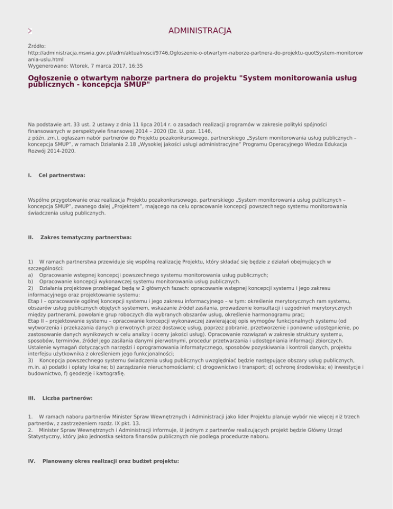 ADMINISTRACJA Źródło: http://administracja.mswia.gov.pl/adm/aktualnosci/9746,Ogloszenie-o-otwartym-naborze-partnera-do-projektu-quotSystem-monitorow ania-uslu.html Wygenerowano: Wtorek, 7 marca 2017, 16:35 Ogłoszenie o otwartym naborze partnera do projektu "System monitorowania usług publicznych - koncepcja SMUP" Na podstawie art. 33 ust. 2 ustawy z dnia 11 lipca 2014 r. o zasadach realizacji programów w zakresie polityki spójności finansowanych w perspektywie finansowej 2014 – 2020 (Dz. U. poz. 1146, z późn. zm.), ogłaszam nabór partnerów do Projektu pozakonkursowego, partnerskiego „System monitorowania usług publicznych – koncepcja SMUP”, w ramach Działania 2.18 „Wysokiej jakości usługi administracyjne” Programu Operacyjnego Wiedza Edukacja Rozwój 2014-2020. I. Cel partnerstwa: Wspólne przygotowanie oraz realizacja Projektu pozakonkursowego, partnerskiego „System monitorowania usług publicznych – koncepcja SMUP”, zwanego dalej „Projektem”, mającego na celu opracowanie koncepcji powszechnego systemu monitorowania świadczenia usług publicznych. II. Zakres tematyczny partnerstwa: 1) W ramach partnerstwa przewiduje się wspólną realizację Projektu, który składać się będzie z działań obejmujących w szczególności: a) Opracowanie wstępnej koncepcji powszechnego systemu monitorowania usług publicznych; b) Opracowanie koncepcji wykonawczej systemu monitorowania usług publicznych. 2) Działania projektowe przebiegać będą w 2 głównych fazach: opracowanie wstępnej koncepcji systemu i jego zakresu informacyjnego oraz projektowanie systemu: Etap I – opracowanie ogólnej koncepcji systemu i jego zakresu informacyjnego – w tym: określenie merytorycznych ram systemu, obszarów usług publicznych objętych systemem, wskazanie źródeł zasilania, prowadzenie konsultacji i uzgodnień merytorycznych między partnerami, powołanie grup roboczych dla wybranych obszarów usług, określenie harmonogramu prac; Etap II – projektowanie systemu – opracowanie koncepcji wykonawczej zawierającej opis wymogów funkcjonalnych systemu (od wytworzenia i przekazania danych pierwotnych przez dostawcę usług, poprzez pobranie, przetworzenie i ponowne udostępnienie, po zastosowanie danych wynikowych w celu analizy i oceny jakości usług). Opracowanie rozwiązań w zakresie struktury systemu, sposobów, terminów, źródeł jego zasilania danymi pierwotnymi, procedur przetwarzania i udostępniania informacji zbiorczych. Ustalenie wymagań dotyczących narzędzi i oprogramowania informatycznego, sposobów pozyskiwania i kontroli danych, projektu interfejsu użytkownika z określeniem jego funkcjonalności; 3) Koncepcja powszechnego systemu świadczenia usług publicznych uwzględniać będzie następujące obszary usług publicznych, m.in. a) podatki i opłaty lokalne; b) zarządzanie nieruchomościami; c) drogownictwo i transport; d) ochronę środowiska; e) inwestycje i budownictwo, f) geodezję i kartografię. III. Liczba partnerów: 1. W ramach naboru partnerów Minister Spraw Wewnętrznych i Administracji jako lider Projektu planuje wybór nie więcej niż trzech partnerów, z zastrzeżeniem rozdz. IX pkt. 13. 2. Minister Spraw Wewnętrznych i Administracji informuje, iż jednym z partnerów realizujących projekt będzie Główny Urząd Statystyczny, który jako jednostka sektora finansów publicznych nie podlega procedurze naboru. IV. Planowany okres realizacji oraz budżet projektu: 1. Planowany okres realizacji projektu wynosi 2 lata. 2. Realizacja zadań merytorycznych partnera lub partnerów wyłonionych w naborze finansowana będzie ze środków projektu. Planowane środki wyodrębnione w budżecie projektu na finansowanie zadań merytorycznych partnera lub partnerów wynoszą 2 400 000 zł. Niniejsze środki stanowiły będą wyłącznie koszty bezpośrednio związane z realizacją zadań merytorycznych. 3. Koszty związane z obsługą administracyjną projektu tj. koszty pośrednie, stanowią koszt własny kandydata na Partnera którego pokrycie należy zadeklarować w ramach wkładu finansowego wnoszonego przez Partnera projektu. Koszty pośrednie należy definiować zgodnie z rozdziałem 8.4 Wytycznych w zakresie kwalifikowalności wydatków w ramach Europejskiego Funduszu Rozwoju Regionalnego, Europejskiego Funduszu Społecznego oraz Funduszu Spójności na lata 2014-2020 https://www.power.gov.pl/media/2155/Wytyczne_kwalifikowalnosc_wydatkow_EFFR_EFS_FS_2014_20.pdf V. Wymagania formalne: 1. O udział w postępowaniu może ubiegać się kandydat na partnera, który spełnia następujące wymagania: 1) Jest stowarzyszeniem lub związkiem jednostek samorządu terytorialnego tj. gmin, powiatów, województw - ocena na podstawie treści dokumentów potwierdzających status prawny kandydata na partnera; 2) Zakres działań prowadzonych przez kandydata na partnera jest zgodny z celami partnerstwa - ocena na podstawie statutu lub innego dokumentu dot. profilu działalności oraz treści zgłoszenia partnera; 3) Deklaruje wniesienie wkładu finansowego w realizację celu partnerstwa, rozumianego jako zdolność do samodzielnego finansowania kosztów związanych z obsługą administracyjną projektu tj. kosztów pośrednich projektu (zgodnie z treścią rozdz. IV pkt. 3. ogłoszenia) - ocena na podstawie treści zgłoszenia partnera; 4) Nie jest podmiotem powiązanym w rozumieniu załącznika I do rozporządzenia Komisji (UE) nr 651/2014 z dnia 17 czerwca 2014 r. uznającego niektóre rodzaje pomocy za zgodne z rynkiem wewnętrznym w zastosowaniu art. 107 i 108 Traktatu (Dz. Urz. UE L 187 z 26.06.2014, str. 1) – ocena na podstawie oświadczenia. 5) Składający zgłoszenie nie jest podmiotem wykluczonym z możliwości otrzymania dofinansowania – ocena na podstawie oświadczenia. 2. Zgłoszenie powinno zawierać (zgodnie z formularzem zgłoszenia stanowiącym załącznik nr 1 do ogłoszenia): 1) Ogólną charakterystykę kandydata na pa