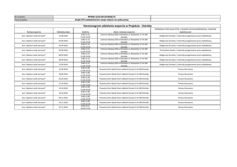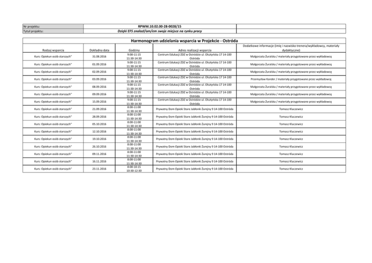 RPWM.10.02.00-28-0028/15 Dzięki EFS znalazł/am/em swoje miejsce na rynku pracy Nr projektu: Tytuł projektu: Harmonogram udzielania wsparcia w Projekcie - Ostróda Rodzaj wsparcia Dokładna data Kurs: Opiekun osób starszych" 31.08.2016 Kurs: Opiekun osób starszych" 01.09.2016 Kurs: Opiekun osób starszych" 02.09.2016 Kurs: Opiekun osób starszych" 03.09.2016 Kurs: Opiekun osób starszych" 08.09.2016 Kurs: Opiekun osób starszych" 09.09.2016 Kurs: Opiekun osób starszych" 15.09.2016 Kurs: Opiekun osób starszych" 21.09.2016 Kurs: Opiekun osób starszych" 28.09.2016 Kurs: Opiekun osób starszych" 05.10.2016 Kurs: Opiekun osób starszych" 12.10.2016 Kurs: Opiekun osób starszych" 19.10.2016 Kurs: Opiekun osób starszych" 26.10.2016 Kurs: Opiekun osób starszych" 09.11.2016 Kurs: Opiekun osób starszych" 16.11.2016 Kurs: Opiekun osób starszych" 23.11.2016 Godziny Adres realizacji wsparcia 9:00-11:15 11:30-14:30 9:00-11:15 11:30-14:30 9:00-11:15 11:30-14:30 9:00-11:15 11:30-14:30 9:00-11:15 11:30-14:30 9:00-11:15 11:30-14:30 9:00-11:15 11:30-14:30 8:00-11:00 11:30-14:30 8:00-11:00 11:30-14:30 8:00-11:00 11:30-14:30 8:00-11:00 11:30-14:30 8:00-11:00 11:30-14:30 8:00-11:00 11:30-14:30 8:00-11:00 11:30-14:30 8:00-11:00 11:30-14:30 8:00-10:15 10:30-12:30 Centrum Edukacji ZDZ w Ostródzie ul. Olsztyńska 17 14-100 Ostróda Centrum Edukacji ZDZ w Ostródzie ul. Olsztyńska 17 14-100 Ostróda Centrum Edukacji ZDZ w Ostródzie ul. Olsztyńska 17 14-100 Ostróda Centrum Edukacji ZDZ w Ostródzie ul. Olsztyńska 17 14-100 Ostróda Centrum Edukacji ZDZ w Ostródzie ul. Olsztyńska 17 14-100 Ostróda Centrum Edukacji ZDZ w Ostródzie ul. Olsztyńska 17 14-100 Ostróda Centrum Edukacji ZDZ w Ostródzie ul. Olsztyńska 17 14-100 Ostróda Dodatkowe informacje (imię i nazwisko trenera/wykładowcy, materiały dydaktyczne) Małgorzata Żuralska / materiały przygotowane przez wykładowcę Małgorzata Żuralska / materiały przygotowane przez wykładowcę Małgorzata Żuralska / materiały przygotowane przez wykładowcę Przemysław Kander / materiały przygotowane przez wykładowcę Małgorzata Żuralska / materiały przygotowane przez wykładowcę Małgorzata Żuralska / materiały przygotowane przez wykładowcę Małgorzata Żuralska / materiały przygotowane przez wykładowcę Prywatny Dom Opieki Stare Jabłonki Żurejny 9 14-100 Ostróda Tomasz Kluczewicz Prywatny Dom Opieki Stare Jabłonki Żurejny 9 14-100 Ostróda Tomasz Kluczewicz Prywatny Dom Opieki Stare Jabłonki Żurejny 9 14-100 Ostróda Tomasz Kluczewicz Prywatny Dom Opieki Stare Jabłonki Żurejny 9 14-100 Ostróda Tomasz Kluczewicz Prywatny Dom Opieki Stare Jabłonki Żurejny 9 14-100 Ostróda Tomasz Kluczewicz Prywatny Dom Opieki Stare Jabłonki Żurejny 9 14-100 Ostróda Tomasz Kluczewicz Prywatny Dom Opieki Stare Jabłonki Żurejny 9 14-100 Ostróda Tomasz Kluczewicz Prywatny Dom Opieki Stare Jabłonki Żurejny 9 14-100 Ostróda Tomasz Kluczewicz Prywatny Dom Opieki Stare Jabłonki Żurejny 9 14-100 Ostróda Tomasz Kluczewicz