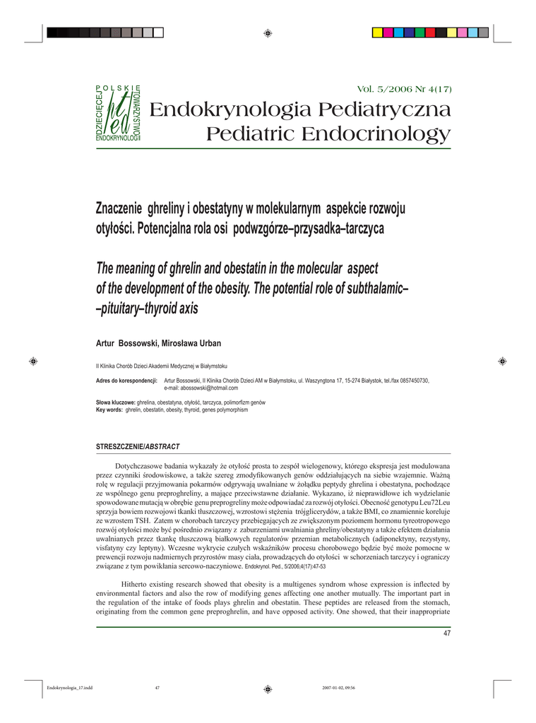 Vol. 5/2006 Nr 4(17) Endokrynologia Pediatryczna Pediatric Endocrinology Znaczenie ghreliny i obestatyny w molekularnym aspekcie rozwoju otyłości. Potencjalna rola osi podwzgórze–przysadka–tarczyca The meaning of ghrelin and obestatin in the molecular aspect of the development of the obesity. The potential role of subthalamic– –pituitary–thyroid axis Artur Bossowski, Mirosława Urban II Klinika Chorób Dzieci Akademii Medycznej w Białymstoku Adres do korespondencji: Artur Bossowski, II Klinika Chorób Dzieci AM w Białymstoku, ul. Waszyngtona 17, 15-274 Białystok, tel./fax 0857450730, e-mail: [email protected] Słowa kluczowe: ghrelina, obestatyna, otyłość, tarczyca, polimorfizm genów Key words: ghrelin, obestatin, obesity, thyroid, genes polymorphism STRESZCZENIE/ABSTRACT Dotychczasowe badania wykazały że otyłość prosta to zespół wielogenowy, którego ekspresja jest modulowana przez czynniki środowiskowe, a także szereg zmodyfikowanych genów oddziałujących na siebie wzajemnie. Ważną rolę w regulacji przyjmowania pokarmów odgrywają uwalniane w żołądku peptydy ghrelina i obestatyna, pochodzące ze wspólnego genu preproghreliny, a mające przeciwstawne działanie. Wykazano, iż nieprawidłowe ich wydzielanie spowodowane mutacją w obrębie genu preprogreliny może odpowiadać za rozwój otyłości. Obecność genotypu Leu72Leu sprzyja bowiem rozwojowi tkanki tłuszczowej, wzrostowi stężenia trójglicerydów, a także BMI, co znamiennie koreluje ze wzrostem TSH. Zatem w chorobach tarczycy przebiegających ze zwiększonym poziomem hormonu tyreotropowego rozwój otyłości może być pośrednio związany z zaburzeniami uwalniania ghreliny/obestatyny a także efektem działania uwalnianych przez tkankę tłuszczową białkowych regulatorów przemian metabolicznych (adiponektyny, rezystyny, visfatyny czy leptyny). Wczesne wykrycie czułych wskaźników procesu chorobowego będzie być może pomocne w prewencji rozwoju nadmiernych przyrostów masy ciała, prowadzących do otyłości w schorzeniach tarczycy i ograniczy związane z tym powikłania sercowo-naczyniowe. Endokrynol. Ped., 5/2006;4(17):47-53 Hitherto existing research showed that obesity is a multigenes syndrom whose expression is inflected by environmental factors and also the row of modifying genes affecting one another mutually. The important part in the regulation of the intake of foods plays ghrelin and obestatin. These peptides are released from the stomach, originating from the common gene preproghrelin, and have opposed activity. One showed, that their inappropriate 47 Endokrynologia_17.indd 47 2007-01-02, 09:56 Endokrynol. Ped., 5/2006;4(17):47-53 Praca przeglądowa secretion resulting from the mutation within the gene preproghrelin can be accountable for the development of the obesity. The presence of the genotype Leu72Leu favours the development of the adipose tissue, the increase of the concentration of triglycerides as well as BMI, what characteristicly correlates with the increase of TSH. So, in thyroid disorders with enlarged level of the thyrotropin hormone the development of the obesity can be indirectly connected with disturbances of releasing ghrelin/obestatin and also with the effect of the activity of albuminous regulators of metabolic transformations (adiponectin, resistin, visfatin or leptin). The early detection of sensitive indicators of the sickness-process will be probably helpful in prevention of the development of excessive increases of the body mass leading to the obesity in thyroid disorders and will limit connected with this cardiovascular complications. Pediatr. Endocrinol., 5/2006;4(17):47-53 Osiągnięcia badawcze nauk podstawowych obecnego półwiecza (w tym genetyki, biologii molekularnej, immunologii) przyczyniły się znacząco do lepszego rozumienia istoty zjawisk etiopatogenetycznych, warunkujących rozwój licznych chorób trapiących ludzkość. Osiągnięcia te dotyczą wielu chorób wieku dziecięco-młodzieżowego z grupy autoagresyjnych, metabolicznych, endokrynologicznych czy nowotworowych. Obecne półwiecze udokumentowało także lekarzom praktykom, że pierwsza manifestacja kliniczna wielu z tych chorób obniżyła znacząco granice wiekowe, czego przykładem może być: cukrzyca, choroba Gravesa-Basedowa, choroba wrzodowa, astma wczesnodziecięca czy choroby reumatoidalne, wiązane dotychczas zwyczajowo z wiekiem dorastania lub dorosłym. Techniki biologii molekularnej czy immunologii pozwalają śledzić zachodzące w ustroju człowieka zjawiska fizjologiczne oraz wcześnie wykryć na poziomie elementarnych struktur komórkowych procesy patologiczne (chorobotwórcze) rozstrzygające się w różnych komórkach, narządach czy układach organizmu ludzkiego, niejednokrotnie wyprzedzające wystąpienie objawów klinicznych. Otyłość, nadciśnienie czy cukrzyca są coraz powszechniej występującymi czynnikami ryzyka miażdżycy w populacji wieku rozwojowego [1]. Otyłość już w wieku młodzieńczym związana jest z nietolerancją glukozy, nieprawidłowościami w gospodarce lipidowej, nadciśnieniem. Nieliczne wieloletnie prospektywne badania potwierdzają zwiększoną śmiertelność z powodu chorób układu sercowo-naczyniowego u osób otyłych już jako dzieci [2]. Na cukrzycę typu 2 choruje obecnie duża grupa dzieci i młodzieży, a prognozy wskazują, że zachorowalność na tę chorobę w populacji wieku rozwojowego będzie rosła. Dzieci chore na cukrzycę są w szczególny sposób narażone na wczesny rozwój miażdżycy. Obecność bowiem wysokich stężeń cholesterolu, głównie frakcji LDL, jest jednym z głównych czynników rozwoju procesu ateroskle- rozy spowodowanej akumulacją lipidów w ścianie naczynia [3]. Okazuje się ponadto, że patologia ta jest bardziej złożona, ponieważ pomimo wprowadzenia zmiany stylu życia oraz nowych leków farmakologicznych, powodujących obniżenie stężenia cholesterolu, choroby układu