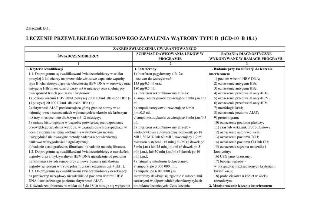 Załącznik B.1. LECZENIE PRZEWLEKŁEGO WIRUSOWEGO ZAPALENIA WĄTROBY TYPU B (ICD-10 B 18.1) ZAKRES ŚWIADCZENIA GWARANTOWANEGO SCHEMAT DAWKOWANIA LEKÓW W BADANIA DIAGNOSTYCZNE ŚWIADCZENIOBIORCY PROGRAMIE WYKONYWANE W RAMACH PROGRAMU 1 2 3 1. Kryteria kwalifikacji 1. Interferony: 1. Badania przy kwalifikacji do leczenia 1.1. Do programu są kwalifikowani świadczeniobiorcy w wieku 1) interferon pegylowany alfa-2a: interferonem powyżej 3 lat, chorzy na przewlekle wirusowe zapalenie wątroby - roztwór do wstrzykiwań: 1) poziom wiremii HBV DNA; typu B, charakteryzujący się obecnością HBV DNA w surowicy oraz 135 µg/0,5 ml oraz 2) oznaczenie antygenu HBs; antygenu HBs przez czas dłuższy niż 6 miesięcy oraz spełniający 180 µg/0,5 ml; 3) oznaczenie antygenu HBe; dwa spośród trzech poniższych kryteriów: 2) interferon rekombinowany alfa-2a: 4) oznaczenie przeciwciał anty-HBe; 1) poziom wiremii HBV DNA powyżej 2000 IU/mL dla osób HBe (- a) ampułkostrzykawki zawierające 3 mln j.m./0,5 5) oznaczenie przeciwciał anty-HCV; ) i powyżej 20 000 IU/mL dla osób HBe (+); ml, 6) oznaczenie przeciwciał anty-HIV; 2) aktywność AIAT przekraczająca górną granicę normy w co b) ampułkostrzykawki zawierające 6 mln 7) morfologia krwi; najmniej trzech oznaczeniach wykonanych w okresie nie krótszym j.m./0,5 ml, 8) oznaczenie poziomu AIAT; niż trzy miesiące i nie dłuższym niż 12 miesięcy; c) ampułkostrzykawki zawierające 9 mln j.m./0,5 9) proteinogram; 3) zmiany histologiczne w wątrobie potwierdzające rozpoznanie ml; 10) oznaczenie poziomu glukozy; przewlekłego zapalenia wątroby; w uzasadnionych przypadkach w 3) interferon rekombinowany alfa-2b 11) czas lub wskaźnik protrombinowy; ocenie stopnia nasilenia włóknienia wątrobowego można wielodawkowy automatyczny dozownik po 18 12) oznaczenie autoprzeciwciał; uwzględniać nieinwazyjne metody badania o potwierdzonej MIU, 30 MIU lub 60 MIU, zawierający 1,2 ml 13) oznaczenie poziomu TSH; naukowo wiarygodności diagnostycznej: roztworu o stężeniu 15 mln j.m./ml (6 dawek po 14) oznaczenie poziomu fT4 lub fT3; a) badanie elastograficzne, fibroskan, b) badanie metodą fibrotest. 3 mln j.m.) lub 25 mln j.m./ml (6 dawek po 5 15) oznaczenie stężenia mocznika i 1.2. Do programu są kwalifikowani świadczeniobiorcy z marskością mln j.m.), lub 50 mln j.m./ml (6 dawek po 10 kreatyniny; wątroby oraz z wykrywalnym HBV DNA niezależnie od poziomu mln j.m.); 16) USG jamy brzusznej; transaminaz (świadczeniobiorcy z niewyrównaną marskością 4) naturalny interferon leukocytarny: 17) biopsja wątroby wątroby są leczeni w trybie pilnym, z zastrzeżeniem ust. 4 pkt 1). a) ampułki po 3 000 000 j.m., w przypadkach uzasadnionych kryteriami 1.3. Do programu są kwalifikowani świadczeniobiorcy oczekujący b) ampułki po 6 000 000 j.m. kwalifikacji; na przeszczep narządowy niezależnie od poziomu wiremii HBV Interferony dawkuje się zgodnie z zaleceniami 18) próba ciążowa u kobiet w wieku DNA i stwierdzonego poziomu aktywności AIAT. zawartymi w odpowiednich charakterystykach rozrodczym. 2. U świadczeniobiorców w wieku od 3 do 18 lat stosuje się wyłącznie produktów leczniczych. Czas leczenia 2. Monitorowanie leczenia interferonem interferon rekombinowany alfa-2b. 3. Lekiem pierwszego rzutu w terapii pacjentów z przewlekłym wirusowym zapaleniem wątroby typu B dotychczas nieleczonych są interferony stosowane w monoterapii, o ile nie ma przeciwwskazań do ich podania. Preferowanym interferonem ze względu na wyniki leczenia jest interferon pegylowany alfa-2a, a pozostałe interferony bierze się pod uwagę tylko w szczególnych sytuacjach, podanych w odpowiednich charakterystykach produktów leczniczych. 4. Choroby lub stany wykluczające stosowanie interferonów 1) niewyrównana marskość wątroby; 2) ciężka współistniejąca choroba serca, w tym niewydolność krążenia, niestabilna choroba wieńcowa; 3) niewyrównana cukrzyca insulinozależna; 4) choroby o podłożu autoimmunologicznym, z wyłączeniem autoimmunologicznego zapalenia wątroby typu II (anty-LKM-1); 5) niewyrównana nadczynność tarczycy; 6) retinopatia (po konsultacji okulistycznej); 7) padaczka (po konsultacji neurologicznej); 8) czynne uzależnienie od alkoholu lub środków odurzających; 9) ciąża lub karmienie piersią; 10) czynna psychoza, depresja (po konsultacji psychiatrycznej); 11) choroba nowotworowa czynna lub z dużym ryzykiem wznowy (po konsultacji onkologicznej, hematoonkologicznej lub hematologicznej); 12) inne przeciwwskazania do stosowania poszczególnych rodzajów interferonu określone w odpowiednich charakterystykach produktów leczniczych. 5. Kryteria wyłączenia z leczenia interferonem 1) brak odpowiedzi po 12 tygodniach leczenia definiowanej jako zmniejszenie poziomu wiremii HBV DNA o co najmniej 1 log10; 2) wystąpienie objawów nadwrażliwości lub nietolerancji na substancję czynną lub pomocniczą; 3) choroby lub stany wymienione w ust. 4 ujawnione w trakcie leczenia interferonem. interferonami nie może przekroczyć 48 tygodni. 2. Analogi nukleozydowe lub nukleotydowe 1) lamiwudyna - tabletki po 100 mg - raz dziennie 1 tabletka; 2) entekawir: a) tabletki po 0,5 mg - raz dziennie 1 tabletka u osób uprzednio nieleczonych analogami nukleozydowymi lub nukleotydowymi, b) tabletki po 1,0 mg - raz dziennie 1 tabletka u osób uprzednio leczonych analogami nukleozydowymi lub nukleotydowymi; 3) adefowir - tabletki po 10,0 mg - raz dziennie 1 tabletka; 4) tenofowir - tabletki po 245 mg - raz dziennie 1 tabletka. 1) w dniu rozpoczęcia terapii: a) morfologia krwi, b) oznaczenie poziomu AIAT, c) czas lub wskaźnik protrombinowy, d) oznaczenie stężenia kreatyniny, e) oznaczenie poziomu AFP; 2) w 2, 4, 6, 8, 12,16, 20, 24, 28, 32, 36, 40, 44, 48 tygodniu: a) morfologia krwi, b) oznaczenie poziomu AIAT; 3) w 4, 12, 24, 48 tygodniu - oznaczenie stężenia kreatyniny; 4) w 12 tygodniu: a) poziom wiremii HBV DNA, b) oznaczenie ant