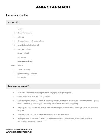 ANIA STARMACH Łosoś z grilla Co kupić? Łosoś 2 dzwonka łososia 1 cytryna 6 dokładnie umytych ziemniaków 10 pomidorków koktajlowych 10 czarnych oliwek oliwa z oliwek sól, pieprz Masło czosnkowe 50g masła 1 ząbek czosnku 1 łyżka świeżego koperku sól, pieprz Jak przygotować? 1. Dzwonka łososia skrop oliwą i sokiem z cytryny, dodaj sól i pieprz. 2. Grilluj około 4–5 minut z każdej strony. 3. Ziemniaki gotuj około 20 minut w osolonej wodzie, następnie przekrój na połówki/ćwiartki i grilluj około 10 minut, przewracając, co chwilę, aby równomiernie się przypiekły. 4. Na patyczki do szaszłyków nabijaj naprzemiennie pomidorki i oliwki, szaszłyki połóż na 2 minuty na grillu. 5. Masło wymieszaj z czosnkiem i koperkiem, dopraw do smaku. 6. Rybę podawaj z ziemniaczkami, szaszłykami i masłem czosnkowym, całość skrop obficie pozostałym sokiem z cytryny. Przepis pochodzi ze strony www.aniastarmach.pl