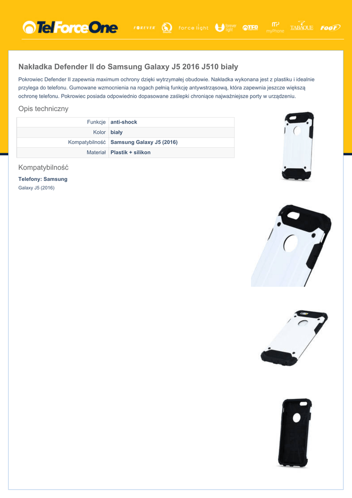 Nakładka Defender II do Samsung Galaxy J5 2016 J510 biały Pokrowiec Defender II zapewnia maximum ochrony dzięki wytrzymałej obudowie. Nakładka wykonana jest z plastiku i idealnie przylega do telefonu. Gumowane wzmocnienia na rogach pełnią funkcję antywstrząsową, która zapewnia jeszcze większą ochronę telefonu. Pokrowiec posiada odpowiednio dopasowane zaślepki chroniące najważniejsze porty w urządzeniu. Opis techniczny Funkcje anti-shock Kolor biały Kompatybilność Samsung Galaxy J5 (2016) Materiał Plastik + silikon Kompatybilność Telefony: Samsung Galaxy J5 (2016)