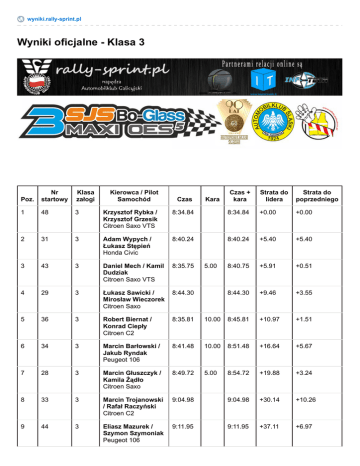 wyniki.rally-sprint.pl Wyniki oficjalne - Klasa 3 Poz. Nr startowy Klasa załogi Kierowca / Pilot Samochód Strata do lidera Strata do poprzedniego 1 48 3 Krzysztof Rybka / Krzysztof Grzesik Citroen Saxo VTS 8:34.84 8:34.84 +0.00 +0.00 2 31 3 Adam Wypych / Łukasz Stępień Honda Civic 8:40.24 8:40.24 +5.40 +5.40 3 43 3 Daniel Mech / Kamil Dudziak Citroen Saxo VTS 8:35.75 8:40.75 +5.91 +0.51 4 29 3 Łukasz Sawicki / Mirosław Wieczorek Citroen Saxo 8:44.30 8:44.30 +9.46 +3.55 5 36 3 Robert Biernat / Konrad Ciepły Citroen C2 8:35.81 10.00 8:45.81 +10.97 +1.51 6 34 3 Marcin Barłowski / Jakub Ryndak Peugeot 106 8:41.48 10.00 8:51.48 +16.64 +5.67 7 28 3 Marcin Głuszczyk / Kamila Żądło Citroen Saxo 8:49.72 5.00 8:54.72 +19.88 +3.24 8 33 3 Marcin Trojanowski / Rafał Raczyński Citroen C2 9:04.98 9:04.98 +30.14 +10.26 9 44 3 Eliasz Mazurek / Szymon Szymoniak Peugeot 106 9:11.95 9:11.95 +37.11 +6.97 Czas Kara 5.00 Czas + kara 10 45 3 Daniel Ferenczak / Kamil Nestorowicz Honda CRX 9:07.49 5.00 9:12.49 +37.65 +0.54 11 41 3 Artur Studnicki / Maciej Chrupcała Peugeot 106 9:13.71 5.00 9:18.71 +43.87 +6.22 12 32 3 Marcin Popiela / Artur Jaszczyński Citroen C2 9:21.97 9:21.97 +47.13 +3.26 13 30 3 Łukasz Mrożek / Bartosz Trojanowski Citroen Saxo 9:30.68 5.00 9:35.68 +1:00.84 +13.71 14 38 3 Szymon Kalczyński / Mieczysław Kalczyński Honda Civic EH9 9:19.33 20.00 9:39.33 +1:04.49 +3.65 15 46 3 Robert Wanicki / Dariusz Goryczka Citroen Saxo 9:46.63 9:46.63 +1:11.79 +7.30 16 35 3 Wojciech Tomalik / Jakub Tomalik Daewoo Lanos 9:42.56 15.00 9:57.56 +1:22.72 +10.93 17 47 3 Arkadiusz Abram / Maciej Kwolek Honda Civic 10:19.07 10.00 10:29.07 +1:54.23 +31.51 18 42 3 Marcin Dudziak / Michał Jura Peugeot 206 19:23.04 19:23.04 +10:48.20 +8:53.97 Niesklasyfikowani Kierowca / Pilot Samochód Nr startowy Klasa załogi 37 3 Jakub Papaj / Maciej Wojtusik Honda Civic AWARIA 40 3 Wojciech Wilk / Marcin Myszka Peugeot 106 AWARIA Rally Sprint © 2014-2014 Powód