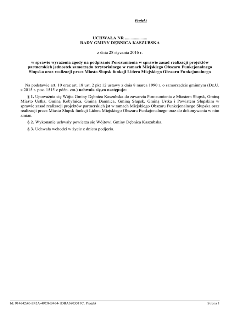 Projekt UCHWAŁA NR .................... RADY GMINY DĘBNICA KASZUBSKA z dnia 28 stycznia 2016 r. w sprawie wyrażenia zgody na podpisanie Porozumienia w sprawie zasad realizacji projektów partnerskich jednostek samorządu terytorialnego w ramach Miejskiego Obszaru Funkcjonalnego Słupska oraz realizacji przez Miasto Słupsk funkcji Lidera Miejskiego Obszaru Funkcjonalnego Na podstawie art. 10 oraz art. 18 ust. 2 pkt 12 ustawy z dnia 8 marca 1990 r. o samorządzie gminnym (Dz.U. z 2015 r. poz. 1515 z późn. zm.) uchwala się,co następuje: § 1. Upoważnia się Wójta Gminy Dębnica Kaszubska do zawarcia Porozumienia z Miastem Słupsk, Gminą Miasto Ustka, Gminą Kobylnica, Gminą Damnica, Gminą Słupsk, Gminą Ustka i Powiatem Słupskim w sprawie zasad realizacji projektów partnerskich jst w ramach Miejskiego Obszaru Funkcjonalnego Słupska oraz realizacji przez Miasto Słupsk funkcji Lidera Miejskiego Obszaru Funkcjonalnego oraz do dokonywania w nim zmian. § 2. Wykonanie uchwały powierza się Wójtowi Gminy Dębnica Kaszubska. § 3. Uchwała wchodzi w życie z dniem podjęcia. Id: 914642A0-E42A-49C8-B464-1DBA6805517C. Projekt Strona 1 Uzasadnienie 1. Przedstawienie istniejącego stanu w dziedzinie, która ma być normowana. Nowa perspektywa finansowa 2014-2020 wprowadziła zmiany w dotychczasowym podejściu do planowania rozwoju poszczególnych gmin i powiatów. Miasto Słupsk wraz z gminami sąsiednimi tworzy obszar wzajemnie zintegrowany i wzajemnie na siebie oddziałujący pod względem społeczno– gospodarczym – Miejski Obszar Funkcjonalny (MOF). Z uwagi na pełnione przez siebie funkcje, Miasto Słupsk stało się naturalnym Liderem Miejskiego Obszaru Funkcjonalnego, przystępując w 2013 r. do negocjacji Zintegrowanego Porozumienia Terytorialnego (ZPT) dla MOF Słupska z Zarządem Województwa Pomorskiego. Miasto, jako Lider MOF odpowiedzialne jest m.in. za: organizację prac Wspólnej Reprezentacji Obszaru Funkcjonalnego Słupska, organizację procesu zatwierdzania projektu ZPT i wprowadzania do niego zmian, podejmowanie renegocjacji Porozumienia z Zarządem Województwa w imieniu ROFS, monitorowanie procesu przygotowań do aplikowania o środki dla poszczególnych przedsięwzięć ujętych w Porozumieniu. Objęcie roli Lidera MOF wiąże się jednak z dodatkowymi obowiązkami i nakładami pracy ze strony Urzędu Miejskiego w Słupsku, w tym przede wszystkim Wydziału Zarządzania Funduszami pełniącego funkcję oficjalnego Sekretariatu MOF. Otwarcie nowej perspektywy finansowej wprowadziło również zmiany w zasadach realizacji projektów partnerskich. Zasady te regulują m.in. zapisy tzw. ustawy wdrożeniowej tj. Ustawy z dnia 29.08.2014 r. o zasadach realizacji programów w zakresie polityki spójności finansowanych w perspektywie finansowej 2014–2020. Ustawa wprowadziła tzw. scentralizowany model partnerstwa, w którym Partner Wiodący jest zarówno Beneficjentem, jak i jedyną Stroną umowy o dofinansowanie. Lider Projektu pełni w projekcie rolę kluczową, ponieważ odpowiada on bezpośrednio wobec Instytucji Dotującej za przygotowanie, realizację, a następnie rozliczenie projektu. 2. Wyjaśnienie potrzeb podjęcia uchwały. W celu sprawnej realizacji projektów partnerskich w ramach Miejskiego Obszaru Funkcjonalnego Słupska konieczne jest ustalenie wspólnych zasad realizacji projektów, w tym podstawowych obowiązków Lidera i Partnerów Projektu. Zasady te zostały określone w Porozumieniu. Jednocześnie w związku z pełnieniem przez Miasto Słupsk funkcji Lidera MOF i reprezentowaniem przez nie wspólnych interesów jst wchodzących w skład MOF, w wyniku podjętych negocjacji z samorządami w Porozumieniu uzgodniono potrzebę powołania Biura MOF, którego rolę pełni Referat Pozyskiwania Funduszy Wydziału Zarządzania Funduszami Urzędu Miejskiego w Słupsku. Wydział Zarządzania Funduszami pełni również funkcję Sekretariatu MOF. Porozumienie określa podstawowe obowiązki ciążące na Biurze MOF oraz zasady współfinansowania kosztów funkcjonowania Biura przez poszczególne jednostki samorządu terytorialnego. 3. Charakterystyka przewidywanych skutków społecznych i gospodarczych. Zawarcie Porozumienia ma na celu zrównoważony rozwój oraz zwiększenie zaangażowania jednostek z obszaru funkcjonalnego w pozyskiwanie i efektywne wykorzystanie funduszy Unii Europejskiej w ramach perspektywy finansowej 2014-2020 służących rozwojowi MOF Słupska. Współpraca jednostek samorządu terytorialnego m.in. w ramach wspólnych partnerskich projektów przyczyniać się będzie do wzmocnienia potencjału oraz integralności przestrzennej obszaru funkcjonalnego Słupska poprzez kompleksowe podejście do planowania rozwoju i rozwiązywania problemów, z jakimi borykają się JST w obszarze funkcjonalnym Miasta Słupska. Współpraca polegać będzie na uzgodnieniu i wspólnej realizacji przedsięwzięć o znaczeniu regionalnym i ponadlokalnym z różnych obszarów tematycznych służących wykorzystaniu szans rozwojowych i poprawie warunków życia mieszkańców MOF. 4. Skutki finansowe związane z wejściem w życie uchwały. Strony Porozumienia będą wspólnie w 2016 r. partycypować w kosztach, związanych z funkcją Miasta Słupska, jako Lidera MOF, ponoszonymi w związku z funkcjonowaniem Biura MOF oraz Sekretariatu MOF. Współfinansowanie kosztów odbywać się będzie poprzez przekazanie Miastu Słupsk w terminie do 31.03.2016 r. przez jst będące Stronami Porozumienia dotacji celowej w łącznej kwocie 38 206,43 zł, w tym: Miasto Ustka - 8 744,42 zł, Gmina Słupsk - 8 360,26 zł, Gmina Kobylnica - 6 763,14 zł, Gmina Damnica - 4 949,22 zł, Gmina Dębnica Kaszubska - 5 563,20 zł, Gmina Ustka - 1 083,33 zł, Powiat Słupski - 2 742,86 zł. Wkład własny Miasta Słupska w finansowanie Biura MOF oszacowany na poziomie 9 793,58 zł, ponoszony poprzez wypłatę wynagrodzeń pracowników zatrudnionych w Wydziale Zarządzania Funduszam
