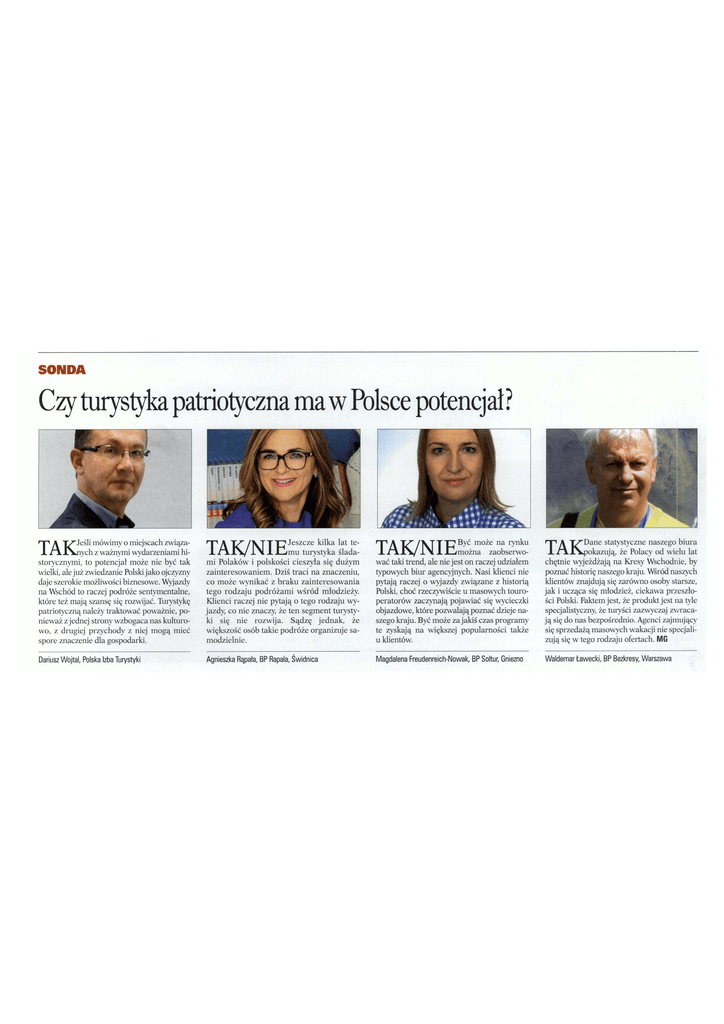 SONDA Czy turystyka patriotyczna ma w Polsce potencjał? np Ą np A TV"Jeśli mówimy o miejscach związa_1_ l\J\j]vch z ważnymi wydarzeniami hi storycznymi, to potencjał może nie być tak wielki, ale już zwiedzanie Polski jako ojczyzny daje szerokie możliwości biznesowe. Wyjazdy na Wschód to raczej podróże sentymentalne, które też mają szansę się rozwijać. Turystykę patriotyczną należy traktować poważnie, po nieważ z jednej strony wzbogaca nas kulturo wo, z drugiej przychody z niej mogą mieć spore znaczenie dla gospodarki. np A TV" /X T T T"1 Jeszcze kilka lat teJL /i.INy IN JL Ujm u turystyka ślada mi Polaków i polskości cieszyła się dużym zainteresowaniem. Dziś traci na znaczeniu, co może wynikać z braku zainteresowania tego rodzaju podróżami wśród młodzieży. Klienci raczej nie pytają o tego rodzaju wy jazdy, co nie znaczy, że ten segment turysty ki się nie rozwija. Sądzę jednak, że większość osób takie podróże organizuje sa modzielnie. HP Ą TV" /X TT "Tj1 Być może na rynku J. /xXx/ IN JL ri można zaobserwo wać taki trend, ale nie jest on raczej udziałem typowych biur agencyjnych. Nasi klienci nie pytają raczej o wyjazdy związane z historią Polski, choć rzeczywiście u masowych touroperatorów zaczynają pojawiać się wycieczki objazdowe, które pozwalają poznać dzieje na szego kraju. Być może za jakiś czas programy te zyskają na większej popularności także u klientów. TV"Dane statystyczne naszego biura .L / liNpokazują, że Polacy od wielu lat chętnie wyjeżdżają na Kresy Wschodnie, by poznać historię naszego kraju. Wśród naszych klientów znajdują się zarówno osoby starsze, jak i ucząca się młodzież, ciekawa przeszło ści Polski. Faktem jest, że produkt jest na tyle specjalistyczny, że turyści zazwyczaj zwraca ją się do nas bezpośrednio. Agenci zajmujący się sprzedażą masowych wakacji nie specjali zują się w tego rodzaju ofertach. WIG Dariusz Wojtal, Polska Izba Turystyki Agnieszka Rąpata, BP Rapala, Świdnica Magdalena Freudenreich-Nowak, BP Soltur, Gniezno Waldemar Ławecki, BP Bezkresy, Warszawa
