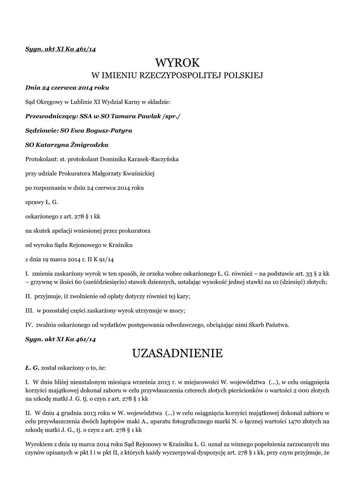 Sygn. akt XI Ka 461/14 WYROK W IMIENIU RZECZYPOSPOLITEJ POLSKIEJ Dnia 24 czerwca 2014 roku Sąd Okręgowy w Lublinie XI Wydział Karny w składzie: Przewodniczący: SSA w SO Tamara Pawlak /spr./ Sędziowie: SO Ewa Bogusz-Patyra SO Katarzyna Żmigrodzka Protokolant: st. protokolant Dominika Karasek-Raczyńska przy udziale Prokuratora Małgorzaty Kwaśnickiej po rozpoznaniu w dniu 24 czerwca 2014 roku sprawy Ł. G. oskarżonego z art. 278 § 1 kk na skutek apelacji wniesionej przez prokuratora od wyroku Sądu Rejonowego w Kraśniku z dnia 19 marca 2014 r. II K 91/14 I. zmienia zaskarżony wyrok w ten sposób, że orzeka wobec oskarżonego Ł. G. również – na podstawie art. 33 § 2 kk – grzywnę w ilości 60 (sześćdziesięciu) stawek dziennych, ustalając wysokość jednej stawki na 10 (dziesięć) złotych; II. przyjmuje, iż zwolnienie od opłaty dotyczy również tej kary; III. w pozostałej części zaskarżony wyrok utrzymuje w mocy; IV. zwalnia oskarżonego od wydatków postępowania odwoławczego, obciążając nimi Skarb Państwa. Sygn. akt XI Ka 461/14 UZASADNIENIE Ł. G. został oskarżony o to, że: I. W dniu bliżej nieustalonym miesiąca września 2013 r. w miejscowości W. województwa (...), w celu osiągnięcia korzyści majątkowej dokonał zaboru w celu przywłaszczenia czterech złotych pierścionków o wartości 2 000 złotych na szkodę matki J. G. tj. o czyn z art. 278 § 1 kk II. W dniu 4 grudnia 2013 roku w W. województwa (...) w celu osiągnięcia korzyści majątkowej dokonał zabioru w celu przywłaszczenia dwóch laptopów maki A., aparatu fotograficznego marki N. o łącznej wartości 1470 złotych na szkodę matki J. G., tj. o czyn z art. 278 § 1 kk Wyrokiem z dnia 19 marca 2014 roku Sąd Rejonowy w Kraśniku Ł. G. uznał za winnego popełnienia zarzucanych mu czynów opisanych w pkt I i w pkt II, z których każdy wyczerpywał dyspozycję art. 278 § 1 kk, przy czym przyjmuje, że czyny te zostały popełnione w krótkich odstępach czasu i w podobny sposób, stanowiąc ciąg przestępstw określonych w art. 91 § 1 kk i za to na podstawie art. 278 § 1 kk w zw. z art. 91 § 1 kk wymierzył mu karę 8 miesięcy pozbawienia wolności, której wykonanie na podstawie art. 69 § 1 i 2 kk oraz art. 70 § 2 kk warunkowo zawiesił na okres 3 lat tytułem próby oraz na mocy art. 73 § 2 kk oddał oskarżonego w okresie próby pod dozór kuratora; na mocy art. 72 § 2 kk zobowiązał oskarżonego do naprawienia wyrządzonej szkody poprzez zapłatę na rzecz pokrzywdzonej J. G. kwoty 2270 złotych w terminie 4 miesięcy od uprawomocnienia się wyroku; zwolnił oskarżonego z obowiązku ponoszenia kosztów sądowych, w tym opłaty sądowej, wydatkami zaś obciążył Skarb Państwa. Apelację od powyższego wyroku złożył prokurator. Na podstawie art. 425 § 1 i 2 oraz art. 444 kpk zaskarżył powyższy wyrok na niekorzyść oskarżonego w części dotyczącej orzeczenia o karze. Powołując się na art. 427 § 1 i 2 oraz art. 438 pkt 2 kpk zarzucił : obrazę przepisów postępowania, a mianowicie art. 335 § 1 kpk w zw. z art. 343 § 6 i 7 kpk polegającą na nieorzeczeniu wobec oskarżonego Ł. G. za zarzucane mu czyny z art. 278 § 1 kk grzywny w wymiarze 60 stawek dziennych, ustalając wysokość jednej stawki dziennej na kwotę 10 złotych, mimo uwzględnienia wniosku prokuratora o wydanie wyroku skazującego bez przeprowadzenia rozprawy w trybie art. 335 § kpk, podczas, gdy wniosek ten zawierał uzgodnioną uprzednio z oskarżonym propozycję orzeczenia grzywny we wskazanej wyżej wysokości, co miało niewątpliwie wpływ na treść zapadłego wyroku i skutkowało orzeczeniem kary odbiegającej od uzgodnień dokonanych pomiędzy oskarżycielem publicznym a oskarżonym. Stawiając opisane wyżej zarzuty na podstawie art. 437 kpk wniósł o: zmianę zaskarżonego wyroku poprzez orzeczenie wobec oskarżonego na podstawie art. 33 § 2 kk, oprócz kary pozbawienia wolności, również grzywny w wysokości 60 stawek dziennych ustalając wysokość jednej stawki dziennej na kwotę 10 złotych. Sąd Okręgowy zważył, co następuje: Apelacja prokuratora jest zasadna i zasługuje na uwzględnienie. W pierwszej kolejności należy stwierdzić, iż Sąd I instancji w sposób prawidłowy przeprowadził w niniejszej sprawie postępowanie, nie dopuszczając się istotnej, mogącej rzutować na treść wyroku obrazy przepisów postępowania, a w ich następstwie błędu w ustaleniach faktycznych. Sąd Rejonowy na podstawie całości zgromadzonego materiału dowodowego prawidłowo ustalił stan faktyczny i słusznie uznał winę oskarżonego w zakresie przypisanych mu czynów. Nie budzi także zastrzeżeń ocena prawna zachowań oskarżonego Ł. G.. Słusznie podnosi skarżący, iż Sąd Rejonowy dopuścił się obrazy przepisów postępowania, tj. art. 335 § 1 kpk w zw. z art. 343 § 6 i 7 kpk polegającej na nieorzeczeniu wobec oskarżonego Ł. G. kary z nim wcześniej uzgodnionej. Wskazać bowiem należy, iż w postępowaniu przygotowawczym prokurator w trybie art. 335 § 1 kpk uzgodnił z oskarżonym obok kary pozbawienia wolności grzywnę w wysokości 60 stawek dziennych po 10 złotych /k.40/, tymczasem Sąd wydając wyrok nie orzekł tej kary. Zaś zgodnie z art. 343 § 6 kpk sąd wydając wyrok jest związany treścią uzgodnień pomiędzy oskarżonym i prokuratorem, poczynionych na podstawie art. 335 § 1 kpk i nie może wydać innego wyroku niż skazujący i orzec innej kary lub środka karnego od uzgodnionych przez strony. Natomiast w razie uznania przez Sąd, że nie zachodzą podstawy do uwzględnienia wniosku, to zgodnie z art. 343 § 7 kpk sprawa podlega rozpoznaniu na zasadach ogólnych. W niniejszej sprawie Sąd rozstrzygał na posiedzeniu w trybie art. 335 § 1 kpk, a więc powinien orzec zgodnie z wnioskiem prokuratora i orzec obok kary pozbawienia wolności uzgodnioną wcześniej karę grzywny; uchybienie to zostało dostrzeżone przez Sąd w
