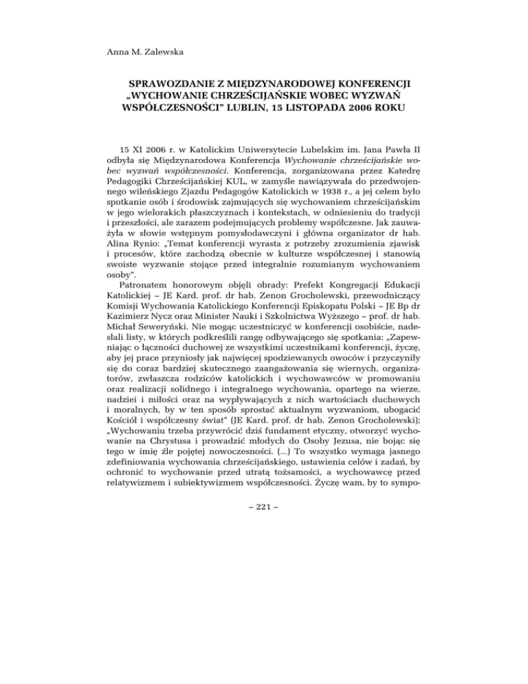 Anna M. Zalewska SPRAWOZDANIE Z MIčDZYNARODOWEJ KONFERENCJI „WYCHOWANIE CHRZEİCIJAĠSKIE WOBEC WYZWAĠ WSPÓĞCZESNOİCI” LUBLIN, 15 LISTOPADA 2006 ROKU 15 XI 2006 r. w Katolickim Uniwersytecie Lubelskim im. Jana Pawğa II odbyğa siĎ MiĎdzynarodowa Konferencja Wychowanie chrzeıcijaġskie wobec wyzwaġ wspóğczesnoıci. Konferencja, zorganizowana przez KatedrĎ Pedagogiki Chrzeıcijaġskiej KUL, w zamyıle nawiĂzywağa do przedwojennego wileġskiego Zjazdu Pedagogów Katolickich w 1938 r., a jej celem byğo spotkanie osób i ırodowisk zajmujĂcych siĎ wychowaniem chrzeıcijaġskim w jego wielorakich pğaszczyznach i kontekstach, w odniesieniu do tradycji i przeszğoıci, ale zarazem podejmujĂcych problemy wspóğczesne. Jak zauwaŃyğa w sğowie wstĎpnym pomysğodawczyni i gğówna organizator dr hab. Alina Rynio: „Temat konferencji wyrasta z potrzeby zrozumienia zjawisk i procesów, które zachodzĂ obecnie w kulturze wspóğczesnej i stanowiĂ swoiste wyzwanie stojĂce przed integralnie rozumianym wychowaniem osoby”. Patronatem honorowym objĎli obrady: Prefekt Kongregacji Edukacji Katolickiej – JE Kard. prof. dr hab. Zenon Grocholewski, przewodniczĂcy Komisji Wychowania Katolickiego Konferencji Episkopatu Polski – JE Bp dr Kazimierz Nycz oraz Minister Nauki i Szkolnictwa WyŃszego – prof. dr hab. Michağ Seweryġski. Nie mogĂc uczestniczyĄ w konferencji osobiıcie, nadesğali listy, w których podkreılili rangĎ odbywajĂcego siĎ spotkania: „ZapewniajĂc o ğĂcznoıci duchowej ze wszystkimi uczestnikami konferencji, ŃyczĎ, aby jej prace przyniosğy jak najwiĎcej spodziewanych owoców i przyczyniğy siĎ do coraz bardziej skutecznego zaangaŃowania siĎ wiernych, organizatorów, zwğaszcza rodziców katolickich i wychowawców w promowaniu oraz realizacji solidnego i integralnego wychowania, opartego na wierze, nadziei i miğoıci oraz na wypğywajĂcych z nich wartoıciach duchowych i moralnych, by w ten sposób sprostaĄ aktualnym wyzwaniom, ubogaciĄ Koıcióğ i wspóğczesny ıwiat” (JE Kard. prof. dr hab. Zenon Grocholewski); „Wychowaniu trzeba przywróciĄ dziı fundament etyczny, otworzyĄ wychowanie na Chrystusa i prowadziĄ mğodych do Osoby Jezusa, nie bojĂc siĎ tego w imiĎ Łle pojĎtej nowoczesnoıci. (…) To wszystko wymaga jasnego zdefiniowania wychowania chrzeıcijaġskiego, ustawienia celów i zadaġ, by ochroniĄ to wychowanie przed utratĂ toŃsamoıci, a wychowawcĎ przed relatywizmem i subiektywizmem wspóğczesnoıci. łyczĎ wam, by to sympo– 221 – zjum byğo dobrym poczĂtkiem naukowej i praktycznej rozmowy, tak bardzo potrzebnej wychowywanym i wychowawcom” (JE Bp dr Kazimierz Nycz); „Konferencja podejmuje niezwykle waŃny temat, czego smutnym dowodem sĂ ostatnie wydarzenia w polskich szkoğach. Widzimy postĎpujĂcy wzrost patologicznych zachowaġ wıród dzieci i mğodzieŃy, bĎdĂcy oznakĂ kryzysu funkcji wychowawczej szkoğy. OdpowiedziĂ powinno byĄ wychowanie dzieci i mğodzieŃy oparte na wartoıciach uniwersalnych, które w naszej europejskiej kulturze wywodzĂ siĎ z chrzeıcijaġstwa” (prof. dr hab. Michağ Seweryġski). W auli Kardynağa Stefana Wyszyġskiego KUL zgromadziğo siĎ ponad 400 osób: nauczycieli, wychowawców, rodziców i studentów pedagogiki, by wysğuchaĄ piĎciu wystĂpieġ w sesji przedpoğudniowej: Wychowanie w ıwietle Starego i Nowego Testamentu – ks. prof. dr hab. J. Bagrowicz (UMK), ByĄ wychowawcĂ dzisiaj: wyzwaniem dla ludzkoıci – prof. M. De Beni (Werona), W poszukiwaniu chrzeıcijaġskiej filozofii wychowania – ks. prof. dr hab. T. Guz (WZNPiE–KUL), Poznawcza wartoıĄ wychowania – prof. C. Esposito (Bari), Paradoks chrzeıcijaġskiej pedagogiki – ks. prof. dr hab. J. Tarnowski (UKSW). Po czĎıci plenarnej obrady kontynuowano w dziewiĎciu sekcjach tematycznych: W poszukiwaniu adekwatnej wizji wychowania chrzeıcijaġskiego (trzy sekcje), Istotne wymiary i pğaszczyzny wychowania chrzeıcijaġskiego, Wychowanie chrzeıcijaġskie w domu, w szkole i w Koıciele, Wychowanie poprzez pracĎ, teatr i media, Wychowanie poprzez uczestnictwo w koıcielnych ruchach religijnych i stowarzyszeniach (dwie sekcje), Wspóğczesny kontekst wychowania rozumianego jako droga do samego siebie. Ogóğem wystĂpiğo ponad 70 pedagogów z polskich (Lublin, Cieszyn, Katowice, Warszawa, ĞódŁ, Toruġ) i zagranicznych (Rzym, Florencja, Werona, Bari, RuŃemberok) oırodków naukowych. W czasie obrad uczestnicy wskazali na specyfikĎ wychowania chrzeıcijaġskiego opartego o personalistycznĂ wizjĎ czğowieka, podkreılajĂc jednoczeınie, Ńe jest to jedynie szkic, „mapa” wĂtków i pğaszczyzn, których z uwagi na szczupğoıĄ czasu nie dağo siĎ w sposób peğny wyjaıniĄ i przedyskutowaĄ. Jak w podsumowaniu stwierdziğa prof. Rynio: „Zadanie, jakie sobie postawiliımy, nie polegağo jedynie na dokğadnym opisie i dokumentowaniu wszystkich problemów, które stwarza rzetelne wychowanie chrzeıcijaġskie. Naszym celem byğa raczej próba sformuğowania zasadniczych wskazaġ dla wğaıciwej metody wychowawczej, która uwzglĎdniağaby miğoıĄ do prawdy, doıwiadczenie wiary Ńywej i rodzĂcej nadziejĎ, troskĎ o dobro wğasne i innych, przeŃycie wolnego wyboru, odpowiedzialnoıĄ, potrzebĎ posiadania wğasnej toŃsamoıci i wroıniĎcia w tradycjĎ, przy równoczesnym dowartoıciowaniu tego, co «tu i teraz»”. Wszyscy uczestnicy wyrazili potrzebĎ i chĎĄ kontynuowania tak waŃnej w obecnym czasie debaty. GratulujĂc organizatorom niezwykle owocnego – 222 – sympozjum, czekamy na jego dalszy ciĂg, a przede wszystkim na wydanie materiağów sympozjalnych, zawierajĂcych rozszerzone wersje wystĂpieġ. – 223 – – 224 –