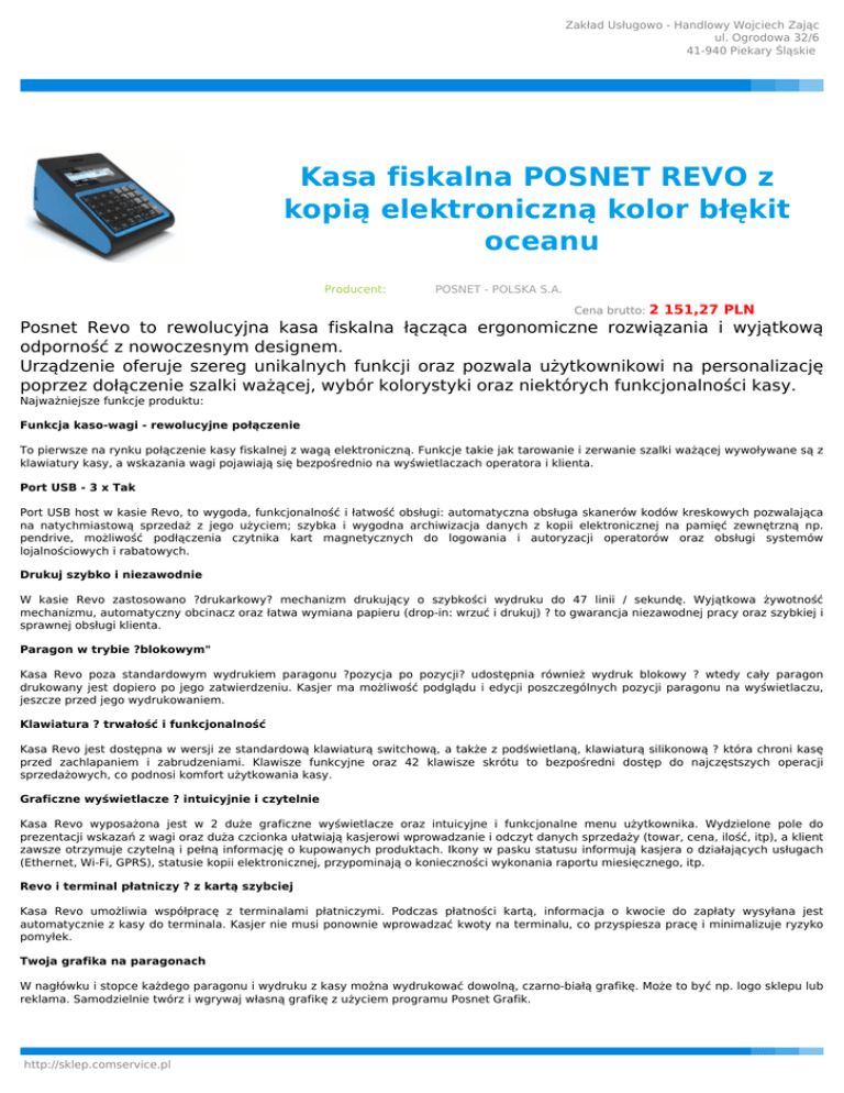 Zakład Usługowo - Handlowy Wojciech Zając ul. Ogrodowa 32/6 41-940 Piekary Śląskie Kasa fiskalna POSNET REVO z kopią elektroniczną kolor błękit oceanu Producent: POSNET - POLSKA S.A. Cena brutto: 2 151,27 PLN Posnet Revo to rewolucyjna kasa fiskalna łącząca ergonomiczne rozwiązania i wyjątkową odporność z nowoczesnym designem. Urządzenie oferuje szereg unikalnych funkcji oraz pozwala użytkownikowi na personalizację poprzez dołączenie szalki ważącej, wybór kolorystyki oraz niektórych funkcjonalności kasy. Najważniejsze funkcje produktu: Funkcja kaso-wagi - rewolucyjne połączenie To pierwsze na rynku połączenie kasy fiskalnej z wagą elektroniczną. Funkcje takie jak tarowanie i zerwanie szalki ważącej wywoływane są z klawiatury kasy, a wskazania wagi pojawiają się bezpośrednio na wyświetlaczach operatora i klienta. Port USB - 3 x Tak Port USB host w kasie Revo, to wygoda, funkcjonalność i łatwość obsługi: automatyczna obsługa skanerów kodów kreskowych pozwalająca na natychmiastową sprzedaż z jego użyciem; szybka i wygodna archiwizacja danych z kopii elektronicznej na pamięć zewnętrzną np. pendrive, możliwość podłączenia czytnika kart magnetycznych do logowania i autoryzacji operatorów oraz obsługi systemów lojalnościowych i rabatowych. Drukuj szybko i niezawodnie W kasie Revo zastosowano ?drukarkowy? mechanizm drukujący o szybkości wydruku do 47 linii / sekundę. Wyjątkowa żywotność mechanizmu, automatyczny obcinacz oraz łatwa wymiana papieru (drop-in: wrzuć i drukuj) ? to gwarancja niezawodnej pracy oraz szybkiej i sprawnej obsługi klienta. Paragon w trybie ?blokowym" Kasa Revo poza standardowym wydrukiem paragonu ?pozycja po pozycji? udostępnia również wydruk blokowy ? wtedy cały paragon drukowany jest dopiero po jego zatwierdzeniu. Kasjer ma możliwość podglądu i edycji poszczególnych pozycji paragonu na wyświetlaczu, jeszcze przed jego wydrukowaniem. Klawiatura ? trwałość i funkcjonalność Kasa Revo jest dostępna w wersji ze standardową klawiaturą switchową, a także z podświetlaną, klawiaturą silikonową ? która chroni kasę przed zachlapaniem i zabrudzeniami. Klawisze funkcyjne oraz 42 klawisze skrótu to bezpośredni dostęp do najczęstszych operacji sprzedażowych, co podnosi komfort użytkowania kasy. Graficzne wyświetlacze ? intuicyjnie i czytelnie Kasa Revo wyposażona jest w 2 duże graficzne wyświetlacze oraz intuicyjne i funkcjonalne menu użytkownika. Wydzielone pole do prezentacji wskazań z wagi oraz duża czcionka ułatwiają kasjerowi wprowadzanie i odczyt danych sprzedaży (towar, cena, ilość, itp), a klient zawsze otrzymuje czytelną i pełną informację o kupowanych produktach. Ikony w pasku statusu informują kasjera o działających usługach (Ethernet, Wi-Fi, GPRS), statusie kopii elektronicznej, przypominają o konieczności wykonania raportu miesięcznego, itp. Revo i terminal płatniczy ? z kartą szybciej Kasa Revo umożliwia współpracę z terminalami płatniczymi. Podczas płatności kartą, informacja o kwocie do zapłaty wysyłana jest automatycznie z kasy do terminala. Kasjer nie musi ponownie wprowadzać kwoty na terminalu, co przyspiesza pracę i minimalizuje ryzyko pomyłek. Twoja grafika na paragonach W nagłówku i stopce każdego paragonu i wydruku z kasy można wydrukować dowolną, czarno-białą grafikę. Może to być np. logo sklepu lub reklama. Samodzielnie twórz i wgrywaj własną grafikę z użyciem programu Posnet Grafik. http://sklep.comservice.pl Zakład Usługowo - Handlowy Wojciech Zając ul. Ogrodowa 32/6 41-940 Piekary Śląskie NIP nabywcy z kontrolą kwoty paragonu Kasa Revo umożliwia wydruk NIP nabywcy na paragonie. Dodatkowo można zaprogramować maksymalną kwotę paragonu, przy której NIP klienta będzie drukowany. Według obecnych przepisów NIP nabywcy drukujemy na paragonach o wartości do 450 zł lub 100 euro. Revo przypomina Nowa funkcja pozwala, aby użytkownik sam zdecydował o czym kasa ma przypominać. We wskazanym czasie Revo wydrukuje lub wyświetli komunikat i przypomni o ważnej sprawie, np. konieczności wykonania raportu miesięcznego, dniu płatności podatku, czy urodzinach kierowniczki. Multikomunikacja Kasa Revo umożliwia jednoczesne korzystanie z dostępnych interfejsów Ethernet, WiFi i GPRS oraz realizowanie wielu połączeń równolegle. Taka swoboda konfiguracji kasy Revo umożliwia: 5 połączeń PC (z własnym dostępem do bufora pozycji) do dyspozycji programów magazynowych, serwisowych, itp., zdalną archiwizację kopii elektronicznej i pamięci podręcznej, wysyłanie danych do systemów wideomonitoringu oraz systemów lojalnościowo-rabatowych, tunelowanie portów COM na potrzeby systemów zewnętrznych. Szczególnie polecana dla: sklepów i supermarketów spożywczo-przemysłowe sklepów drogeryjno-kosmetyczne piekarni i cukierni lokali gastronomicznych, fast-food itp. butików różnorakich sklepów: mięsno-wędliniarskich, monopolowych, pasmanterii, jubilerskich lokali usługowych Tabela cech Urządzenia z kopią elektroniczną paragonu Tak Informatyczny Nośnik Danych Karta 4GB SD/SDHC Eurofiskalizacja Możliwość zaprogramowania dowolnej waluty, w jakiej moduł fiskalny będzie rejestrował sprzedaż Stawki VAT 7 (A...G) Liczba PLU 10 000 / 15 000 (opcja) Nazwa towarów 40 znaków Dodatkowe kody kreskowe 12 000 Max. liczba kodów do PLU 20 Zestawy towarów / wielopaki 6 000 Notatnik 1 000 PLU Kasjerzy 16 Opakowania 65 Formy płatności 35 w tym 20 walut Rabaty / narzuty 35 Rabaty czasowe 8 Jednostki miary 10 Klawisze skrótu 42 (3x14) Grupy towarowe 100 Formaty kodów ważonych 10 Opisy wpłat / wypłat 10 http://sklep.comservice.pl Zakład Usługowo - Handlowy Wojciech Zając ul. Ogrodowa 32/6 41-940 Piekary Śląskie Opisy towarów 50 Obsługa błędów 20 Kwity parkingowe Brak Bufor pozycji paragonowych 20 000 Typ mechanizmu drukującego 1 termiczny typu "drop-in - wrzuć i drukuj" L