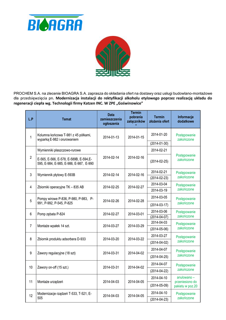 PROCHEM S.A. na zlecenie BIOAGRA S.A. zaprasza do składania ofert na dostawy oraz usługi budowlano-montażowe dla przedsięwzięcia pn. Modernizacja instalacji do rektyfikacji alkoholu etylowego poprzez realizację układu do regeneracji ciepła wg. Technologii firmy Katzen INC. W ZPE „Goświnowice” L.P 1 Temat Kolumna końcowa T-981 z 45 półkami, wyparką E-982 i orurowaniem Data zamieszczenia ogłoszenia Termin pobrania załączników * 2014-01-13 2014-01-15 Termin złożenia ofert Informacje dodatkowe 2014-01-20 Postępowanie zakończone (2014-01-30) Wymienniki płaszczowo-rurowe 2014-02-21 2 E-565, E-566, E-578, E-589B, E-594,E595, E-984, E-985, E-986, E-987, E-990 2014-02-14 2014-02-16 3 Wymiennik płytowy E-593B 2014-02-14 2014-02-16 4 Zbiorniki operacyjne TK – 835 AB 2014-02-25 2014-02-27 5 Pompy wirowe P-836, P-980, P-983, P991, P-992, P-545, P-825 2014-02-26 2014-02-28 6 Pomp zębata P-824 2014-02-27 2014-03-01 7 Montaże wpałek 14 szt. 2014-03-27 2014-03-29 8 Zbiornik produktu adsorbera D-933 2014-03-20 2014-03-22 9 Zawory regulacyjne (18 szt) 2014-03-31 2014-04-02 10 Zawory on-off (15 szt.) 2014-03-31 2014-04-02 11 Montaże urządzeń 2014-04-03 2014-04-05 12 Modernizacje rządzeń T-533, T-521, E505 2014-04-03 2014-04-05 (2014-02-25) 2014-02-21 (2014-02-23) 2014-03-04 2014-03-19 2014-03-05 (2014-03-17) 2014-03-06 (2014-04-07) 2014-04-03 (2014-05-06) 2014-03-27 (2014-04-02) 2014-04-07 (2014-04-25) 2014-04-07 (2014-04-22) 2014-04-10 (2014-05-09) 2014-04-10 (2014-04-23) Postępowanie zakończone Postępowanie zakończone Postępowanie zakończone Postępowanie zakończone Postępowanie zakończone Postępowanie zakończone Postępowanie zakończone Postępowanie zakończone Postępowanie zakończone anulowano – przeniesiono do pakietu w poz.20 Postępowanie zakończone 2014-04-25 Postępowanie zakończone 13 System DCS I Systemy rozliczeniowe 2014-04-18 2014-04-20 14 Dostawy i montże PiA 2014-04-18 2014-04-20 15 Modernizacja zbiornika TK-806 2014-04-24 2014-04-26 16 Beer Preheater ED -553 2014-04-28 2014-04-30 17 Pompy wirowe P-410, P-2513 2014-04-24 2014-04-26 18 Izolacja urządzeń 2014-05-15 2014-05-17 19 Zawory bezpieczeństwa 2014-05-15 2014-05-17 20 Montaże orurowania i urządzeń 2014-05-15 2014-05-17 21 Konstrukcje stalowe pod wymienniki E595 E-990 2014-05-15 2014-05-17 22 Dodatkowe schody na TK-835 2014-05-15 2014-05-17 23 Modernizacje pomp P-519, P-530, P-588 2014-06-12 2014-06-13 2017-07-15 Postępowanie zakończone 24 Instalacje elektryczne 2014-06-24 2014-06-26 2014-07-03 Postępowanie zakończone 25 Detektor etanolu 2014-06-25 2014-06-27 2014-07-02 Postępowanie zakończone 26 Zabezpieczenie p.poż 2014-07-03 2014-07-05 2014-07-10 Postępowanie zakończone 27 Przebudowa zewnętrznych instalacji elektroenergetycznych oraz przebudowa zewnętrznych instalacji telekomunikacyjnych 2014-03-19 2014-03-21 2014-03-24 (2014-03-25) Postępowanie zakończone 28 Roboty żelbetowe na obiektach: E-02,02,18a oraz zabezpieczenie ppoż. (ściany ogniowe na ob.E-02,02), rury ochronne na kanalizacjach w fundamencie E-02 2014-04-25 2014-04-27 2014-04-30 (2014-05-08) Postępowanie zakończone 29 Demontaże instalacji pożarniczych w obiektach: 2A-F oraz 18/A, rozwiązania tymczasowe 2014-05-22 2014-05-22 2014-05-23 Postępowanie zakończone 30 Wykonanie, zabezpieczenie antykorozyjne, dostawa oraz montaż konstrukcji stalowej na obiektach nr: E-02, 02, 03 2014-04-25 2014-04-27 2014-05-08 Postępowanie zakończone 31 Wykonanie Instalacji cieplnowentylacyjnej w ob. E-06 2014-06-20 2014-06-22 2014-06-25 (2014-07-08) Postępowanie zakończone (2014-05-21) 2014-04-25 (2014-06-02) 2014-05-01 (2014-06-13) 2014-05-05 (2014-05-07) 2014-05-01 (2014-06-25) 2014-05-22 (2014-07-01) 2014-05-22 (2014-06-03) 2014-05-22 (2014-06-10) 2014-05-22 (2014-06-02) 2014-05-22 2014-06-03 Postępowanie zakończone Postępowanie zakończone Postępowanie zakończone Postępowanie zakończone Postępowanie zakończone Postępowanie zakończone Postępowanie zakończone Postępowanie zakończone Postępowanie zakończone 32 Roboty żelbetowe ob. 03 2014-04-25 2014-04-27 2014-07-02 Postępowanie zakończone 33 Montaż detektorów etanolu 2014-06-02 2014-06-04 2014-06-09 Postępowanie zakończone 34 Wieża chłodnicza CT-1401D 2014-07-17 2014-07-19 2014-07-31 35 Dodatkowe PiA - układ regulacji przepływu 2014-07-21 2014-07-24 2014-07-30 36 Manowakuometry 2014-08-18 2014-08-21 2014-08-25 37 System poboru próbek 2014-08-13 2014-08-18 2014-08-18 38 Mechanizm podnoszenia górnej i dolnej pokrywy 2014-08-19 2014-08-22 2014-08-25 (2014-08-27) 39 Dodatkowa armatura -15 szt. 2014-08-22 2014-08-27 2014-08-27 40 Zawór on off XV-803-3 2014-08-25 2014-08-28 2014-08-26 (2014-08-29) 41 Dodatkowe orurowanie 2014-08-25 2014-08-28 2014-08-27 (2014-08-29) 42 Zawór on off XV-820-4 2014-09-01 2014-09-03 2014-09-02 43 Dodatkowe roboty elektryczne 2014-09-01 2014-09-03 2014-09-02 44 Dodatkowe PiA oraz system DCS 2014-08-28 2014-09-01 2014-08-29 45 Dodatkowy montaż rurociągów - Króciec kolumny T-533 2014-08-25 2014-08-28 2014-09-02 46 Konstrukcje wsporcze pod ED-553 2014-08-25 2014-08-28 2014-09-02 47 Sygnalizatory ciśnienia i poziomu dostawa kabla iskrobezpiecznego 2014-09-08 2014-09-11 2014-09-16 48 Armatura 7 szt 20147-09-03 2014-09-07 2014-09-12 49 Zawory 22 szt 2014-09-01 2014-09-03 2014-09-10 50 Woda chłodnicza pomp 2014-09-17 2014-09-22 2014-09-29 51 Ogrzewanie elektryczne-instalacja zasilania 2014-09-17 2014-09-22 2014-09-29 52 Ogrzewanie elektryczne-rurociagi 2014-09-24 2014-09-26 2014-09-30 53 KOLUMNY Z WYPARKAMI T-905, E-906,T-918, E-915, T-931, E-935, E-936 2014-10-30 2014-11-10 (2014-12-05) 2014-11-24 2014-12-03 (2014-12-05) 2014-11-25 2014-12-04 (2014-02-09) 2014-11-25 2014-12-04 (2014-04-28) 54 55 56 WYMIENNIKI PŁASZCZOWO RUROWE E-904, E-907, E-909, E-916, E-919, E920, E-921, E-932, E-933, E-939 ZBIORNIKI D-954, TK-911 Z MIESZADŁEM AG-912, TK-923 Z MIESZADŁEM AG-924, TK-971 POMPA ZĘBATA I ETAP: P-82