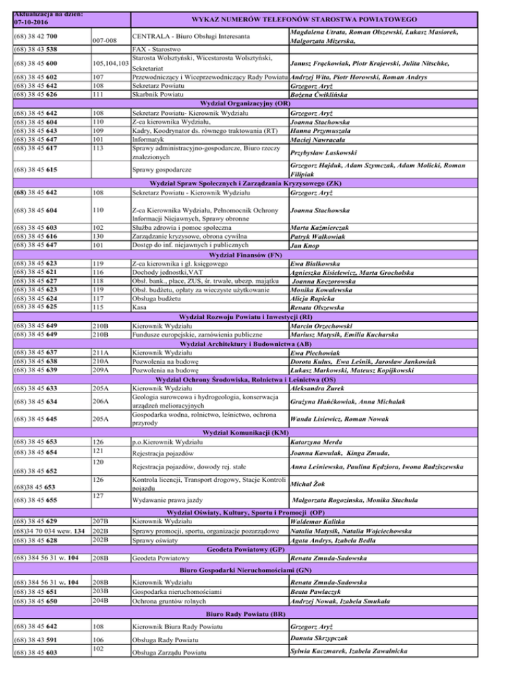 Aktualizacja na dzień: 07-10-2016 (68) 38 42 700 WYKAZ NUMERÓW TELEFONÓW STAROSTWA POWIATOWEGO 007-008 (68) 38 43 538 (68) 38 45 600 105,104,103 (68) 38 45 602 (68) 38 45 642 (68) 38 45 626 107 108 111 (68) 38 45 642 (68) 38 45 604 (68) 38 45 643 (68) 38 45 647 (68) 38 45 617 108 110 109 101 113 (68) 38 45 615 CENTRALA - Biuro Obsługi Interesanta FAX - Starostwo Starosta Wolsztyński, Wicestarosta Wolsztyński, Janusz Frąckowiak, Piotr Krajewski, Julita Nitschke, Sekretariat Przewodniczący i Wiceprzewodniczący Rady Powiatu Andrzej Wita, Piotr Horowski, Roman Andrys Sekretarz Powiatu Grzegorz Aryż Skarbnik Powiatu Bożena Ćwiklińska Wydzial Organizacyjny (OR) Sekretarz Powiatu- Kierownik Wydziału Grzegorz Aryż Z-ca kierownika Wydziału, Joanna Stachowska Kadry, Koodrynator ds. równego traktowania (RT) Hanna Przymuszała Informatyk Maciej Nawracała Sprawy administracyjno-gospodarcze, Biuro rzeczy Przybysław Laskowski znalezionych Grzegorz Hajduk, Adam Szymczak, Adam Molicki, Roman Sprawy gospodarcze Filipiak Wydział Spraw Społecznych i Zarządzania Kryzysowego (ZK) Sekretarz Powiatu - Kierownik Wydziału Grzegorz Aryż (68) 38 45 642 108 (68) 38 45 604 110 (68) 38 45 603 (68) 38 45 616 (68) 38 45 647 102 130 101 Z-ca Kierownika Wydziału, Pełnomocnik Ochrony Informacji Niejawnych, Sprawy obronne Służba zdrowia i pomoc społeczna Zarządzanie kryzysowe, obrona cywilna Dostęp do inf. niejawnych i publicznych (68) 38 45 623 (68) 38 45 621 (68) 38 45 627 (68) 38 45 623 (68) 38 45 624 (68) 38 45 625 119 116 118 119 117 115 Wydział Finansów (FN) Z-ca kierownika i gł. księgowego Dochody jednostki,VAT Obsł. bank., płace, ZUS, śr. trwałe, ubezp. majątku Obsł. budżetu, opłaty za wieczyste użytkowanie Obsługa budżetu Kasa (68) 38 45 649 (68) 38 45 649 210B 210B (68) 38 45 637 (68) 38 45 638 (68) 38 45 639 211A 210A 209A (68) 38 45 633 205A (68) 38 45 634 206A (68) 38 45 645 205A (68) 38 45 653 126 121 (68) 38 45 654 120 (68) 38 45 652 126 (68)38 45 653 (68) 38 45 655 127 (68) 38 45 629 (68)34 70 034 wew. 134 (68) 38 45 628 207B 202B 202B (68) 384 56 31 w. 104 208B Magdalena Utrata, Roman Olszewski, Łukasz Masiorek, Małgorzata Mizerska, Joanna Stachowska Marta Kaźmierczak Patryk Walkowiak Jan Knop Ewa Białkowska Agnieszka Kisielewicz, Marta Grocholska Joanna Koczorowska Monika Kowalewska Alicja Rapicka Renata Olszewska Wydział Rozwoju Powiatu i Inwestycji (RI) Kierownik Wydziału Marcin Orzechowski Fundusze europejskie, zamówienia publiczne Mariusz Matysik, Emilia Kucharska Wydział Architektury i Budownictwa (AB) Kierownik Wydziału Ewa Piechowiak Pozwolenia na budowę Dorota Kulus, Ewa Leśnik, Jarosław Jankowiak Pozwolenia na budowę Łukasz Markowski, Mateusz Kopijkowski Wydział Ochrony Środowiska, Rolnictwa i Leśnictwa (OS) Kierownik Wydziału Aleksandra Żurek Geologia surowcowa i hydrogeologia, konserwacja Grażyna Hańćkowiak, Anna Michalak urządzeń melioracyjnych Gospodarka wodna, rolnictwo, leśnictwo, ochrona Wanda Lisiewicz, Roman Nowak przyrody Wydział Komunikacji (KM) p.o.Kierownik Wydziału Katarzyna Merda Rejestracja pojazdów Joanna Kawulak, Kinga Zmuda, Rejestracja pojazdów, dowody rej. stałe Anna Leśniewska, Paulina Kędziora, Iwona Radziszewska Kontrola licencji, Transport drogowy, Stacje Kontroli Michał Żok pojazdu Wydawanie prawa jazdy Małgorzata Rogozinska, Monika Stachuła Wydział Oświaty, Kultury, Sportu i Promocji (OP) Kierownik Wydziału Waldemar Kalitka Natalia Matysik, Natalia Wojciechowska Sprawy promocji, sportu, organizacje pozarządowe Agata Andrys, Izabela Bedła Sprawy oświaty Geodeta Powiatowy (GP) Geodeta Powiatowy Renata Zmuda-Sadowska Biuro Gospodarki Nieruchomościami (GN) (68) 384 56 31 w. 104 (68) 38 45 651 (68) 38 45 650 208B 203B 204B Kierownik Wydziału Gospodarka nieruchomościami Ochrona gruntów rolnych Renata Zmuda-Sadowska Beata Pawlaczyk Andrzej Nowak, Izabela Smukała Biuro Rady Powiatu (BR) (68) 38 45 642 (68) 38 43 591 (68) 38 45 603 108 106 102 Kierownik Biura Rady Powiatu Grzegorz Aryż Obsługa Rady Powiatu Danuta Skrzypczak Obsługa Zarządu Powiatu Sylwia Kaczmarek, Izabela Zawalnicka Biuro do spraw kontroli (KZ) (68)38 45 646 (68)38 45 646 (68) 38 45 601 (68) 38 45 644 (68) 38 42 622 (68) 38 45 607 (68) 38 45 605 (II p.) (68) 347 13 68 (II p.) 129 129 009 001 004 006 203 A 204 A Kierownik Biura do spraw kontroli Katarzyna Kałdońska Stanowisko do spraw kontroli Ewa Zielińska Powiatowy Ośrodek Dokumentacji Geodezyjnej i Kartograficznej (GK) Dariusz Formaniewicz Izabela Jankowska, Marzena Zewar Irena Weihs, Aneta Nitschka, Patryk Piosik Marek Lewandowski, Joanna Lenz-Rabiega, Sprzedaż map, wydawanie wypisów z EGiB Ewa Sieradzka Koordynacja usytuowania sieci uzbrojenia Anna Stempin, Marek Prządka Alicja Weiss, Anna Jankowska, Ewidencja gruntów i budynków Joanna Milanowska, Barbara Guś Powiatowy Zespół ds. Orzekania o Niepełnosprawności (ON) Kierownik Ośrodka Stanowisko mapy numerycznej GOE-INFO Prowadzenie zasobu geodez. i kartograf. (68) 38 45 620 017 Przewodniczący Zespołu Krzysztof Kuźnicki (68) 38 45 642 (68) 38 45 614 108 031-032 Sekretarz Zespołu Obsługa Zespołu Agnieszka Piskorz, Katarzyna Frąk, Diana Nowak (68) 38 45 606 112 Radca prawny Grzegorz Aryż Obsługa Radców Prawnych Kamila Ławecka-Smolarek, Anna Maluśka Samodzielne stanowiska (68) 38 45 618 Asystent (AZ) Powiatowy Rzecznik Konsumentów (RK) (68) 38 45 620 206B 017 (68) 38 45 613 (68) 384 56 22 w.101 (68) 38 45 612 013 014 015 Katarzyna Łuczak Krzysztof Kuźnicki Powiatowe Centrum Pomocy Rodzinie Dyrektor Anna Białek, Główna księgowa, Realizacja świadczeń Gabriela Wacławik, Monika Bieszczat Osoby niepełnosprawne Justyna Gessner, Bożena Lisiecka-Abramuk (68) 38 45 611 035 034,033 Salka Narad PCPR (68) 38 43 631 (68) 384 2015 w 115 (68) 38 43 838 (68) 38 42 188 (68) 384 20 82 w. 182 (68) 38 42 395 (68) 38 43 502 (68) 38 41 520 (68) 38 45 630 (68) 38 45 657 (68) 38 45 656 tel/fax (68) 38 4