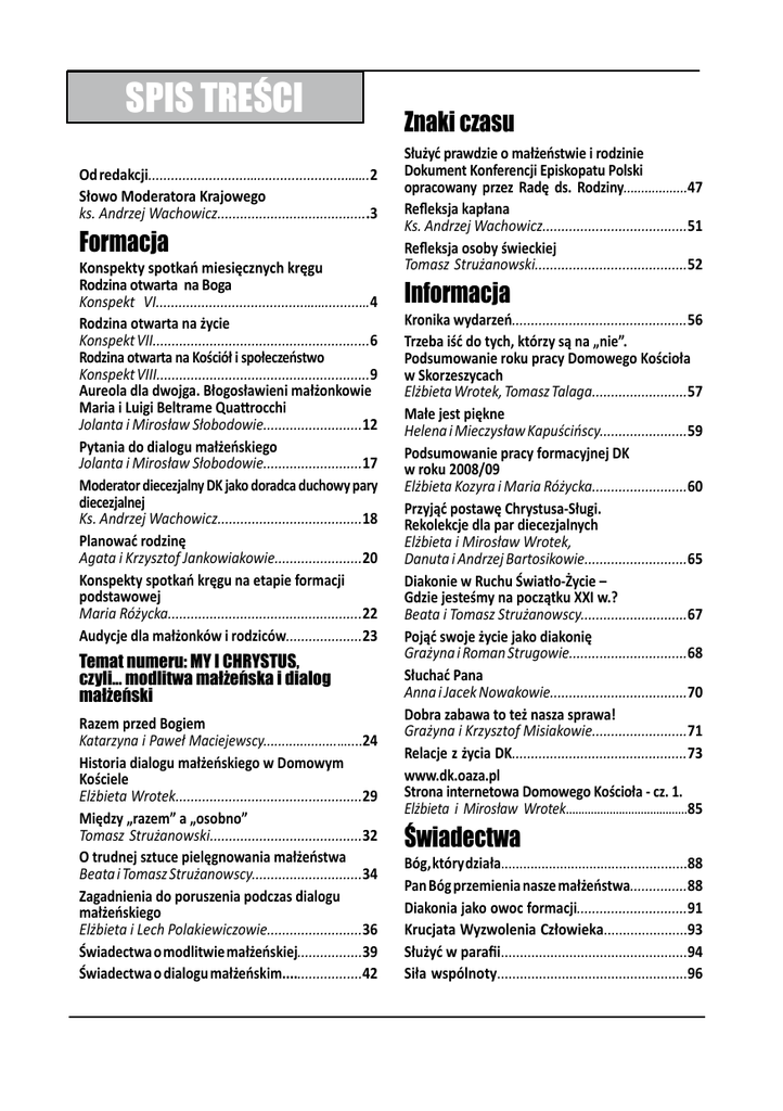SPIS TREŚCI Od redakcji..........................….......................…….2 Słowo Moderatora Krajowego ks. Andrzej Wachowicz........................................3 Formacja Konspekty spotkań miesięcznych kręgu Rodzina otwarta na Boga Konspekt VI.......................................…….........…4 Rodzina otwarta na życie Konspekt VII.........................................................6 Rodzina otwarta na Kościół i społeczeństwo Konspekt VIII........................................................9 Aureola dla dwojga. Błogosławieni małżonkowie Maria i Luigi Beltrame Quattrocchi Jolanta i Mirosław Słobodowie..........................12 Pytania do dialogu małżeńskiego Jolanta i Mirosław Słobodowie..........................17 Moderator diecezjalny DK jako doradca duchowy pary diecezjalnej Ks. Andrzej Wachowicz......................................18 Planować rodzinę Agata i Krzysztof Jankowiakowie.......................20 Konspekty spotkań kręgu na etapie formacji podstawowej Maria Różycka...................................................22 Audycje dla małżonków i rodziców....................23 Temat numeru: MY I CHRYSTUS, czyli… modlitwa małżeńska i dialog małżeński Razem przed Bogiem Katarzyna i Paweł Maciejewscy....................…....24 Historia dialogu małżeńskiego w Domowym Kościele Elżbieta Wrotek.................................................29 Między „razem” a „osobno” Tomasz Strużanowski........................................32 O trudnej sztuce pielęgnowania małżeństwa Beata i Tomasz Strużanowscy.............................34 Zagadnienia do poruszenia podczas dialogu małżeńskiego Elżbieta i Lech Polakiewiczowie.........................36 Świadectwa o modlitwie małżeńskiej.................39 Świadectwa o dialogu małżeńskim.....................42 Znaki czasu Służyć prawdzie o małżeństwie i rodzinie Dokument Konferencji Episkopatu Polski opracowany przez Radę ds. Rodziny..................47 Refleksja kapłana Ks. Andrzej Wachowicz......................................51 Refleksja osoby świeckiej Tomasz Strużanowski........................................52 Informacja Kronika wydarzeń..............................................56 Trzeba iść do tych, którzy są na „nie”. Podsumowanie roku pracy Domowego Kościoła w Skorzeszycach Elżbieta Wrotek, Tomasz Talaga.........................57 Małe jest piękne Helena i Mieczysław Kapuścińscy.......................59 Podsumowanie pracy formacyjnej DK w roku 2008/09 Elżbieta Kozyra i Maria Różycka.........................60 Przyjąć postawę Chrystusa-Sługi. Rekolekcje dla par diecezjalnych Elżbieta i Mirosław Wrotek, Danuta i Andrzej Bartosikowie...........................65 Diakonie w Ruchu Światło-Życie – Gdzie jesteśmy na początku XXI w.? Beata i Tomasz Strużanowscy............................67 Pojąć swoje życie jako diakonię Grażyna i Roman Strugowie...............................68 Słuchać Pana Anna i Jacek Nowakowie....................................70 Dobra zabawa to też nasza sprawa! Grażyna i Krzysztof Misiakowie.........................71 Relacje z życia DK..............................................73 www.dk.oaza.pl Strona internetowa Domowego Kościoła - cz. 1. Elżbieta i Mirosław Wrotek.......................................85 Świadectwa Bóg, który działa..................................................88 Pan Bóg przemienia nasze małżeństwa...............88 Diakonia jako owoc formacji.............................91 Krucjata Wyzwolenia Człowieka......................93 Służyć w parafii.................................................94 Siła wspólnoty..................................................96 Drodzy Czytelnicy! Zaledwie miesiąc po tym, jak do Waszych rąk trafił numer specjalny, poświęcony w całości siostrze Jadwidze Skudro, znowu za pośrednictwem „Listu” gościmy w Waszych domach i rodzinach. Przychodzimy, aby Wam służyć. Przynosimy pokaźną garść tekstów, które z różnych stron dotykają rzeczywistości Domowego Kościoła. W szczególny sposób zachęcamy do lektury artykułów z działu „Formacja”. Zgodnie z przyjętym planem, tym razem w „temacie numeru” wzięliśmy pod lupę relację małżonkowie-Chrystus, czyli – przekładając to na płaszczyznę zobowiązań – modlitwę małżeńską i dialog małżeński. W bieżącym numerze znajdziecie artykuły i świadectwa oświetlające z różnych stron radości i trudności związane z ich wypełnianiem. Zachęcamy do przyjrzenia się (a może „wypróbowania” w najbliższym czasie?) szczegółowo opracowanej propozycji dialogu małżeńskiego. Koniecznie przeczytajcie też rozważanie o duchowości błogoslawionych malżonkow Marii i Luigi Beltrame Quatrocchi – pierwszej pary małżeńskiej zaliczonej przez Kościół w poczet błogosławionych ze względu na przykład ich wspólnego życia. W dziale „Znaki czasu” pochylamy się nad niezwykle ważnym dokumentem, wydanym w sierpniu ubieglego roku przez Konferencję Episkopatu Polski, zatytułowanym „Służyć prawdzie o małżeństwie i rodzinie”. Chcemy Was zainspirować do lektury tego dokumentu (jeśli tego jeszcze nie zrobiliście, to warto, a nawet trzeba go przeczytać i rozważyć!), a zarazem pokusić się o próbę odpowiedzi, co nowego odkrywa on dla nas, członków Domowego Kościoła. Do działów ,,Z życia DK” oraz ,,Świadectwa” wpłynęło bardzo dużo cennych tekstów. Niestety, z braku miejsca z żalem musieliśmy zrezygnować z wielu wartościowych artykułów i świadectw. Przepraszamy Autorów, którzy włożyli wiele trudu w pisanie (sami dobrze wiemy, ile to kosztuje w warunkach codzienności...), a teraz nie mogą ujrzeć swoich tekstów w druku. Po namyśle postanowiliśmy umieścić je na stronie internetowej DK (www. dk.oaza.pl), aby zachowały swą aktualność. Z drugiej str