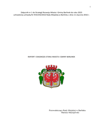 1 Załącznik nr 1 do Strategii Rozwoju Miasta i Gminy Barlinek do roku 2023 uchwalonej uchwałą Nr XVII/243/2016 Rady Miejskiej w Barlinku z dnia 11 stycznia 2016 r. RAPORT I DIAGNOZA STANU MIASTA I GMINY BARLINEK Przewodniczący Rady Miejskiej w Barlinku Mariusz Maciejewski 2 Spis treści A. B. C. D. E. F. G. H. I. J. Kapitał społeczny, społeczny klimat rozwoju .................................................................. 3 Przywództwo ................................................................................................................ 15 Zasoby środowiska naturalnego ................................................................................... 25 Zasoby pracy ………………………………………………………………………….34 Teren i korzyści miejsca ................................................................................................. 43 Potencjał gospodarczy................................................................................................... 56 Kapitał finansowy /inwestycyjny/ ................................................................................. 65 Poziom nauki, techniki, kultury ..................................................................................... 65 Zainwestowanie infrastrukturalne ................................................................................ 69 DIAGNOZA ..................................................................................................................... 80 3 A. Kapitał społeczny, społeczny klimat rozwoju. Liczba organizacji pozarządowych i zmiany, liczba członków organizacji pozarządowych i zmiany, nagrody i wyróżnienia dla organizacji pozarządowych - krajowe i lokalne, liczba spotkań dyskusyjnych w roku, liczba i czytelnictwo prasy lokalnej, poruszana tematyka na łamach prasy lokalnej, ilość lokalnych organizacji biznesowych, ilość spotkań w roku samorząd – organizacje pozarządowe, ilość spotkań w roku samorząd – środowiska biznesu, ilość spotkań w roku organizacje pozarządowe – środowiska biznesu, wymienić opracowane i aktualne strategie rozwoju w samorządzie, organizacjach pozarządowych, firmach i organizacjach biznesowych, Jaki jest poziom uczestnictwa naszej społeczności w dialogu publicznym? Jakie są relacje pomiędzy grupami, organizacjami i administracją? Jaki jest charakter grup formalnych i nieformalnych? Formy komunikacji władza lokalna mieszkańcy, władza - organizacje pozarządowe i biznes, wspólne inicjatywy i akcje organizacji i samorządu. Stopień centralizacji i decentralizacji instytucji. Obywatelskie akcje edukacyjne, petycyjne, inwestycyjne. Mapa aktywności: Baza danych organizacji pozarządowych działających na terenie Gminy Barlinek, sporządzona na podstawie informacji dostarczanych przez organizacje pozarządowe w formie pisemnego zgłoszenia. Lp Nazwa organizacji Zakres działalności /cel/ Pola działań: 1. Akademia Sportów Walki BORAN TEAM Barlinecki Klub Abstynenta Stowarzyszenie Zarejestrowane Barlinecki Klub Artystów Nieprofesjonalnych BA-KAN Upowszechnianie i rozwijanie rekreacji fizycznej, sportu i turystyki Barlineckie Towarzystwo Polsko – Niemieckie Barlineccy Sympatycy Piłki Siatkowej 23. Barlinecka Drużyna Harcerska „Leśni” Hufiec Myślibórz Chorągiew Zachodniopomorska ZHP Podtrzymanie kontaktów partnerskich ze Schneverdingen, pomoc w znalezieniu partnerów dla innych organizacji. Propagowanie sportu, a w szczególności piłki siatkowej. Wg Statutu ZHP. 2. 3. 4. 5. 6. Propagowanie trzeźwego stylu życia. Pomoc w wychodzeniu z uzależnienia alkoholowego. Promowanie twórczości nieprofesjonalnej w zakresie malarstwa, ceramiki, rzeźby i haftu. 4 Barlinecki Uniwersytet Trzeciego Wieku 7. Stowarzyszenie Centrum Rozwoju Sportu w Barlinku 8. 9. Forum Inicjatyw Oświatowych Prowadzenie działalności na rzecz wszechstronnej aktywizacji intelektualnej, psychicznej i fizycznej swoich członków oraz działalność publiczna na rzecz osób starszych i osób niepełnosprawnych odpowiednio do wieku, stopnia sprawności i zainteresowań. Dążenie do zmiany negatywnych postaw wobec własnej i cudzej starości. Propagowanie wiedzy, kultury, zdrowia, dobrych obyczajów oraz idei kształcenia. Upowszechnianie kultury fizycznej i sportu, krajoznawstwa i wypoczynku, promowanie aktywnych form spędzania wolnego czasu i zdrowego stylu życia. Aktywizacja społeczna i poprawa jakości życia osób starszych, upowszechnianie profilaktyki gerontologicznej, stwarzanie warunków do godnej jesieni życia. Promocja, wspieranie i organizacja idei wolontariatu. Upowszechnianie i ochrona praw człowieka oraz swobód obywatelskich, zachęcanie do aktywnego udziału ludzi starszych w życiu społecznym i politycznym regionu i kraju. Szerzenie przyjaźni i współpracy między ludźmi. Prowadzenie działalności sportowej, upowszechnianie aktywnego stylu życia i czynnego wypoczynku. Stwarzanie właściwych warunków do uprawiania piłki nożnej, lekkiej atletyki i innych sportów oraz specjalistycznego szkolenia w tych dziedzinach, propagowanie rozwoju sportu wśród młodzieży, postaw otwartości i tolerancji społecznej. Promocja sportu i turystyki aktywnej oraz rywalizacji sportowej wg zasad fair play. Organizacja zawodów, imprez sportowych, imprez turystycznych oraz obozów sportowych. Organizacja imprez charytatywnych i integracyjnych. Stworzenie niezależnej platformy wspólnej dla środowisk piłkarskich LA oraz nawiązanie współpracy ze środowiskami i instytucjami o podobnych celach. Wspieranie młodych talentów piłkarskich i LA oraz promocja młodych sportowców i ich osiągnięć. Propagowanie czynnego uprawiania sportu jako sposób na rozwój własnej osobowości oraz prowadzenie działalności edukacyjnej w tym zakresie podczas organizowanych wyjazdów (dla dzieci, młodzieży i dorosłych). Inicjowanie i prowadzenie różnych form pracy i pomocy w sprawa