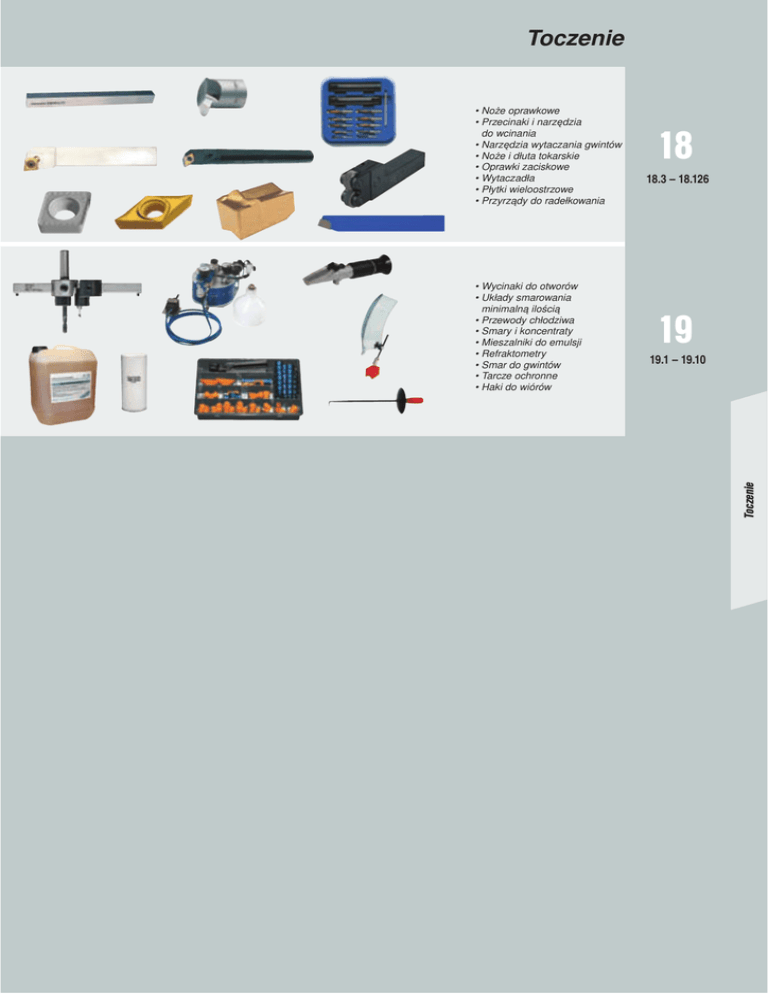 Toczenie • Wycinaki do otworów • Układy smarowania minimalną ilością • Przewody chłodziwa • Smary i koncentraty • Mieszalniki do emulsji • Refraktometry • Smar do gwintów • Tarcze ochronne • Haki do wiórów 18 18.3 – 18.126 19 19.1 – 19.10 Toczenie • Noże oprawkowe • Przecinaki i narzędzia do wcinania • Narzędzia wytaczania gwintów • Noże i dłuta tokarskie • Oprawki zaciskowe • Wytaczadła • Płytki wieloostrzowe • Przyrządy do radełkowania Nasi dostawcy dla TOCZENIE: 0 ß d § . * + ; F Toczenie 18.2 www.hhw.pl Hotline do zamówień Fax: +48 32 205 37 63 a = Dostawa tylko w podanych jednostkach pakowania. Ilość zamawiana w sztukach. # = częściowo z zapasów magazynowych PL/OP Info Przegląd - Zewnętrzne uchwyty zaciskowe System zaciskowy „S“ Typ do płytek wieloostrzowych Numer artykułu Strona katalogu SCLCR/L 95° CC .. 18405 - 18406 18.34 SDJCR/L 93° DC.. 18407 - 18410 18.34 SDNCN 62,5° DC.. 18411 18.35 SRDCN 90° RC.. 18400 18.35 SSDCN 45° SC.. 18402 18.35 Typ do płytek wieloostrzowych Numer artykułu Strona katalogu STGCR/L 90° TC.. 18416 - 18417 18.36 SVJBR/L 93° VB.. 18420 - 18421 18.36 SVJCR/L 93° VC.. 18418 - 18419 18.36 SVHCR/L 107,5° VC.. 18424 - 18425 18.37 SVVCN 72,5° VC.. 18428 18.37 PWLNR/L 95° WN.. 18446 - 18447 18.39 PSSNR/L 45° SN.. 18448 - 18449 18.40 SDQCR/L 107,5° DC.. 18498 - 18501 18.50 SVUCR/L 93° VC.. 18512 - 18513 18.50 System zaciskowy „C“ Typ do płytek wieloostrzowych Numer artykułu Strona katalogu CKJNR/L 93° KNUX 18430 - 18431 18.38 Typ do płytek wieloostrzowych Numer artykułu Strona katalogu PCBNR/L 75° CN.. 18440 - 18441 18.38 PCKNR/L 75° CN.. 18442 - 18443 18.39 PCLNR/L 95° CN.. 18444 - 18445 18.39 Typ do płytek wieloostrzowych Numer artykułu Strona katalogu PSDNN 45° SN.. 18450 18.40 PTGNR/L 90° TN.. 18451 - 18452 18.40 PDJNR/L 93° DN.. 18453 - 18454 18.41 MVJNR/L 93° VN.. 18464 - 18465 18.41 MWLNR/L 95° WN.. 18462 - 18463 18.42 Toczenie System zaciskowy „P“ System zaciskowy „M“ Typ do płytek wieloostrzowych Numer artykułu Strona katalogu Info MTJNR/L 93° TN.. 18460 - 18461 18.41 Przegląd - Wytaczadła System zaciskowy „S“ Typ do płytek wieloostrzowych Numer artykułu Strona katalogu SCLCR/L 95° CC .. 18482 - 18487 18.46 - 18.47 STFCR/L 90° TC.. 18490 - 18491 18.48 SDUCR/L 93° DC.. 18494 - 18519 18.48 - 18.49 PDUNR/L 93° DN.. 18526 - 18527 18.51 PWLNR/L 95° WN.. 18530 - 18531 18.52 Typ SVQCR/L 107,5° do płytek wieloostrzowych VC.. Numer artykułu 18516 - 18517 Strona katalogu 18.51 System zaciskowy „P“ Typ do płytek wieloostrzowych Numer artykułu Strona katalogu PL/OP # = częściowo z zapasów magazynowych PCLNR/L 95° CN.. 18522 - 18523 18.51 a = Dostawa tylko w podanych jednostkach pakowania. Ilość zamawiana w sztukach. www.hhw.pl Hotline do zamówień Fax: +48 32 205 37 63 18.3 Info 1 Oznaczenie normatywne dla uchwytów zaciskowych ISO (l) SYSTEM ZACISKOWY 2 W P 4 KSZTAŁT PŁYTY S T C S M KĄT PRZYŁOŻENIA OSTRZA C D E K V R N B C P P C L N R 1 Toczenie 3 Symbol A 2 3 Kształt Symbol 5 5 KĄT USTAWIENIA Kształt Symbol J V K W L X M C D N H E R Q B 4 KIERUNEK SKRAWANIA Kształt Specjalne R N F S G T U L 18.4 www.hhw.pl Hotline do zamówień Fax: +48 32 205 37 63 a = Dostawa tylko w podanych jednostkach pakowania. Ilość zamawiana w sztukach. # = częściowo z zapasów magazynowych PL/OP Info 6 Oznaczenie normatywne dla uchwytów zaciskowych ISO (ll) 7 WYSOKOŚĆ CHWYTU SZEROKOŚĆ CHWYTU 25 25 M 12 8 PL/OP 7 9 DŁUGOŚĆ CHWYTU L (mm) Symbol L (mm) Symbol 32 A 160 N 40 B 170 P 50 C 180 Q 60 D 200 R 70 E 250 S 80 F 300 T U 90 G 350 100 H 400 V 110 J 450 W 125 K 500 Y 140 L Specjalne X 150 M # = częściowo z zapasów magazynowych a 8 9 Toczenie 6 DŁUGOŚĆ KRAWĘDZI SKRAWANIA = Dostawa tylko w podanych jednostkach pakowania. Ilość zamawiana w sztukach. www.hhw.pl Hotline do zamówień Fax: +48 32 205 37 63 18.5 Info Oznaczenie normatywne dla wytaczadeł ISO WYTACZADŁO 1 S Chwyt stalowy A Chwyt stalowy 2 3 Ø chwytu z IKZ K 125 U 350 M 150 V 400 Q 180 W 450 spiekanego R 200 Y 500 Chwyt z węglika S 250 X Specjalny spiekanego z IKZ T 300 AH Chwyt HSS z IKZ C E Chwyt z węglika 4 DŁUGOŚĆ UCHWYTU SYSTEM ZACISKOWY P C S M S 32 S C T F P R 16 1 Toczenie 5 4 5 S 6 6 KSZTAŁT PŁYTY W 8 3 2 T 7 KĄT USTAWIENIA L D E U Z K V R F Q 9 9 7 10 KĄT PRZYŁOŻENIA OSTRZA K C KIERUNEK SKRAWANIA 8 DŁUGOŚĆ KRAWĘDZI SKRAWANIA 10 N B C P INFORMACJA DODATKOWA Te dane nie są częścią R normy i są tym samym udostępniane oferentowi. L 18.6 www.hhw.pl Hotline do zamówień Fax: +48 32 205 37 63 a = Dostawa tylko w podanych jednostkach pakowania. Ilość zamawiana w sztukach. # = częściowo z zapasów magazynowych PL/OP Info Oprawki zaciskowe do płytek wieloostrzowych i wytaczadeł ISO Wg ISO, do obróbki zewnętrznej i wewnętrznej. Do stosowania na obrabiarkach NC i CNC, również do tradycyjnych tokarek. Narzędzia skrawające z ostrzami węglikowymi najróżniejszego rodzaju i kształtu oraz z wkładkami węglikowymi powlekanymi TiN, TiC i Al-O-N, potrafią rozwiązywać niemal wszystkie postawione przed nimi zadania w zakresie skrawania. Dane cięcia oraz wydajność skrawania zostają zoptymalizowane. Zakres różnych łamaczy wiórów pozwala na uzyskanie krótkich połamanych wiórów, będących warunkiem zastosowania w nowoczesnych obrabiarkach z szczelnymi przestrzeniami roboczymi. Oprawki zaciskowe do płytek wieloostrzowych i wytaczadeł ISO są dostępne z 4 systemami zaciskowymi: System S Do płytek wieloostrzowych z otworem środkowym. Toczenie Mocowanie centralne przy pomocy śruby. System C Do płytek wieloostrzowych bez otworu (płytki DIN 4968). Mocowanie tylko przy pomocy łap zaciskowych. System P Do płytek wieloostrzowych z otworem środkowym. Mocowanie przy pomocy dźwigni zaciskowych. System M Do płytek wieloostrzowych z otworem środkowym. Mocowanie przy pomocy łap klinowych zaciskowych. PL/OP # = czę