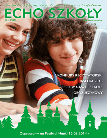 Zespół Szkół im. Elizy Orzeszkowej w Sobolewie ECHO SZKOŁY Zespół Szkół im. Elizy Orzeszkowej w Sobolewie ECHO SZKOŁY Nr 4-6/2014 Egzemplarz bezpłatny KONKURS RECYCTATORSKI JASEŁKA 2013 FERIE W NASZEJ SZKOLE OBÓZ JĘZYKOWY 1 Zapraszamy na Festiwal Nauki 15.03.2014 r. Zespół Szkół im. Elizy Orzeszkowej w Sobolewie ECHO SZKOŁY ECHO SZKOŁY Zespół Szkół im. Elizy Orzeszkowej w Sobolewie Rozpoczął się drugi semestr roku szkolnego 2013/2014 i realizacja projektu „Dobra edukacja – więcej szans na przyszłość” jest na półmetku. Czas podsumować, co udało nam się już osiągnąć. Uczniowie gimnazjum mieli okazję wziąć udział w Kursie poradnictwa i doradztwa zawodowego. Każdy uczestnik spotkał się indywidualnie z trenerem, który pomagał określić młodzieży cele edukacyjne i zawodowe oraz przedstawił możliwości kształcenia ogólnego i zawodowego. Ku końcowi zbliżają się zajęcia z grafiki komputerowej i Robotyki „Odkrycia i wynalazki”. Podczas tych spotkań uczniowie odkrywali tajniki programów graficznych takich jak Corel i Photoshop. Dzięki funduszom unijnym wyposażyliśmy naszą pracownię komputerową w licencje tychże programów. Zajęcia z robotyki wzbudziły również zainteresowanie. Roboty zbudowane przez uczestników kursu będzie można oglądać w akcji podczas Festiwalu Nauki organizowanego 15 marca br. Ponadto będzie można zobaczyć czego jeszcze nasze dzieci nauczyły się w ramach zajęć Klubu Młodego Naukowca. W styczniu rozpoczęły się zajęcia z rękodzieła artystycznego. Dwie grupy dzieci ze Szkoły Podstawowej poznają różnorodne techniki plastyczne, takie jak: decoupage, filcowanie, haftowanie, rzeźbienie w glinie, makrama, papermarche i in. Pod koniec lutego wystartowały Warsztaty taneczne – taniec dworski. Uczniowie swoje nowe umiejętności zaprezentują nam na początku czerwca, a już niebawem zostaną uszyte odpowiednie stroje do tańca. Uczestnicy kursu języka angielskiego w dniach 27 – 31 stycznia 2014 r. wyjeżdżali na obóz językowy do Zakopanego. Wrażenia z wyjazdu opisujemy w dalszej części naszej gazetki przygotowanej przez uczestników Koła dziennikarskiego. Pomimo wielu zajęć, obowiązków szkolnych i domowych nasi uczniowie nie zwalniają tempa i w pełni wykorzystują możliwości, które oferuje projekt unijny „Dobra edukacja – więcej szans na przyszłość”. 2 Marta Ausztol Szkolny asystent projektu OBÓZ JĘZYKOWY W ZAKOPANEM W br. szkolnym w Zespole Szkół w Sobolewie prowadzony jest udział w wodnej dyskotece. Zwieńczeniem dodatkowych at- projekt unijny „Dobra edukacja – więcej szans na przyszłość”, rakcji stała się wizyta w Muzeum Przyrodniczym Tatrzańskiego którego celem jest stworzenie dzieciom i młodzieży z naszej Parku Narodowego, a następnie piesza wyprawa Doliną placówki możliwości wszechstronnego rozwoju. Poza zajęciami Kościeliską, po której grupę oprowadzała pani przewodnik z grafiki komputerowej, robotyki, matematyki, dziennikarst- Jagna Trojan. Oprócz pokazania piękna majestatycznych Tatr i wa, rękodzieła artystycznego czy tańca, uczniowie doskonalą górskich strumyków, pani przewodnik opowiadała niezwykłe posługiwanie się językiem angielskim przy wykorzystaniu przez legendy o polskich zbójnikach, a szczególnie o Wojtku Matei. lektorów innowacyjnych metod nauczania. Na zakończenie obozu młodzież wyruszyła na kulig z ogni- W dniach od 27 do 31 stycznia właśnie ci uczniowie mieli oka- skiem. Dźwięk janczarów przywiązanych do końskich uprzęży zję wziąć udział w obozie językowym w Zakopanem w ramach i płonące pochodnie stworzyły niezapomniany klimat tej projektu „Dobra edukacja – więcej szans na przyszłość”. wspaniałej sanny, podczas której uczniowie śpiewali angielskie Podczas pięciu dni pobytu w zimowej stolicy Polski młodzież z piosenki nawiązujące do tematyki zimy i świąt. Sobolewa oprócz zajęć z języka angielskiego miała czas wypełni- Dzięki dodatkowym atrakcjom i tak ciekawy program zajęć z ony licznymi atrakcjami. Jedną z nich było zwiedzanie Zakopa- języka angielskiego wypełniony konwersacjami, dyskusjami, nego. Uczestnicy obozu podziwiali sanktuarium Matki Bożej grami itd., zyskał jeszcze bardziej. Udało się naprawdę połączyć Fatimskiej na Krzeptówkach, zabytkowy Kościół Matki Boskiej przyjemne z pożytecznym, czego wymiernym efektem stał się Częstochowskiej w centrum Zakopanego, Cmentarz Zasłużon- przyrost wiedzy i umiejętności z języka angielskiego uczniów z ych na Pękowym Brzyzku oraz barwne targowisko miejskie Zespołu Szkół w Sobolewie. obok stacji kolei linowo-terenowej na Gubałówkę. Obowiązkowo spędzili też czas na słynnych Krupówkach, gdzie okoliczne stargany kusiły pamiątkami i zapachem grillowanych oscypków z borówką. W Ośrodku Przygotowań Olimpijskich zobaczyli słynną skocznię Wielką Krokiew, a na koniec zwiedzali przepiękną kapliczkę na Jaszczurówce, będącą klasycznym przykładem stylu zakopiańskiego. Kolejną atrakcją pobytu w Tatrach była wyprawa na Słowację do Aqua Parku „Tatralandia” w Liptowskim Mikulaszu, gdzie uczniowie z Sobolewa kąpali się w źródłach termalnych, szaleli na olbrzymich zjeżdżalniach, pływali w basenach, a także brali 3 Zespół Szkół im. Elizy Orzeszkowej w Sobolewie ECHO SZKOŁY CO ZAKUPILIŚMY W RAMACH PROJEKTU? ECHO SZKOŁY FUNDUSZE UNIJNE - KORZYŚCI Program Operacyjny Kapitał Ludzki 2007 – 2013 Projekt „Dobra edukacja – więcej szans na przyszłość” re- wycieczki dzieci będą mogły poznać wiele miejsc znanych im alizowany jest w ramach działania 9.1.2 mającego na celu tylko z książek, opowiadań, wierszy. Podsumowaniem realizacji wyrównywanie szans edukacyjnych uczniów z grup o utrudni- projektu będzie Festiwal „Pokaż co potrafisz”. Podczas festiwa- onym dostępie do edukacji oraz zmniejszanie różnic w jakoś
