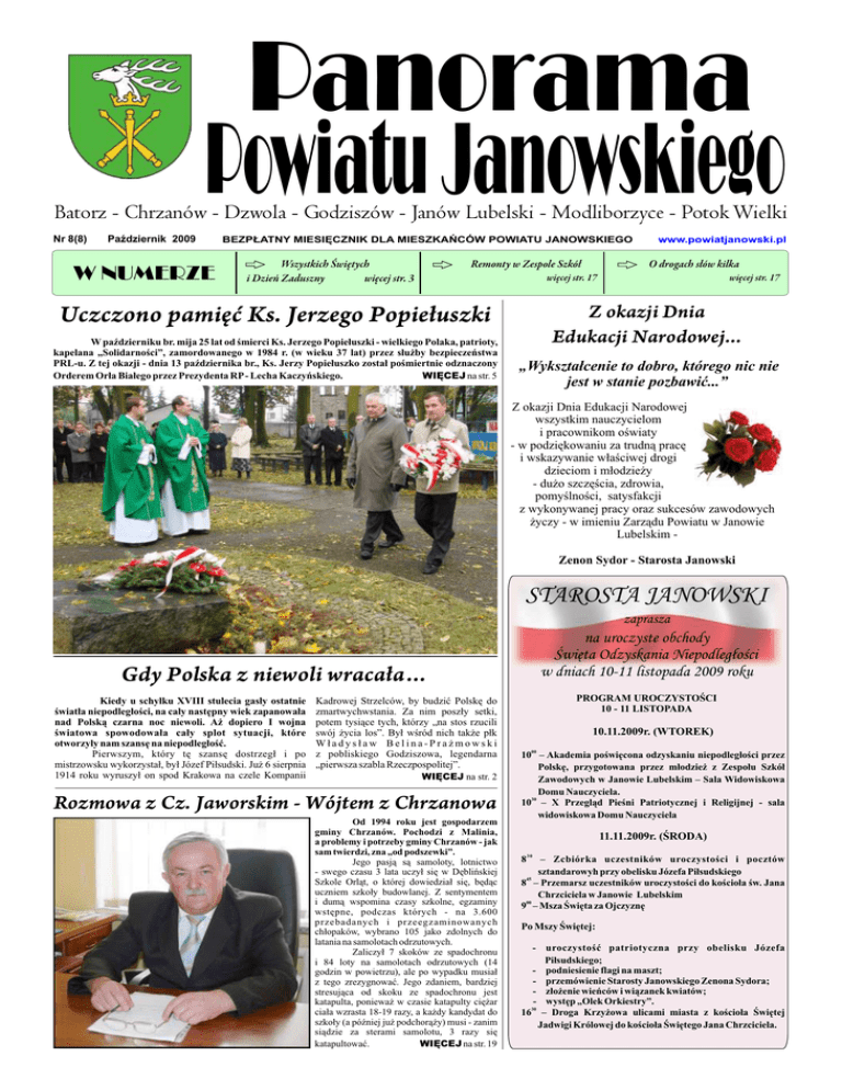 Panorama Powiatu Janowskiego Batorz - Chrzanów - Dzwola - Godziszów - Janów Lubelski - Modliborzyce - Potok Wielki Nr 8(8) Październik 2009 W NUMERZE BEZPŁATNY MIESIĘCZNIK DLA MIESZKAŃCÓW POWIATU JANOWSKIEGO Wszystkich Świętych i Dzień Zaduszny więcej str. 3 Remonty w Zespole Szkół www.powiatjanowski.pl O drogach słów kilka więcej str. 17 Uczczono pamięć Ks. Jerzego Popiełuszki W październiku br. mija 25 lat od śmierci Ks. Jerzego Popiełuszki - wielkiego Polaka, patrioty, kapelana „Solidarności”, zamordowanego w 1984 r. (w wieku 37 lat) przez służby bezpieczeństwa PRL-u. Z tej okazji - dnia 13 października br., Ks. Jerzy Popiełuszko został pośmiertnie odznaczony Orderem Orła Białego przez Prezydenta RP - Lecha Kaczyńskiego. WIĘCEJ na str. 5 więcej str. 17 Z okazji Dnia Edukacji Narodowej... „Wykształcenie to dobro, którego nic nie jest w stanie pozbawić...” Z okazji Dnia Edukacji Narodowej wszystkim nauczycielom i pracownikom oświaty - w podziękowaniu za trudną pracę i wskazywanie właściwej drogi dzieciom i młodzieży - dużo szczęścia, zdrowia, pomyślności, satysfakcji z wykonywanej pracy oraz sukcesów zawodowych życzy - w imieniu Zarządu Powiatu w Janowie Lubelskim Zenon Sydor - Starosta Janowski STAROSTA JANOWSKI zaprasza Gdy Polska z niewoli wracała… Kiedy u schyłku XVIII stulecia gasły ostatnie światła niepodległości, na cały następny wiek zapanowała nad Polską czarna noc niewoli. Aż dopiero I wojna światowa spowodowała cały splot sytuacji, które otworzyły nam szansę na niepodległość. Pierwszym, który tę szansę dostrzegł i po mistrzowsku wykorzystał, był Józef Piłsudski. Już 6 sierpnia 1914 roku wyruszył on spod Krakowa na czele Kompanii Kadrowej Strzelców, by budzić Polskę do zmartwychwstania. Za nim poszły setki, potem tysiące tych, którzy „na stos rzucili swój życia los”. Był wśród nich także płk Władysław Belina-Prażmowski z pobliskiego Godziszowa, legendarna „pierwsza szabla Rzeczpospolitej”. WIĘCEJ na str. 2 Rozmowa z Cz. Jaworskim - Wójtem z Chrzanowa Od 1994 roku jest gospodarzem gminy Chrzanów. Pochodzi z Malinia, a problemy i potrzeby gminy Chrzanów - jak sam twierdzi, zna „od podszewki”. Jego pasją są samoloty, lotnictwo - swego czasu 3 lata uczył się w Dęblińskiej Szkole Orląt, o której dowiedział się, będąc uczniem szkoły budowlanej. Z sentymentem i dumą wspomina czasy szkolne, egzaminy wstępne, podczas których - na 3.600 przebadanych i przeegzaminowanych chłopaków, wybrano 105 jako zdolnych do latania na samolotach odrzutowych. Zaliczył 7 skoków ze spadochronu i 84 loty na samolotach odrzutowych (14 godzin w powietrzu), ale po wypadku musiał z tego zrezygnować. Jego zdaniem, bardziej stresująca od skoku ze spadochronu jest katapulta, ponieważ w czasie katapulty ciężar ciała wzrasta 18-19 razy, a każdy kandydat do szkoły (a później już podchorąży) musi - zanim siądzie za sterami samolotu, 3 razy się katapultować. WIĘCEJ na str. 19 na uroczyste obchody Święta Odzyskania Niepodległości w dniach 10-11 listopada 2009 roku PROGRAM UROCZYSTOŚCI 10 - 11 LISTOPADA 10.11.2009r. (WTOREK) 1000 – Akademia poświęcona odzyskaniu niepodległości przez Polskę, przygotowana przez młodzież z Zespołu Szkół Zawodowych w Janowie Lubelskim – Sala Widowiskowa Domu Nauczyciela. 30 10 – X Przegląd Pieśni Patriotycznej i Religijnej - sala widowiskowa Domu Nauczyciela 11.11.2009r. (ŚRODA) 8 30 – Zcbiórka uczestników uroczystości i pocztów sztandarowyh przy obelisku Józefa Piłsudskiego 845 – Przemarsz uczestników uroczystości do kościoła św. Jana Chrzciciela w Janowie Lubelskim 00 9 – Msza Święta za Ojczyznę Po Mszy Świętej: - uroczystość patriotyczna przy obelisku Józefa Piłsudskiego; - podniesienie flagi na maszt; - przemówienie Starosty Janowskiego Zenona Sydora; - złożenie wieńców i wiązanek kwiatów; - występ „Olek Orkiestry”. 30 16 – Droga Krzyżowa ulicami miasta z kościoła Świętej Jadwigi Królowej do kościoła Świętego Jana Chrzciciela. Panorama Powiatu Janowskiego Gdy Polska z niewoli wracała… Co zadecydowało o sukcesie Polaków sprzed 91 lat? Niewątpliwie najważniejszą rolę odegrały wartości duchowe. Rodziny były przez cały okres niewoli twierdzami polskości. Rodzice przekazywali dzieciom całe dziedzictwo narodowe w religii, opowiadaniach, pieśniach patriotycznych i obyczajach. „Barwy pokoleń rodzinnej gleby / mamy i żony w grunt ten wśpiewały / pracą i pieśnią na ustach żeby / czerwień przy bieli przybronowały” (Marian Tyra). Ostoją ducha narodowego i autorytetem był także Kościół katolicki, a zasady chrześcijańskie były w powszechnym poszanowaniu. Sprawie narodowej służyli poeci, pisarze, artyści i kompozytorzy kultura ożywiała ducha narodowego. Wielu było bohaterów tamtego czasu, ich imiona chwalebnie zapisały się na kartach naszej historii. Niewątpliwie pierwszym pośród nich był Józef Piłsudski - wielki mąż stanu i znakomity wódz, człowiek o sprawdzonym patriotyzmie i bezstronności. * * * Janów i Ziemia Janowska zawsze były wierne tradycjom i szanowały bohaterów. Jeszcze podczas działań bojowych podczas I wojny, w 1916 roku postawiono obelisk poświęcony Strzelcom Piłsudskiego; zlokalizowany był na skwerku, prawie dokładnie w miejscu, gdzie obecnie stoi kamienna figura Matki Bożej Jazłowieckiej. Pomnik z popiersiem Marszałka był na Białej przy nieistniejącym już drewnianym budynku szkoły. Oba zostały zniszczone przez niemieckiego okupanta, a w 2000 r. postawiono obelisk w Janowie przed biurowcem Urzędu Miasta i Starostwa; nawiązuje on do tamtej tradycji. Pomniki bądź obeliski poświęcone Piłsudskiemu były (i są nadal) w Modliborzycach, Batorzu, Wierzchowiskach. O tamtych czasach „budzenia się” do niepodległości napisano w lokalnej gazecie - jednodniówce1 [zachowa