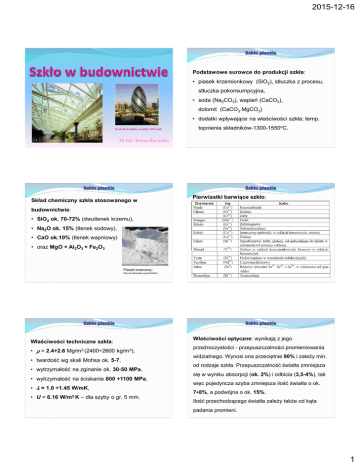 2015-12-16 Podstawowe surowce do produkcji szkła: • piasek krzemionkowy (SiO2), stłuczka z procesu, stłuczka pokonsumpcyjna, • soda (Na2CO3), wapień (CaCO3), dolomit (CaCO3.MgCO3) • dodatki wpływające na właściwości szkła; temp. Swiss Re London, Londyn XXI wiek topnienia składników-1300-1550oC. Dr inż. Teresa Rucińska Skład chemiczny szkła stosowanego w Pierwiastki barwiące szkło: budownictwie: • SiO2 ok. 70-72% (dwutlenek krzemu), • Na2O ok. 15% (tlenek sodowy), • CaO ok.10% (tlenek wapniowy) • oraz MgO + Al2O3 + Fe2O3 Piasek kwarcowy; http://pl.wikipedia.org/wiki/Szkło Właściwości techniczne szkła: • = 2.4÷2.6 Mg/m3 (2400÷2600 kg/m3), • twardość wg skali Mohsa ok. 5-7, • wytrzymałość na zginanie ok. 30-50 MPa, • wytrzymałość na ściskanie 800 ÷1100 MPa, • = 1.0 ÷1.45 W/mK, • U = 6.16 W/m2 K – dla szyby o gr. 5 mm. Właściwości optyczne: wynikają z jego przeźroczystości - przepuszczalności promieniowania widzialnego. Wynosi ona przeciętnie 90% i zależy min. od rodzaje szkła. Przepuszczalność światła zmniejsza się w wyniku absorpcji (ok. 2%) i odbicia (3,5-4%), tak więc pojedyncza szyba zmniejsza ilość światła o ok. 7÷8%, a podwójna o ok. 15%. Ilość przechodzącego światła zależy także od kąta padania promieni. 1 2015-12-16 Metody produkcji szkła budowlanego płaskiego: Właściwości chemiczne: szkło budowlane jest w • Szkło płaskie okienne ciągnione zasadzie odporne na działanie: • Szkło płaskie walcowane (barwne i wzorzyste) • wody, • Szkło płaskie wylewane float • kwasów • i zasad. Metoda produkcji szkła ciągnionego (metoda Pittsburgh) polega na pionowym ciągnieniu szkła z wanny. W masie szklanej, w miejscu wyciągania szkła, umieszczony jest ogniotrwały blok formujący, a szkło odbierane jest przez chłodzone trzymacze. Następnie przechodzi ono przez szyb odprężania o długości około 12 m po czym jest krojone w odpowiedni kształt. Obecnie metoda ta zanika. Całkowicie jest odporne na działanie czynników atmosferycznych i procesów gnilnych. Nie jest odporne na działanie kwasów: fluorowodorowego i Schemat produkcji szkła w technologii ciągnienia fosforowego. Szkło płaskie walcowane (barwne i wzorzyste) Szkło walcowane formowane jest w procesie walcowania ciągłego dwuwalcowego. szkło Stopione o Szkło płaskie wylewane float (wysokiej jakości) – wylanie wytopionego szkła na kąpiel stopionej cyny, a następnie uformowanie tafli, której dolna i górna temperaturze ok. 1000°C jest pomiędzy przeciskane dwoma stalowymi walcami chłodzonymi wodą, dając w efekcie Schemat produkcji szkła walcowanego taśmę szklaną kontrolowanej grubości odpowiednim wzorze powierzchni. powierzchnia stają się równoległe pod wpływem grawitacji i napięcia powierzchniowego. o i na Wykorzystuje się w tej metodzie znaczną różnicę gęstości szkła – 2,4÷2,6 g/cm3 oraz cyny – 7,3 g/cm3 Magazyn surowców sypkich Skład chemiczny, surowce: • Piasek kwarcowy (subst. szkłotwórcza) 70% • Związki sodu (topnik, klarowanie) 14% • Tlenek wapnia (stabilizator) • Inne tlenki (kolor, odporność atm.) 200°C Odprężanie szkła 10% 6% 1000°C 1550°C 620°C Wanna cynowa Piec (ciekłe szkło) (ciekła cyna) Kontrola cięcia • Stłuczka szklana (do 30% wsadu) 2 2015-12-16 Szkło walcowane wzorzyste, ornamentowe Szkło bezpieczne: zbrojone siatką stalową, hartowane, Szkło płaskie okienne klejone Szkło zbrojone siatką stalową - w przypadku pęknięcia nie następuje rozprysk kawałków szkła. Zapobiega temu wewnątrz wtopiona siatka metalowa o oczkach kwadratowych wielkości 12,7 mm. Szkło zbrojone nadaje się do przeszkleń dachów i Szkło zbrojone jest może utrzymać obciążenie spowodowane śniegiem, ognioochronne – powstrzymuje wiatrem lub deszczem. rozprzestrzenianie się ognia i www.pilkington.pl wytrzymuje wysoką temperaturę nawet do 60 minut. W razie pożaru szyba z takiego szkła nie rozpada się, nawet jeśli jest popękana. Z tego względu nadaje się ono na przykład na drzwi i szklane ściany działowe. 3 2015-12-16 Szkło hartowane - uzyskuje się przez termiczną obróbkę elementu o nadanym kształcie, wymiarach i ze wszystkimi otworami, jakie ma ono posiadać (podgrzanie do temp. 630-650oC i schłodzenie powietrzem z wentylatora o temp. ok. 20oC); szkło po zniszczeniu nie rani. Dzięki tej obróbce kilkakrotnie wzrasta wytrzymałość szkła. Takie szkło ma zwiększoną odporność na zmiany temperatury (od –100°C do +300°C). Szkło półhartowane - szkło float nagrzewane jest w piecu do temperatury ok. 600°C, a następnie schładzane. Jednak, w porównaniu do szkła hartowanego, etap schładzania zachodzi mniej gwałtownie, dzięki czemu wartości naprężeń dla końcowego produktu mieszczą się pomiędzy wartościami właściwymi dla zwykłego szkła float oraz szkła hartowanego. Różne własności mechaniczne, Różne parametry procesu technologicznego, Szkło hartowane (ESG) Pięciokrotnie wyższa wytrzymałość na zginanie (w stosunku do szkła niehartowanego), Wytrzymałość na zmiany temperatury w zakresie 200 0C. Szkło półhartowane (TVG) Dwukrotnie wyższa wytrzymałość na zginanie (w stosunku do szkła niehartowanego), Wytrzymałość na zmiany temperatury w zakresie 100 0C. Szkło odprężone (nie obrabiane termicznie); Różna kwalifikacja prawna, Różne obszary zastosowań Szkło półhartowane TVG; pęknięcie Szkło hartowane może być wyrobem gotowym, biegnie zawsze od krawędzi do krawędzi, Szkło półhartowane jest w zasadzie przeznaczone do dzięki czemu szkło pozostaje w ramach i produkcji szkła laminowanego, Szkło półhartowane nie należy do grupy szkieł bezpiecznych! poszczególne kawałki nie powinny wypaść Szkło hartowane ESG; Różna siatka spękań. 4 2015-12-16 Szkło klejone (wielowarstwowe) – składa się z dwu lub większej ilości szyb, połączonych trwale w
