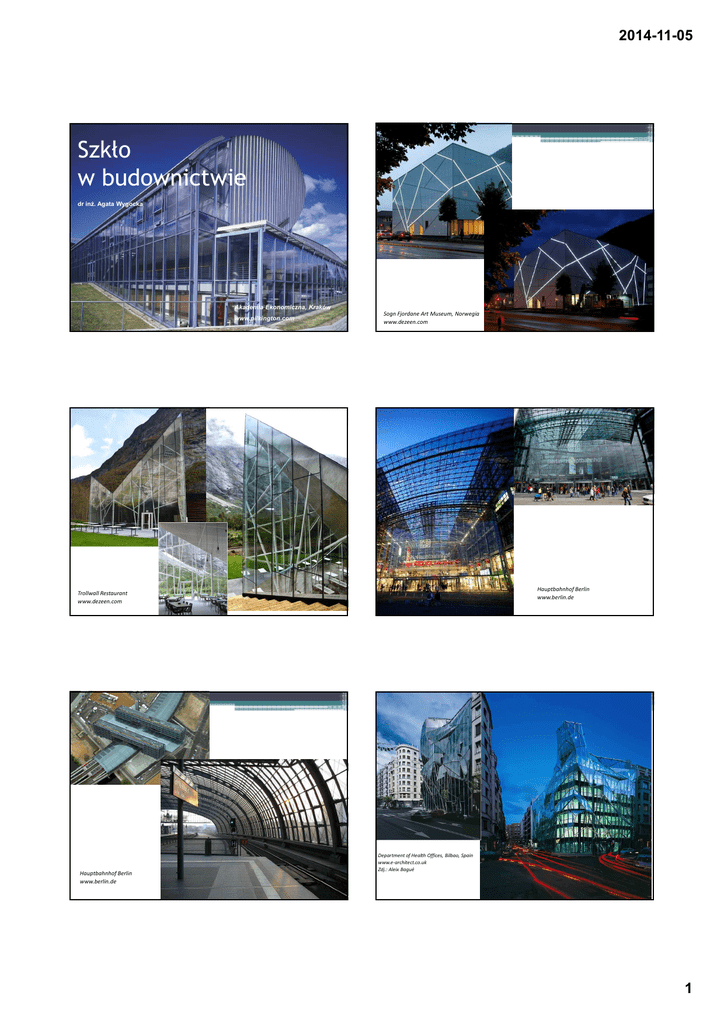 2014-11-05 Szkło w budownictwie dr inż. Agata Wygocka Akademia Ekonomiczna, Kraków www.pilkington.com Sogn Fjordane Art Museum, Norwegia www.dezeen.com Hauptbahnhof Berlin www.berlin.de Trollwall Restaurant www.dezeen.com Hauptbahnhof Berlin www.berlin.de Department of Health Offices, Bilbao, Spain www.e-architect.co.uk Zdj.: Aleix Bagué 1 2014-11-05 Wprowadzenie Wprowadzenie Podstawowe surowce do produkcji szkła: piasek krzemionkowy (SiO2), stłuczka z procesu, stłuczka pokonsumpcyjna, soda (Na2CO3), wapień (CaCO3), dolomit (CaCO3·MgCO3) dodatki wpływające na właściwości szkła. Skład chemiczny szkła stosowanego w budownictwie: SiO2 ok. 70÷72% (dwutlenek krzemu), Na2O ok. 15% (tlenek sodowy), CaO ok.10% (tlenek wapniowy), oraz MgO + Al2O3 + Fe2O3. Uproszczony wzór chemiczny szkła: Na2SiO3·CaSiO3·SiO2 Stapianie surowców – 1300oC Ujednolicanie stopu – 1350÷1550oC www.wikipedia.pl Wprowadzenie Wprowadzenie Pierwiastki barwiące szkło: Właściwości techniczne szkła Gęstość ρ=2,4÷2,6 g/cm3 Szczelność 100% (1) Wytrzymałość na ściskanie 800÷1100 MPa Wytrzymałość na rozciąganie/zginanie ok. 30 MPa Twardość 5÷7 w skali Mohsa Współczynnik przewodzenia ciepła λ=0,84÷1,45 W/(m·K) Wprowadzenie Wprowadzenie ρ +τ + α = 1 Właściwości optyczne szkła 2,5÷7% 84÷90% 3,5÷8% przepuszczalność promieniowania widzialnego Właściwości chemiczne szkła Odporne na działanie większości kwasów, zasad, wody. Całkowicie odporne na działanie czynników atmosferycznych i procesów gnilnych. Nieodporne na na działanie kwasów: fluorowodorowego i fosforowego. 2 2014-11-05 Metody produkcji szkła budowlanego płaskiego Metody produkcji szkła budowlanego płaskiego Szkło płaskie okienne ciągnione Podział szkła płaskiego okiennego ze względu na metodę produkcji: Szkło płaskie okienne ciągnione Szkło płaskie walcowane (barwne i wzorzyste) Szkło płaskie wylewane (float) Metoda produkcji szkła ciągnionego (metoda Pittsburgh) polega na pionowym ciągnieniu szkła z wanny. W masie szklanej, w miejscu wyciągania szkła, umieszczony jest ogniotrwały blok formujący, a szkło odbierane jest przez chłodzone trzymacze. Następnie przechodzi ono przez szyb odprężania o długości około 12 m po czym jest krojone w odpowiedni kształt. Obecnie metoda ta zanika. 1 - masa szklana, 2 - blok formujący, 3 - wstęga szkła, 4 - chłodnice wodne, 5 - chłodnice szybu, 6 - szyb pionowy, 7 - wałki ciągnące www.wikipedia.pl Metody produkcji szkła budowlanego płaskiego Metody produkcji szkła budowlanego płaskiego Szkło płaskie okienne walcowane Szkło płaskie wylewane Szkło walcowane formowane jest w procesie walcowania ciągłego dwuwalcowego. Stopione szkło o temperaturze ok. 1000°C jest przeciskane pomiędzy dwoma stalowymi walcami chłodzonymi wodą, dając w efekcie taśmę szklaną o kontrolowanej grubości i odpowiednim wzorze na powierzchni. W tej metodzie wykorzystuje się znaczną różnicę gęstości szkła (2,4÷2,6 g/cm3) oraz cyny (7,3 g/cm3) Zestaw szklarski złożony z dokładnie wymieszanych surowców jest topiony w piecu. Płynne szkło o temperaturze około 1000°C jest nieustannie wylewane z pieca do płytkiej wanny na kąpiel płynnej cyny w atmosferze o kontrolowanym składzie chemicznym. Szkło płynie po cynie, rozlewa się uzyskując idealnie płaską powierzchnię. Grubość kontrolowana jest przez dobór prędkości, z jaką zestalająca się wstęga szklana wypływa z wanny. Po odprężeniu (kontrolowanym schładzaniu) pojawia się szkło w postaci produktu o praktycznie równoległych powierzchniach (grawitacja i napięcie powierzchniowe). Brzegi produktu wyrównywane są za pomocą automatycznego noża. Obecnie wytwarzane szkło o grubości od 0,4 do 25 mm www.guardian-czestochowa.com Szkło płaskie wzorzyste Szkło płaskie barwne Barwione w masie http://www.bfl.com.pl Szkło malowane metodą sitodruku, natrysku lub ręcznie Szkło emaliowane Szkło silikonowane www.vildaiva.lt Barek wykonany z SGG BALDOSA GRABADA z podświetleniem od dołu. Studio projektowe CUSTOM MADE, S.L. Casadecor 04, Madryt 3 2014-11-05 Szkło satynowe (mleczne) Szkło ze sterowaną przeziernością Szkło satynowe charakteryzuje się wysoką przepuszczalnością światła, zapewniając maksymalne doświetlenie wnętrza przy jednoczesnym zachowaniu prywatności. Metody produkcji: piaskowanie trawienie (kwas fluorowodorowy) Szkło laminowane z folią zawierającą ciekłe kryształy (LC). Pod wpływem pola elektrycznego ciekłe kryształy ulegają uporządkowaniu i szkło staje się przezierne. Po odcięciu prądu szkło powraca do stanu matowego (półprzezierne). pl.saint-gobain-glass.com Szkło ze sterowaną przeziernością www.saint-gobain-glass.com Szkło bezpieczne Szkło zbrojone siatką stalową Szkło hartowane Szkło klejone wyłączone włączone Szkło bezpieczne Szkło zbrojone siatką stalową – w przypadku pęknięcia nie następuje rozprysk kawałków szkła. Zapobiega temu wtopiona wewnątrz siatka metalowa o oczkach kwadratowych wielkości 12,7 mm. Szkło zbrojone nadaje się do przeszkleń dachów i może utrzymać obciążenie spowodowane śniegiem, wiatrem lub deszczem. Szkło bezpieczne Szkło zbrojone siatką stalową Szkło zbrojone jest ognioochronne – powstrzymuje rozprzestrzenianie się ognia i wytrzymuje wysoką temperaturę nawet do 60 minut. W razie pożaru szyba z http://www.szklarze.com.pl/ takiego szkła nie rozpada się, nawet jeśli jest popękana. www.pilkington.pl http://www.ampasa.pl/ 4 2014-11-05 Szkło bezpieczne Szkło bezpieczne Szkło hartowane – uzyskuje się poprzez termiczną obróbkę elementu o nadanym kształcie, wymiarach i ze wszystkimi otworami, jakie ma ono posiadać (podgrzanie do temp. 630÷650oC i schłodzenie powietrzem z wentylatora o temp. ok. 20oC). W czasie tego procesu na powierzchni szkła wytwarzane są naprężenia ściskające, a we wnętrzu równoważące je 
