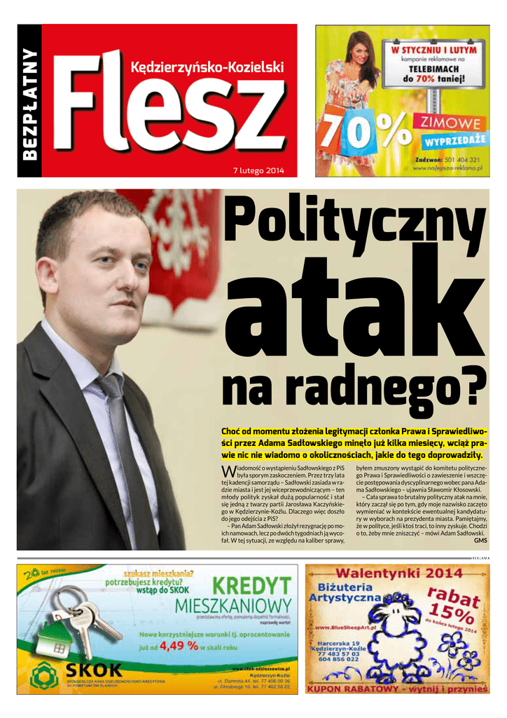 BE Z PŁATNY Kędzierzyńsko-Kozielski 7 lutego 2014 Polityczny atak na radnego? Choć od momentu złożenia legitymacji członka Prawa i Sprawiedliwości przez Adama Sadłowskiego minęło już kilka miesięcy, wciąż prawie nic nie wiadomo o okolicznościach, jakie do tego doprowadziły. W iadomość o wystąpieniu Sadłowskiego z PiS była sporym zaskoczeniem. Przez trzy lata tej kadencji samorządu – Sadłowski zasiada w radzie miasta i jest jej wiceprzewodniczącym – ten młody polityk zyskał dużą popularność i stał się jedną z twarzy partii Jarosława Kaczyńskiego w Kędzierzynie-Koźlu. Dlaczego więc doszło do jego odejścia z PiS? – Pan Adam Sadłowski złożył rezygnację po moich namowach, lecz po dwóch tygodniach ją wycofał. W tej sytuacji, ze względu na kaliber sprawy, byłem zmuszony wystąpić do komitetu politycznego Prawa i Sprawiedliwości o zawieszenie i wszczęcie postępowania dyscyplinarnego wobec pana Adama Sadłowskiego – ujawnia Sławomir Kłosowski. – Cała sprawa to brutalny polityczny atak na mnie, który zaczął się po tym, gdy moje nazwisko zaczęto wymieniać w kontekście ewentualnej kandydatury w wyborach na prezydenta miasta. Pamiętajmy, że w polityce, jeśli ktoś traci, to inny zyskuje. Chodzi o to, żeby mnie zniszczyć – mówi Adam Sadłowski. GMS 2 Twardziele na start Przed nami jubileuszowa edycja imprezy dla miłośników ekstremalnych przeżyć. Dziesiąty „Spływ Twardzieli” odbędzie się na Odrze 8 lutego. Kilkudziesięciu śmiałków zanurzy się w lodowatej wodzie i przepłynie 10 km z Ciska do Koźla. Start nastąpi o godz. 10 pod mostem w Cisku. - Ta impreza to nie tylko wyczyn, sport i zabawa. Zwracamy uwagę na kwestie związane z Odrą: zabezpieczenie przeciwpowodziowe, żeglugę, turystykę, ochronę środowiska – dodaje Janusz Tyka. Pierwsi uczestnicy spływu około południa powinni dotrzeć do przystani „Szkwał” na kozielskiej wyspie. Tam odbędzie się podsumowanie rywalizacji, wręczenie nagród, a także przekazanie łodzi motorowej dla WOPR-u. Organizatorzy zachęcają mieszkańców do przybycia na wyspę i do dopingowania uczestników. Na miejscu będzie ognisko i gorąca grochówka dla wszystkich. Organizatorami „Spływu Twardzieli” są: Morsy Dębowa, OSP ORW Waterproof oraz WOPR Kędzierzyn-Koźle. Ł „Flesz” – ukazuje się w Kędzierzynie-Koźlu i Powiecie Kędzierzyńsko-Kozielskim Adres redakcji: al. Jana Pawła II 36, 47-220 Kędzierzyn-Koźle Tel./fax (77) 483-40-49 E-mail: [email protected] Redaktor naczelny: Grzegorz Łabaj Sekretarz redakcji: Grzegorz Stępień Projekt graficzny i skład: greatio.com, tel. 601-422-132; Reklama: tel. 501 404 321, (77) 481-99-76 Wydawca: Lokalna Sp. z o.o. e-mail: [email protected] Adres: al. Jana Pawła II 36, 47-220 Kędzierzyn-Koźle Tel.: (77) 483-46-59 Redakcja nie zwraca materiałów niezamówionych oraz zastrzega sobie prawo do redagowania i skracania nadesłanych tekstów. Za treść reklam i ogłoszeń redakcja nie odpowiada. 7 lutego 2014 Come back byłego starosty Widłak szefem partii Palikota w Kędzierzynie-Koźlu Na lokalnej scenie politycznej pojawiła się nowa partia – Twój Ruch, wcześniej działająca jako Ruch Palikota. Szefem miejscowych struktur ugrupowania został były starosta kędzierzyńsko-kozielski i niegdyś prominentny polityk Platformy Obywatelskiej Artur Widłak. To nie koniec znanych nazwisk. T wój Ruch w KędzierzynieKoźlu zrzesza obecnie około 20 członków i sympatyków. Wiceprzewodniczącą zarządu partii jest Dorota Tomala, radna powiatowa, do niedawna w SLD, która razem z Arturem Widłakiem krótko zasiadała w zarządzie powiatu kędzierzyńsko-kozielskiego. Artur Widłak stał na czele powiatu kędzierzyńsko-kozielskiego do sierpnia zeszłego roku, gdy został odwołany przez koalicję Platformy Obywatelskiej. Co ciekawe, dwa lata wcześniej to właśnie z ramienia PO został wybrany na starostę, co ostatecznie przyczyniło się do rozwiązania struktur tej partii w naszym mieście. Na kilka miesięcy Artur Widłak całkowicie zniknął z życia publicznego w Kędzierzynie-Koźlu. Teraz wraca w nowych barwach politycznych. - Twój Ruch to formacja reprezentująca bliski mi światopogląd. Zgadzam się z jej programem. Dlatego zaangażowałem się w tworzenie struktur Twojego Ruchu w Kędzierzynie-Koźlu – wyjaśnia Artur Widłak nie powiedział jeszcze ostatniego słowa na lokalnej scenie politycznej. Artur Widłak. – Obecnie skupiamy się na rozwoju struktur i wyborach do Parlamentu Europejskiego. Później priorytetowe będą dla nas wybory samorządowe. Chcemy wprowadzić jak najwięcej osób do rady miasta i powiatu. Zawalczymy także o prezydenturę w mieście – Widłak zdradza zręby strategii politycznej Twojego Ruchu w Kędzierzynie-Koźlu. Na razie nie podaje żadnych nazwisk kandydatów. Nie byłoby jednak wielkim zaskoczeniem, gdyby o fotel prezydenta miasta zdecydował się walczyć sam Widłak. Ówczesny Ruch Palikota próbował już sił w Kędzierzynie-Koźlu w poprzednich wyborach samorządowych. Bez powodzenia. Nowo tworzona formacja nie ma jednak żadnego związku z tamtymi strukturami. We wtorek, 3 lutego, w Sławięcicach odbędzie się konferencja inauguracyjna Twojego Ruchu. Pojawić mają się na niej przedstawiciele władz krajowych partii. Być może będzie to sam Janusz Palikot. GMS 3 7 lutego 2014 Udar mózgu przyczyną kolizji Konkurs w galerii „Odrzańskie Ogrody” O krok od tragedii Walentynki z Maciejem Musiałem O ogromnym szczęściu mogą mówić uczestnicy poniedziałkowej kolizji na obwodnicy miasta. Samochód ciężarowy zjechał na przeciwległy pas ruchu i uderzył w fiata bravo. Żaden z pasażerów osobówki nie odniósł poważniejszych obrażeń. Galeria „Odrzańskie Ogrody” 15 lutego od goo zdarzenia doszło na al. Armii – relacjonuje podkomisarz Hubert ni do szpitala. Kobieta może mó- dziny 14 będzie świętować dzie