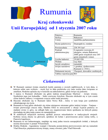 Rumunia Kraj członkowski Unii Europejskiej od 1 stycznia 2007 roku Państwo Stolica Ustrój Rumunia Bukareszt republika parlamentarna Hymn państwowy Deşteaptă-te, române 238 391 km² 8 regionów rozwoju.41 okręgów, miasto Bukareszt. 2686 gmin wiejskich oraz 265 gmin miejskich i miast. Liczba ludności 19 042 936 Waluta Lej, bani Języki urzędowe rumuński święto narodowe 1 grudnia, zjednoczenie Rumunii w 1918 r. Dokument turysty Paszport, dowodów osobistych Tablice rejestracyjne RO Powierzchnia Podział administracyjny Bukareszt Ciekawostki W Rumunii zamiast święta zmarłych każdy pamięta o swoich najbliższych, w tym dniu, w którym sobie sam wybiera – może być to data pochówku czy inna ważna data związana ze zmarłym. Rodzina spotyka się w kościele na nabożeństwie, gdzie święci się jedzenie. 1 marca w Rumunii obchodzi się gdzie indziej niespotykane Martisor – święto wiosny. Symbolem jego jest kokardka – biało czerwony kotylion. Hucznie obchodzi się w tym czasie różne ludowe zabawy i wzajemnie wręcza sobie małe prezenty. Hucznie obchodzi się w Rumunii także Nowy Rok , który w tym kraju jest symbolem odradzającego się życia. Rumunia to kraj gdzie obchodzi się różne nietypowe nieznane gdzie indziej święta - Tanjaua – święto pierwszego oracza roku, Sâmbra Oilor to uroczystość z okazji wyjścia pasterzy ze stadami owiec w góry, na odległe hale czy organizowane latem spotkania na których panny dowiadują się jaką mają szanse na zamążpójście. W niektórych miejscach możemy spotkać jeszcze mieszkańców w tradycyjnych strojach. Kobiety noszą chusty na głowach, spódnice do kolan i przewieszone przez ramię torby, a Panowie kapelusze. Rumunia to też balneoterapia, znajduje się tutaj jedna trzecia europejskich źródeł, z których można skorzystać w ponad 70 kurortach. Hrabia Drakula - legendarny wampir i literacka postać,której pierwowzorem stał się rumuński Vlad Dracolya, piętnastowieczny książę, znany również, jako Vlad Palownik Bukareszt-stolica Rumuni Bukareszt niegdyś piękne i wspaniałe miasto, stolica Rumunii nazywane było kiedyś „Paryżem Wschodu”. Miasto łączy z Paryżem XIX wieczna architektura i Łuk Triumfalny. Niestety reżim Nicolae Ceauşescu doprowadziły do jego totalnej ruiny i upadku. Zniszczył on większość miasta, w tym wiele zabytków - 22 cerkwi stawiając na ich miejsce betonowe symbole „swojej władzy”. Bukareszt położony jest nad rzeką Dymbowicą w południowo-wschodniej części Równiny Wołoskiej, jak Rzym na siedmiu wzgórzach. Wzgórza Bukaresztu to: Mihai Vodă, Patriarchalne, Radu Vodă.Cotroceni, Spirei, Văcăreşti i Sfântu Gheorghe Nou. Od 1862 roku jest stolicą Rumunii. Zniszczenia, w tym trzęsienie ziemi w 1977 roku i zmiany spowodowane przez niszczący reżim zahamowały jego rozwój tylko na chwilę. Dziś Bukareszt jest centrum medialnym i kulturalnym kraju. Jest również jednym z największych w Europie Południowej centrów przemysłowych i węzłów komunikacyjnych. Atrakcje turystyczne stolicy Ogrody Cismigiu Publiczny park w centrum Bukaresztu, najstarszy i największy park w mieście. Został założony w roku 1847 na obszarze przyznanym miastu dwa lata wcześniej przez tureckiego inspektora wodnego. Cişmigiu zaprojektowany został przez niemieckiego architekta. Słowo cişmigiu pochodzi z języka tureckiego i oznacza osobę odpowiedzialną za budowę i utrzymanie fontann. Łuk triumfalny Arcul de Triumf – łuk triumfalny usytuowany w północnej części Bukaresztu. Pierwszy, drewniany łuk stanął w tym samym miejscu zaraz po uzyskaniu niepodległości przez Rumunię. Zburzono go w 1935 r., aby wybudować kolejny pomnik, który znajduje się obecnie w tym samym miejscu. Budowa zakończyła się we wrześniu 1936. Łuk ma 27 metrów wysokości. Podstawą jest prostokąt o bokach 25 × 11,5 m. Arcul de Triumf poświęcony jest wszystkim żołnierzom walczącym w barwach Rumunii. Dom Ludu - Casa Poporulu Obecnie gmach parlamentu, zbudowany za czasów Ceausescu. Jest to największy po waszyngtońskim Pentagonie pod względem powierzchni gmach. Najbardziej reprezentacyjną ulicą jest Calea Victoriei. Jej zabudowania są w stylu architektury paryskiej. Znajduje się na niej także wiele reprezentacyjnych secesyjnych budowli, cerkwi, teatrów i eleganckich sklepów i restauracji. Cerkiew Kretzulescu Cerkiew Kretzulescu to cerkiew prawosławna w centrum Bukaresztu, wzniesiona w latach 1720-1722. Wewnątrz znajdują się freski wykonane w latach 1850-1859. Poważnie uszkodzona podczas trzęsienia ziemi w roku 1940, wyremontowana trzy lata później. Po trzęsieniu ziemi w 1977 ponownie przeszła poważny remont, a kolejny już po rewolucji rumuńskiej 1989 roku. Pałac Cretulescu Zabytkowy budynek w pobliżu Ogrodów Cişmigiu w Bukareszcie. Został on zbudowany dla rodziny Creţulescu na początku XX wieku. Od 1972 roku mieści się tu siedziba UNESCO Europejskiego Centrum Szkolnictwa Wyższego UNESCOCEPES. Atrakcje turystyczne kraju Transylwania leży w centralnej części Rumunii, na Wyżynie Siedmiogrodzkiej. Ze wszystkich stron otoczona jest pasmami górskimi. Kościoły obronne Transylwanii Charakterystycznym elementem Transylwanii są warowne kościoły, które znajdują się w wielu małych miejscowościach. Siedem z nich jest wpisanych na listę światowego dziedzictwa UNESCO. Zasada budowania przypominała nieco warowne fortece. Kościoły budowano na wysokim wzgórzu i otaczano murami obronnymi. Posiadały one potężne mury zaopatrzone w małe okienka strzelnicze. Za murami znajdowały się pomieszczenia gospodarcze i mieszkalne, pozwalające na przetrwanie najsilniejszego nawet oblężenia. Większość kościołów zbudowano w stylu gotyckim lub barokowym. Także późniejsze legendy wiążące hospodara z zamkiem Bran (w pobliżu Braszowa) - promowanego, jako zamek Draculi. Dom Draculi - Sighisoara Dom Drakuli (Casa Vlad D
