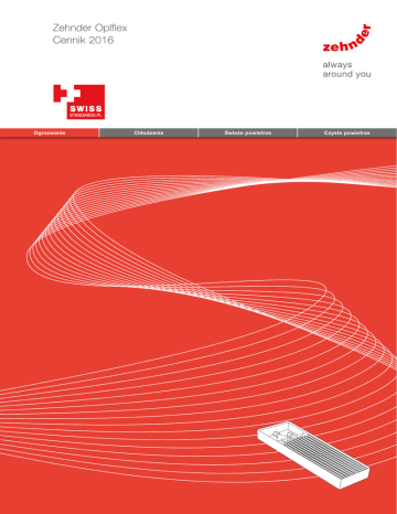 Zehnder Oplflex Cennik 2016 Ogrzewanie Chłodzenie Świeże powietrze Czyste powietrze Zehnder – wszystko dla komfortowego, zdrowego i energooszczędnego klimatu wnętrza Ogrzewanie, chłodzenie, świeże i czyste powietrze: w celu stworzenia komfortowego, zdrowego i energooszczędnego klimatu pomieszczenia firma Zehnder spełni wszelkie oczekiwania – zależnie od potrzeb. Szeroka i przejrzysta oferta firmy Zehnder obejmuje produkty dostosowane do każdego wnętrza, bez względu na to, czy jest to obiekt prywatny, publiczny, przemysłowy, nowe budownictwo czy budynek modernizowany. Również w kwestii serwisu firma Zehnder jest „always around you”. Ogrzewanie Systemy ogrzewania oferowane przez firmę Zehnder to nie tylko grzejniki dekoracyjne. W palecie produktów można znaleźć różnorodne rozwiązania w zakresie ogrzewania obejmujące zarówno promienniki wodne, jak również pompy ciepła z wbudowaną centralą wentylacyjną. ■ Grzejniki dekoracyjne ■ Kompaktowa centrala energetyczna z wbudowaną pompą ciepła ■ System ogrzewania i chłodzenia sufitowego ■ System komfortowej wentylacji wnętrz z odzyskiem ciepła Grzejniki dekoracyjne Zehnder Chłodzenie Firma Zehnder oferuje przemyślane rozwiązania również w zakresie chłodzenia pomieszczeń. Obejmują one zarówno systemy chłodzenia sufitowego, jak również system komfortowej wentylacji wnętrz z dystrybucją schłodzonego, świeżego powietrza. ■ Systemy ogrzewania i chłodzenia sufitowego ■ Kompaktowa centrala energetyczna z pompą ciepła i przewodem solanki ■ System komfortowej wentylacji wnętrz z gruntowym wymiennikiem ciepła do wstępnej regulacji temperatury świeżego powietrza Systemy ogrzewania i chłodzenia sufitowego Zehnder Świeże powietrze Świeże powietrze – grupa produktów firmy Zehnder z długoletnią tradycją. Zehnder Comfosystems oferuje komfortową wentylację wnętrz z odzyskiem ciepła, przeznaczoną do domów jedno- i wielorodzinnych, zarówno do obiektów nowych, jak i modernizowanych. ■ System komfortowej wentylacji wnętrz ■ Kompaktowa centrala energetyczna z wbudowaną jednostką wentylacyjną Zehnder Comfosystems Czyste powietrze Czyste powietrze w obiektach szczególnie narażonych na obecność pyłu zapewnia system filtracji powietrza Zehnder Clean Air Solutions. Natomiast w budynkach mieszkalnych szkodliwe substancje są usuwane przy zastosowaniu systemu komfortowej wentylacji wnętrz Zehnder Comfosystems. ■ System komfortowej wentylacji wnętrz z wbudowanym filtrem świeżego powietrza ■ Kompaktowa centrala energetyczna z wbudowanym filtrem świeżego powietrza ■ Systemy filtracji powietrza Zehnder Clean Air Solutions Zehnder – always around you Sprzedaż Technika Grzewcza Region Północny tel. kom. +48 603 406 467 Region Zachodni i Północno-zachodni tel. kom. +48 601 853 218 Region Południowo-zachodni tel. kom. +48 665 531 513 Region Południowy tel. kom. +48 601 853 170 Aglomeracja Warszawska i Polska Wschodnia tel. kom. +48 607 343 120 tel. kom. +48 603 322 382 Region Centralny tel. kom. +48 601 882 662 Promienniki tel. kom. +48 609 460 415 Sprzedaż Comfosystems Sprzedaż Polska Północna Region Północny tel. kom.+48 +48603 603 406 467 tel. kom. 406 467 Polska Zachodnia Region Zachodni i Północno-zachodni tel. kom.+48 +48601 607 407 tel. kom. 853 218414 Polska Południowo-Zachodnia Region Centralny tel. kom.+48 +48601 665 489 tel. kom. 882 662494 Polska Południowo-Wschodnia Aglomeracja Warszawska tel. kom.Wschodnia +48 601 853 170 i Polska tel. kom. +48 607 343 120 Polska tel. kom.Wschodnia +48 603 322 382 tel. kom. +48 603 450 480 Region Południowo-zachodni Polska tel. kom.Centralna +48 665 531 513 tel. kom. +48 601 882 662 Region Południowy tel. kom. +48 601 853 170 Promienniki tel. kom. +48 609 460 415 Zehnder Polska Sp. z o.o. Zehnder Polska Sp. z o.o. ul. Kurpiów 14 A, 52-214 Wrocław ul. Kurpiów 14A, 52-214 Wrocław tel. +48 71 367 64 24 tel. +48 71 367 64 24 fax 71367 36764 642525 fax +48 +48 71 mail: [email protected] zapytania - [email protected] zamówienia - [email protected] zapytania - mail: [email protected] reklamacje [email protected] zamówienia --mail: [email protected] reklamacje - mail: [email protected] www.zehnder.pl www.zehnder.pl 2 Doradztwo techniczne i serwis tel. kom. +48 605 513 543 tel. kom. +48 605 885 886 tel. kom. +48 695 415 785 tel. +48 71 339 46 24 tel. +48 71 339 46 28 tel. +48 71 339 46 29 tel. +48 71 339 46 35 tel. +48 71 339 46 36 Zamówienia i logistyka tel. +48 71 339 46 24 tel. +48 71 339 46 26 fax +48 71 367 64 25 Spis treści Spis Spistreści treści Ramy i grille Ramy i grille Akcesoria Instrukcje montażu Automatyka Automatyka Automatyka iiRegulacja regulacja regulacja i regulacja 264 268 270 272 8 264 264 10 268 11 270 13 272 277 278 279 151 15274 17 277 18 277 21 27719 278 27820 279 279 152 156 161 163 Akcesoria Wykonania specjalne Wykonania Wykonania specjalne specjalne Wykonania specjalne Oplflex FLBFLB Oplflex Kodyfikacja Dane techniczne 277 Oplflex FCC 230 AC 274 Oplflex FCCFCC 230230 AC AC Oplflex Przyłącza Oplflex FLB 263 150 Oplflex FCC 24 DC Wykonania specjalne Oplflex FCCFCC 24 DC Oplflex 24 DC 262 konwekcja wymuszona konwekcja wymuszona konwekcja wymuszona wymuszona mechaniczna 7 262 2626 263 263 odporność odporność wysoka jakość wykonania mechaniczna wykonania mechaniczna krótki czas reakcji „na miarę” paleta modeli wykonania wykonania szeroka odporność wysoka wysoka Tabele cenowe Oplflex FLT Oplflex FLTFLT Oplflex zehnder terraline - z konwekcją naturalną Oplflex Dynamic FCT 24 DC DC Oplflex Dynamic FCT 24 DC Oplflex Dynamic FCT 24 Opis produktu Oplflex Dynamic FCT 230 AC Oplflex Dynamic FCTFCT 230230 AC AC Oplflex Dynamic Oplflex FLK Canal Oplflex FLK Canal Oplflex FLK Canal Przegląd modeli konwekcja naturalna konwekcja naturalna konwekcja konwekcja naturalna stała wydajność cieplna stała stała wydajność wydajność cieplna wysoka cieplna Oplfle