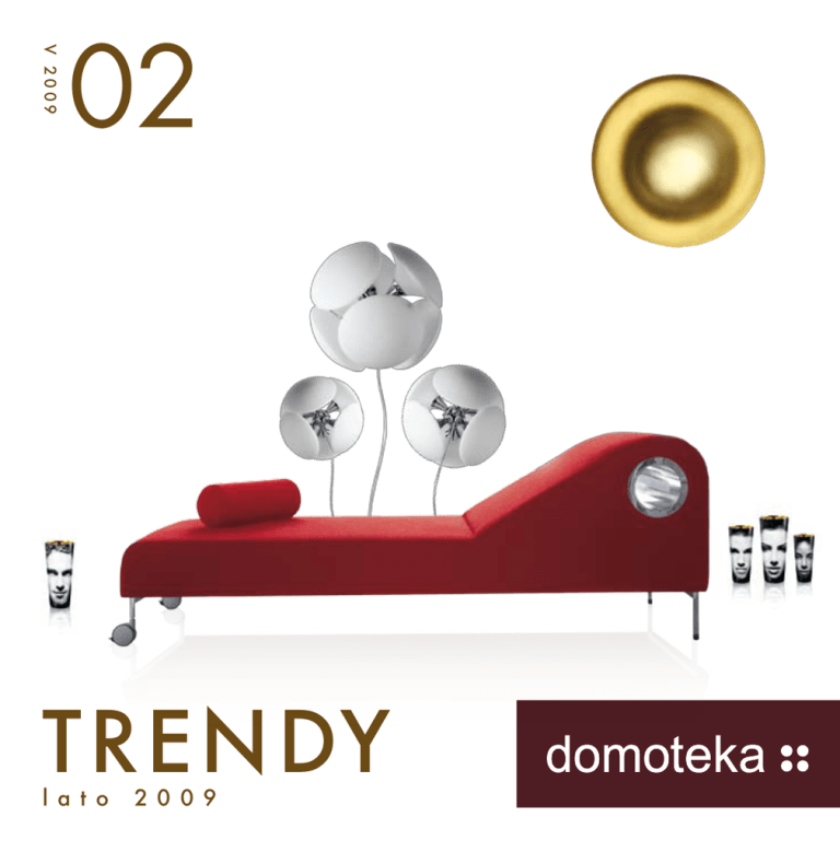 V 2009 02 TRENDY l a t o 2 0 0 9 Ikony L designu w Domotece XTLMFQËXEPPLPãBEPNV XZQSBXBQPQSF[FOUEPTLPOBãZ ato zagościło w Domotece, a wraz z nim nowe trendy. Nadal królują minimalizm i lśniąca ekstrawagancja. Na czasie są lekkie formy, gładkie powierzchnie i żywe kolory: od kobaltowego i zieleni, przez soczysty żółty, po czerwień i róż. Do głosu doszedł również silny styl barokowy. Bogactwo zdobień na kanapach i fotelach doskonale koresponduje ze złotymi lampami, ramkami i paterami. Wbrew pozorom te dwa główne nurty można połączyć, tworząc idealną całość. Poszukiwaczy piękna zapraszamy w podróż do Domoteki. 1 czerwca–15 lipca 2009 Miłośników pięknych przedmiotów i wielkich projektantów zapraszamy na niezwykłą wystawę wzornictwa prezentującą dzieła należące do klasyki designu, zaprojektowane przez największe światowe sławy, takie jak Philippe Starck, Mario Botta, Frank Gehry, czy Aldo Rossi. Tylko w Domotece zobaczycie, ĞMVC 8BMFOUZOLJ VSPE[JOZ %[JFŏ ,PCJFU %[JFŏ .BULJ /B XT[ZTULJF PLB[KF UF [VQFãOJFbyć przedmioty. jak doskonałe mogą XZKŁULPXF J UF CBSE[JFK DPE[JFOOF [OBKE[JFT[ X %PNPUFDF QSF[FOU EPTLPOBãZ FMFHBODLŁ JQSFTUJŚPXŁLBSUʼnQPEBSVOLPXŁ8QãBłEPXPMOŁLXPUʼnOBLBSUʼnJQPEBSVKKŁLPNVUZMLPDIDFT[ BPCEBSPXBOBPTPCBTBNB[EFDZEVKFKBLJQSF[FOU[%PNPUFLJCʼnE[JFEMBOJFKUZNOBKMFQT[ZN 1PT[VLJXBD[ZQJʼnLOB[BQSBT[BNZXQPESËŚEPLSBJOZQJʼnLOZDIQSF[FOUËX Patron medialny: Domoteka, ul. Malborska 41, Warszawa pn.–sb. 10.00–21.00; nd. 10.00–19.00 53"4"5036ę4,"13;:*,&" XXXEPNPUFLBQM POWYŻEJ: szafka fornirowana – orzech amerykański 4.700 zł galeria wnętrz NA OKŁADCE: szezlong od 4.950 zł COMFORTY LIVING COM40; świecznik 875 zł Rosenthal; lampa 799 zł EXCLUSIVE LIGHTS; kubki 855 zł/szt. ROSENTHAL DOMOTEKA nie ponosi odpowiedzialności za zmiany cen, które mogą nastąpić po oddaniu publikacji do druku. 3. 1. 2. 1. Lampa wisząca Clavius 6.377 zł Koma 2. Dywan Aqua 140/200 cm 1.400 zł Carving 3. Kanapa dwuosobowa od 3.550 zł Galeria noti 4. Sofa Mono od 5.950 zł Comforty living com40 5. Stolik do kawy Rough 55/55/40 1.038 zł nap 6. Biblioteka 611058V2 7.783 zł formanowa 4. Salon 4 Duże przestrzenie, przywodzące na myśl nowojorskie lofty, najlepiej odnajdą się w towarzystwie białych ścian i mebli o lekkiej konstrukcji. W ten sposób podkreślimy zamiłowanie do minimalizmu, któremu nie przeszkodzą kolorowe obrazy czy kobaltowa sofa. Zestaw Calvados: narożnik od 5.248 zł; fotel od 1.474 zł bizzarto 6. 5. 1. 1. Narożnik Como ok. 14.584 zł boconcept 2. Projektor InFocus Play Big X10 Full HD 5.999 zł kauber 3. Wazon Banan 90 zł Ludwik styl 4. Krzesło 990 zł fryderyk gallery 5. Koszyk Desert 200 zł SIA 6. Kominek Burlington ok. 15.350 zł chesney’s 2. 3. 5. to idealny kolor na lato. Odważny, świeży i uniwersalny. Można go zestawić zarówno Salon Wrzos z meblami w odcieniach brązu, jak i klasyczną bielą. Tyle o barwach, a co z kształtem…? –akcesoria Obowiązują proste formy i styl Ludwika, które tworzą modne, eklektyczne połączenie. 6 Zestaw SPA: kredens oszklony 2.799 zł; stół 155/235 2.549 zł; krzesła 419 zł/szt. ekoline 4. 6. 1. 1. Dywan wełniany Mamluk 170/210 12.900 zł kashmir 2. Biurko Savannah (orzech) 3.385 zł matkowski meble 3. Figurka konia 1.880 zł shangri la 4. Lampa 1.850 zł shangri la 5. Obudowa i wkład kominkowy Chazelles ok. 15.000 zł tim kominki 6. Drzwi Apis z ościeżnicą 2.745 zł entra 7. Fotel Vespa od 2.390 zł almi dÉcor 2. 4. 3. Gabinet 8 Szlachetne brązy, przełamane szarością i grafitem – tak latem prezentuje się gabinet. Wygodne, idealnie wyprofilowane fotele zaskakują bogatym wzornictwem i staranną tapicerką. Pojawił się zaczerpnięty z natury motyw figur zwierząt. Kredens 3D z kolekcji Select 3.759 zł; regał z kolekcji Select 2.999 zł; fotel Volles 2.799 zł Swarzędz meble 5. 6. 7. 1. 2. 1. Wyspa Rozmaryn 6.780 zł m.b. zazi 2. Hocker Mishell od 1.280 zł Galeria Noti 3. Witryna 20.800 zł arino house 4. Okap Amica ok. 1.900 zł TMC SALONY MEBLOWE 5. Szafki 12.500 zł; blat z konglomeratu 14.000 zł nowoczesne wnętrze 3. 4. Kuchnia 10 Jeśli myślisz o wyposażeniu kuchni, postaw na najmodniejszy, lakierowany mdf i fornir. Niewiele detali, reszta skrzętnie ukryta pod gładką powierzchnią szafek. Miłośnikom klasyki polecamy kuchnie z drewna, koniecznie pomalowane na biało. Kuchnia Smartline 56.000 zł, zaprezentowano fragment zestawu Alno 5. 1. 2. 3. 4. 1. Zegar 149 zł ZONE 2. Pojemnik do zapiekania 120 zł/szt. q forma 3. Pojemnik na kawę 50 zł tazza 4. Sztućce Zaha 826 zł/5 szt. Monetti 5. Tacka z talerzykami 1.510 zł ludwik styl 6. Duży talerz 36 zł/szt.; talerz głęboki 29 zł/szt.; kubek 22 zł/szt. ZONE Kuchnia Soczyste kolory zdominowały akcesoria kuchenne. Żółty zapiekacz do warzyw doskonale –akcesoria wygląda przy apetycznych kolorach talerzy i filiżanek. Gdzieniegdzie przebija się gorąca 12 czerwień i ciągle modna stal. Imbryczek do herbaty 995 zł rosenthal 6. 5. 2. 1. 1. Stół Snowdon 120 cm 2.472 zł; szyba 768 zł; krzesła Cuester 1.168 zł/szt. decolor 2. Komplet obciążników do obrusa 79 zł zone 3. Krzesło Coma od 891 zł Galeria Noti 4. Tkanina zasłonowa Casadeco 130 zł/m.b. domosystem 5. Stół Singways 3.236 zł; krzesła 1.012 zł/szt. vinotti 6. Witryna 1.250 zł farma kolonialna 3. 4. Jadalnia 14 Naturalne drewno i proste kształty to trend panujący w jadalni. Można go zastąpić rattanem połączonym z chromowanymi elementami. Latem nie zapomnijmy o roślinnnych motywach. Doskonale sprawdzą się zasłony w czerwone różyczki. Stół palisandrowy 200/90 cm 2.980 zł; krzesła palisandrowe 585 zł/szt. belbazaar 5. 6. 3. 1. 1. Zestaw Wawel 36 zł tazza 2. Krzesło Frilly 733 zł cube 3. Kubki Sieger 855 zł/szt. rosenthal 4. Patera Sieger (tylko na zamówienie) rosenthal 5. Kociołek na zupę 138 zł/2 szt. q forma 6. Złota patera 33 cm 190 zł almi dÉcor 7.