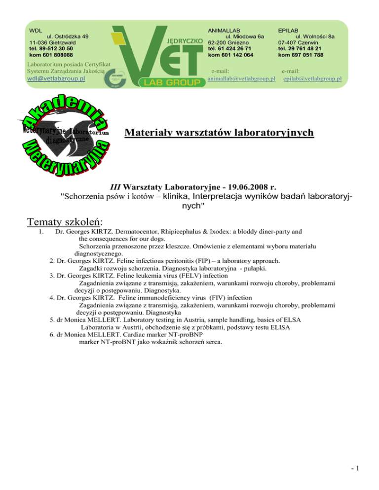 WDL ul. Ostródzka 49 11-036 Gietrzwałd tel. 89-512 30 50 kom 601 808088 Laboratorium posiada Certyfikat Systemu Zarządzania Jakością [email protected] ANIMALLAB ul. Miodowa 6a 62-200 Gniezno tel. 61 424 26 71 kom 601 142 064 e-mail: [email protected] EPILAB ul. W olności 8a 07-407 Czerwin tel. 29 761 48 21 kom 697 051 788 e-mail: [email protected] Materiały warsztatów laboratoryjnych III Warsztaty Laboratoryjne - 19.06.2008 r. "Schorzenia psów i kotów – klinika, Interpretacja wyników badań laboratoryjnych" Tematy szkoleń: 1. Dr. Georges KIRTZ. Dermatocentor, Rhipicephalus & Ixodex: a bloddy diner-party and the consequences for our dogs. Schorzenia przenoszone przez kleszcze. Omówienie z elementami wyboru materiału diagnostycznego. 2. Dr. Georges KIRTZ. Feline infectious peritonitis (FIP) – a laboratory approach. Zagadki rozwoju schorzenia. Diagnostyka laboratoryjna - pułapki. 3. Dr. Georges KIRTZ. Feline leukemia virus (FELV) infection Zagadnienia związane z transmisją, zakażeniem, warunkami rozwoju choroby, problemami decyzji o postępowaniu. Diagnostyka. 4. Dr. Georges KIRTZ. Feline immunodeficiency virus (FIV) infection Zagadnienia związane z transmisją, zakażeniem, warunkami rozwoju choroby, problemami decyzji o postępowaniu. Diagnostyka 5. dr Monica MELLERT. Laboratory testing in Austria, sample handling, basics of ELSA Laboratoria w Austrii, obchodzenie się z próbkami, podstawy testu ELISA 6. dr Monica MELLERT. Cardiac marker NT-proBNP marker NT-proBNT jako wskaźnik schorzeń serca. -1 WDL ul. Ostródzka 49 11-036 Gietrzwałd tel. 89-512 30 50 kom 601 808088 Laboratorium posiada Certyfikat Systemu Zarządzania Jakością [email protected] ANIMALLAB ul. Miodowa 6a 62-200 Gniezno tel. 61 424 26 71 kom 601 142 064 e-mail: [email protected] EPILAB ul. W olności 8a 07-407 Czerwin tel. 29 761 48 21 kom 697 051 788 e-mail: [email protected] SPIS TREŚCI Temat Białaczka kotów Feline leukemia virus (FELV) zakaźne zapalenie otrzewnej Feline Infectious Peritonitis (FIP) niedobór immunologiczny Feline Immunodeficiency Virus (FIV) NT-proBNT marker u psów i kotów z prolemami pzeciążenia mięśnia sercowego Babesioza Ehrichioza Anaplazmoza Borelioza – choroba “trendy” wirusowe zapalenia mózgu pochodzenia kleszczowego Tick-borne-encephalitis (TBE) Koronawirusy psów Dirifilaria – nicień sercowy Leiszmanioza – Leishmania Toksoplazmoza Chlamydioza riketsjoza (gorączka plamista) Leptospiroza Schorzenia skóry - Gronkowiec strona 2 3 5 6 7 8 9 10 12 14 14 15 15 15 16 16 16 -2 WDL ul. Ostródzka 49 11-036 Gietrzwałd tel. 89-512 30 50 kom 601 808088 Laboratorium posiada Certyfikat Systemu Zarządzania Jakością [email protected] ANIMALLAB ul. Miodowa 6a 62-200 Gniezno tel. 61 424 26 71 kom 601 142 064 e-mail: [email protected] EPILAB ul. W olności 8a 07-407 Czerwin tel. 29 761 48 21 kom 697 051 788 e-mail: [email protected] Feline leukemia virus (FELV) infection - Białaczka kotów Dr. Georges KIRTZ - czynnik etiologiczny – Retrovirus- Feline leukemia virus (FELV) Inne retrowirusy kotów: - Feline sarcoma virus (FESV)- Feline syncytium-forming virus (FeSFV) Wrażliwe na zakażenie: - – młode koty, wolno żyjące, zwykle pozbawione już przeciwciał matczynych. - koty stare lub przewlekle chore, osłabione (z immunosupresją) - koty zdrowe w towarzystwie siewców – z przełamaniem układu odpornościoweo. drogi zakażenia - W pierwszej kolejności dochodzi do zakażeń kotów przyjaznych w stosunku do innych kotów – kontakt bezpośredni, używanie wspólnych naczyń, lizanie, karmienie kociąt itp. - drogi zakażenia|: – ślina, szczególnie duża koncentracja wirusa. krew, mocz, kał, poprzez łożysko, droga jatrogenna (igły, instrumenty chirurgiczne, klatki, transfuzje krwi) objawy kliniczne - zaburzenia w reprodukcji (w tym niepłodność, resorbcje, ronienia), Lymphoma, Leukemia (ALL, AML, Myelofibrosis), Anemia, objawy ze stony centralnego lub obwodowego układu nerwowego W objawach klinicznych często dominujące są objawy towarzyszące immunosupresji (np. zapalenia jamy ustnej, skóry, oka, niewydolności nerkowej). Często także dochodzi do dramatycznych przebiegów schorzeń: - haemobartonellosis (mykoplazmoza), FIP, toxoplasmosis, crytococcosis and so on) FELV induced Lymphoma – zmiany w obrazie krwi: - Leukopenia, - Neutropenia, lymphopenia - Thrombopenia - Normochromic-normocytic or macrocytic anaemia (Mcv: >60 fl) - NON-regenerative anaemia - Normocellular/hypocellular bone marrow - M:E index increased – zasady badania laboratoryjnego: - ELISAag test – wykrywa pozakomórkowe proteiny p27 FeLV. - immunofluorescencja – wykrywa wewnątrzkomórkowe p27. - PCR – wykrywanie materiału genetycznego FeLV – dowolny rodzaj tkanki, surowica itp. - hodowle komórkowe – w pracach utynowych nie stosowane. - ELISAab test - wykrywa obecność przeciwciał. Z uwagi na powszechność kontaktu kotów z FeLV – bywa mało użyteczny. W hodowlach pozwala na ocenę prewalencji, określanie czasu pierwszych kontaktów z wirusem. W badaniach indywidualnych wynik ujemny wskazuje na wykluczenie schorzenia. – interpretacje wyników badań w technikach fluorescencyjnych: - Pamiętamy – wirus w tej technice wykrywany tylko w krwinkach białych. - Negative: - wynik ujemny - nie zainfekowany, brak replikacji. Nie wyklucza poniższej sekwencji: -3 WDL ul. Ostródzka 49 11-036 Gietrzwałd tel. 89-512 30 50 kom 601 808088 Laboratorium posiada Certyfikat Systemu Zarządzania Jakością [email protected] ANIMALLAB ul. Miodowa 6a 62-200 Gniezno tel. 61 424 26 71 kom 601 142 064 e-mail: [email protected] EPILAB ul. W olności 8a 07-407 Czerwin tel. 29 761 48 21 kom 697 051 788 e-mail: [email protected] zakażony, brak replikacji zakażony, ze skuteczną obroną w latentnym zakażeniu nie dochodzi do replikacji wirusa, brak więc jego obecności. Wirion najczęściej inkorporowany w genomie gospodarza. - wczesny etap zakażenia, wrus nie dot