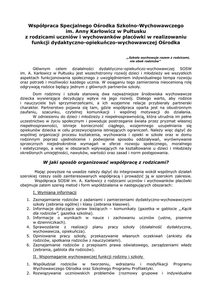 Współpraca Specjalnego Ośrodka Szkolno-Wychowawczego im. Anny Karłowicz w Pułtusku z rodzicami uczniów i wychowanków placówki w realizowaniu funkcji dydaktyczno-opiekuńczo-wychowawczej Ośrodka ,,Szkoła wychowuje razem z rodzicami, nie obok rodziców” Głównym celem działalności dydaktyczno-opiekuńczo-wychowawczej SOSW im. A. Karłowicz w Pułtusku jest wszechstronny rozwój dzieci i młodzieży we wszystkich aspektach funkcjonowania społecznego z uwzględnieniem indywidualnego tempa rozwoju oraz potrzeb i możliwości każdego ucznia. W osiąganiu tego zamierzenia nieocenioną rolę odgrywają rodzice będący jednym z głównych partnerów szkoły. Dom rodzinny i szkoła stanowią dwa najważniejsze środowiska wychowawcze dziecka wywierające decydujący wpływ na jego rozwój. Dlatego warto, aby rodzice i nauczyciele byli sprzymierzeńcami, a ich wzajemne relacje przybierały partnerski charakter. Partnerstwo pojawia się tam, gdzie współpraca oparta jest na obustronnym zaufaniu, szacunku, czytelnej komunikacji i wspólnej motywacji do działania. W odniesieniu do dzieci i młodzieży z niepełnosprawnością, która utrudnia im pełne uczestnictwo w życiu społecznym i powoduje postrzeganie świata przez pryzmat własnej niepełnosprawności, istnieje konieczność ciągłego, wzajemnego uzupełniania się opiekunów dziecka w celu przezwyciężania istniejących ograniczeń. Należy więc dążyć do wspólnej organizacji procesu kształcenia, wychowania i opieki w szkole oraz w domu rodzinnym poprzez ujednolicenie i podwojenie sposobu oddziaływań, wyrównywanie sprzecznych niejednokrotnie wymagań w sferze rozwoju społecznego, moralnego i estetycznego, a więc w obszarach wpływających na kształtowanie u dzieci i młodzieży określonych umiejętności, nawyków, wartości oraz zasad i norm postępowania. W jaki sposób organizować współpracę z rodzicami? Mając powyższe na uwadze należy dążyć do integrowania wokół wspólnych działań szerokiej rzeszy osób zainteresowanych współpracą i prowadzić ją w szerokim zakresie. Współpraca SOSW im. A. Karłowicz z rodzicami uczniów i wychowanków placówki obejmuje zatem szereg metod i form współdziałania w następujących obszarach: I. Wymiana informacji 1. Zaznajamianie rodziców z zadaniami i zamierzeniami dydaktyczno-wychowawczymi szkoły (zebrania ogólne) i klasy (zebrania klasowe). 2. Informacje dotyczące spraw bieżących – komunikaty (gazetka w gablocie ,,Kącik dla rodziców”, gazetka szkolna). 3. Informacje o wynikach w nauce i zachowaniu uczniów (ustne, pisemne w dzienniczkach). 4. Sprawozdanie z realizacji planu pracy szkoły (działalność dydaktyczna, wychowawcza, opiekuńcza). 5. Opiniowanie pracy szkoły, przekazywanie własnych oczekiwań (ankiety dla rodziców, spotkania rodziców z nauczycielami). 6. Zaznajamianie rodziców z przepisami prawa oświatowego, zarządzeniami władz (zebrania, gablota dla rodziców). II. Wspomaganie wychowawczej funkcji rodziny i szkoły 1. Współudział rodziców w tworzeniu, wdrażaniu i modyfikacji Programu Wychowawczego Ośrodka oraz Szkolnego Programu Profilaktyki. 2. Rozwiązywanie uczniowskich problemów (rozmowy grupowe i indywidualne z wychowawcą, nauczycielami przedmiotów, dyrekcją, pielęgniarką). 3. Profilaktyka uzależnień – praca zespołu składającego się z rodziców, nauczycieli, pielęgniarki i dyrektora. 4. Udostępnianie rodzicom księgozbioru bibliotecznego związanego szczególnie ze specyfiką procesu nauczania i wychowania. 5. Szeroko pojęta pedagogizacja rodziców. III. Integrowanie społeczności szkolnej 1. Organizowanie wspólnych imprez ogólnoszkolnych i klasowych. 1. Pomoc rodziców podczas organizacji wycieczek, biwaków, imprez klasowych i szkolnych. 2. Organizowanie zjazdów absolwentów. 3. Udział rodziców w uroczystościach szkolnych, olimpiadach i konkursach. IV. Pomoc placówce w organizacji warunków pracy 1. Gromadzenie i dystrybucja środków z dobrowolnych składek rodziców. 2. Wykonywanie przez rodziców prac gospodarczo-porządkowych na rzecz szkoły. Czy istnieje recepta na udaną współpracę nauczycieli z domem rodzinnym? Bogata gama proponowanych sposobów współdziałania Ośrodka ze środowiskiem rodzinnym powoduje, iż współpraca ta staje się łatwo dostępna dla wszystkich zainteresowanych wzrostem udziału rodziców w kreowaniu szkolnej rzeczywistości, w decydowaniu o istotnych sprawach szkoły z uwagi na szeroko rozumiane dobro dzieci i młodzieży z niepełnosprawnością. Należy zaznaczyć jednak, że niekiedy owa współpraca okazuje się być sprawą trudną i delikatną ze względu na czynniki różnicujące środowisko rodzinne podopiecznych Ośrodka, takie jak: pochodzenie społeczne rodziców, poziom ich wykształcenia i życia kulturalnego, w tym poziom kultury pedagogicznej, sytuacja materialno-bytowa, a także różna perspektywa postrzegania interesów dziecka. Na pewno warto się zastanowić co należy uczynić, aby poprawić jakość wspomnianej współpracy, może poszukać na nią skutecznej recepty? Pomyślność współdziałania w dużej mierze zależy od rozpoznania z jakimi typami rodziców szkoła ma do czynienia, co pozwoli na wytyczenie właściwego kierunku podejmowanej aktywności. Niejednokrotnie kadra pedagogiczna Ośrodka musi prowadzić długotrwałe starania, aby ugruntować w rodzicach przekonanie, że są potrzebnymi i użytecznymi współgospodarzami tej placówki w cyklu kształcenia i wychowania swoich pociech. W dużej liczbie przypadków procentuje to nawiązaniem mocniejszej nici porozumienia obu środowisk wychowawczych. W przypadku rodziców ,,wszystko wiedzących” oraz ,,uskarżających się” (narzekających, próbujących narzucać nauczycielowi swój sposób myślenia i działania) sprawdzoną metodą jest uważne wysłuchanie takich rodziców, następnie włączenie ich w realizację określonych zadań. Własna akty