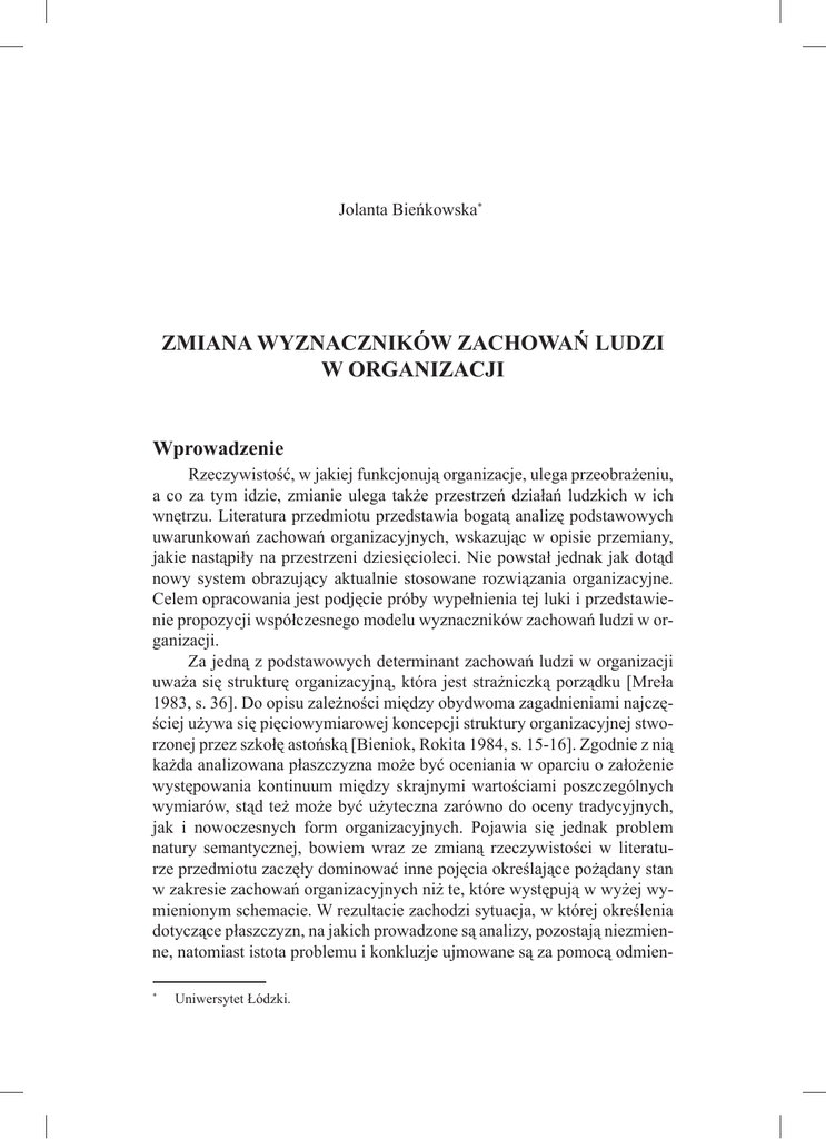 Jolanta Bieńkowska*1 3,7 ZMIANA WYZNACZNIKÓW ZACHOWAŃ LUDZI W ORGANIZACJI Wprowadzenie Rzeczywistość, w jakiej funkcjonują organizacje, ulega przeobrażeniu, a co za tym idzie, zmianie ulega także przestrzeń działań ludzkich w ich wnętrzu. Literatura przedmiotu przedstawia bogatą analizę podstawowych uwarunkowań zachowań organizacyjnych, wskazując w opisie przemiany, jakie nastąpiły na przestrzeni dziesięcioleci. Nie powstał jednak jak dotąd nowy system obrazujący aktualnie stosowane rozwiązania organizacyjne. Celem opracowania jest podjęcie próby wypełnienia tej luki i przedstawienie propozycji współczesnego modelu wyznaczników zachowań ludzi w organizacji. Za jedną z podstawowych determinant zachowań ludzi w organizacji uważa się strukturę organizacyjną, która jest strażniczką porządku [Mreła 1983, s. 36]. Do opisu zależności między obydwoma zagadnieniami najczęściej używa się pięciowymiarowej koncepcji struktury organizacyjnej stworzonej przez szkołę astońską [Bieniok, Rokita 1984, s. 15-16]. Zgodnie z nią każda analizowana płaszczyzna może być oceniania w oparciu o założenie występowania kontinuum między skrajnymi wartościami poszczególnych wymiarów, stąd też może być użyteczna zarówno do oceny tradycyjnych, jak i nowoczesnych form organizacyjnych. Pojawia się jednak problem natury semantycznej, bowiem wraz ze zmianą rzeczywistości w literaturze przedmiotu zaczęły dominować inne pojęcia określające pożądany stan w zakresie zachowań organizacyjnych niż te, które występują w wyżej wymienionym schemacie. W rezultacie zachodzi sytuacja, w której określenia dotyczące płaszczyzn, na jakich prowadzone są analizy, pozostają niezmienne, natomiast istota problemu i konkluzje ujmowane są za pomocą odmien* Uniwersytet Łódzki. 260 Jolanta Bieńkowska nej, nowoczesnej aparatury pojęciowej. Wynika stąd zasadność stworzenia nowej koncepcji wyznaczników zachowań organizacyjnych. W niniejszym opracowaniu odniesiono się do czterech aspektów decydujących o typie zachowań obserwowanych w organizacji, dla których utworzył się w toku rozważań wspólny mianownik. Okazały się nim być wartości: zaufania i swobody działania. Stanowią one podstawy ewolucji wyznaczników, jak również efekt zastosowania nowych rozwiązań. Nazwy kolejnych części opracowania sformułowane zostały jako zestawienie dotychczasowych i proponowanych determinant. Przyjęta forma stanowi punkt do dyskusji na temat przeobrażeń w omawianym obszarze. Zadania – wyzwania Uzasadnieniem redefinicji przedmiotu pracy jest znaczenie wyżej wymienionych słów. Zadaniem jest zagadnienie dane do opracowania [SJP 2012], natomiast wyzwaniem jest trudne zadanie, nowa sytuacja, wymagające od kogoś wysiłku, poświęcenia itp., będące sprawdzianem czyjejś wiedzy, odporności itp. [SJP 2012]. We współczesnych, dynamicznie rozwijających się przedsiębiorstwach nie oczekuje się już wykonywania zadań według znanego i preferowanego szablonu, ale kreowania własnych rozwiązań i nowych idei. Zaistniał inny punkt widzenia na rolę pracownika w organizacji, którego praca nie powinna ograniczać się do sumiennego wypełniania zakresu obowiązków [Wolfe Morrison 1994, s. 1543]. Oczekuje się od niego chęci współuczestnictwa w działaniach firmy i przejęcia współodpowiedzialności za jej losy. Obecny styl projektowania organizacji zmierza do określania wyzwań dla każdego stanowiska pracy, aby uruchomić w człowieku wszystkie jego siły [Drucker 2004, s. 117]. Zmiana sposobu działania w firmie wynika także z faktu przenoszenia na niskie szczeble hierarchii uprawnień do rozwiązywania złożonych problemów, co było dotąd „zarezerwowane” dla kadry kierowniczej. Obecnie ze względu na postępującą delegację władzy szeregowi pracownicy są uprawomocnieni do diagnozowania i kreowania rozwiązań w problematycznych sytuacjach, z jakimi się spotykają. Nowy wzorzec postrzegania człowieka w miejscu pracy przekłada się na taktykę polegającą na – w pierwszej kolejności – ogólnym zarysowaniu przez kadrę kierowniczą wymogów dotyczących wyników, jakie firma zamierza osiągnąć, w następnej – odnalezieniu przez pracownika własnej ścieżki ich osiągania. Zatem zmierza do takiej metody formułowania celów ogólnych, aby każdy mógł znaleźć fragment dla siebie, w którego realizację będzie mógł się zaangażować [Drucker 2002, s. 177]. B. Waterman i I. Peters określili tego rodzaju działanie mianem solution space, polegającym na definiowaniu granic i zakresu odpowiedzialności wystraczająco jasno, by wskazać kierunek, ale i wystarczająco elastycznie, by pozwolić na modyfi- Zmiana wyznaczników zachowań ludzi w organizacji 261 kacje niezbędne do budowy zaangażowania członków zespołu [Katzenbach, Smith 2001, s. 60]. W zaistniałej przemianie doszukać się możemy idei, jaka przyświecała P. Druckerowi, kiedy formułował założenia do koncepcji zarządzania przez cele [Witzel 2005, s. 130]. Istotą tej techniki jest rezygnacja z odtwórczej roli pracownika w procesie pracy na rzecz aktywnej postawy polegającej na stawianiu wyzwań (celów) i dążenia do ich realizacji. Wszystko to ma zmierzać do pobudzania i wzmacniania motywacji do pracy, gdyż pracownik dzięki temu czuje się współodpowiedzialny za losy swojej firmy. Zyskuje także swobodę działania, decydowania o losach własnych oraz organizacji, w której pracuje. Analizując postulowane rozróżnienie między zadaniami a wyzwaniami, można wyprowadzić wniosek, że niezmienne pozostaje założenie, co do potrzeby posiadania celu ogólnego przez firmę, który będzie jednoczył wszystkich pracowników. Zmiana dotyczy czynności następnych. W organizacjach mechanistycznych później następuje przełożenie ich na ściśle określone zadania, zlecane do wykonania pracownikom. W organizacjach organicznych