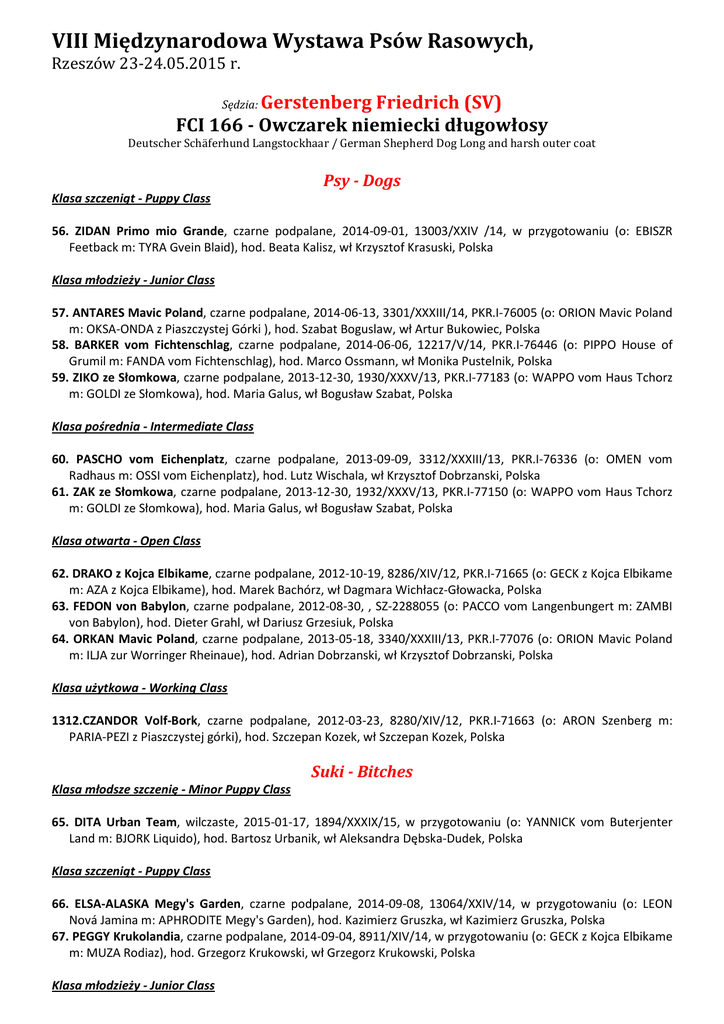 VIII Międzynarodowa Wystawa Psów Rasowych, Rzeszów 23-24.05.2015 r. Gerstenberg Friedrich (SV) FCI 166 - Owczarek niemiecki długowłosy Sędzia: Deutscher Schäferhund Langstockhaar / German Shepherd Dog Long and harsh outer coat Psy - Dogs Klasa szczeniąt - Puppy Class 56. ZIDAN Primo mio Grande, czarne podpalane, 2014-09-01, 13003/XXIV /14, w przygotowaniu (o: EBISZR Feetback m: TYRA Gvein Blaid), hod. Beata Kalisz, wł Krzysztof Krasuski, Polska Klasa młodzieży - Junior Class 57. ANTARES Mavic Poland, czarne podpalane, 2014-06-13, 3301/XXXIII/14, PKR.I-76005 (o: ORION Mavic Poland m: OKSA-ONDA z Piaszczystej Górki ), hod. Szabat Boguslaw, wł Artur Bukowiec, Polska 58. BARKER vom Fichtenschlag, czarne podpalane, 2014-06-06, 12217/V/14, PKR.I-76446 (o: PIPPO House of Grumil m: FANDA vom Fichtenschlag), hod. Marco Ossmann, wł Monika Pustelnik, Polska 59. ZIKO ze Słomkowa, czarne podpalane, 2013-12-30, 1930/XXXV/13, PKR.I-77183 (o: WAPPO vom Haus Tchorz m: GOLDI ze Słomkowa), hod. Maria Galus, wł Bogusław Szabat, Polska Klasa pośrednia - Intermediate Class 60. PASCHO vom Eichenplatz, czarne podpalane, 2013-09-09, 3312/XXXIII/13, PKR.I-76336 (o: OMEN vom Radhaus m: OSSI vom Eichenplatz), hod. Lutz Wischala, wł Krzysztof Dobrzanski, Polska 61. ZAK ze Słomkowa, czarne podpalane, 2013-12-30, 1932/XXXV/13, PKR.I-77150 (o: WAPPO vom Haus Tchorz m: GOLDI ze Słomkowa), hod. Maria Galus, wł Bogusław Szabat, Polska Klasa otwarta - Open Class 62. DRAKO z Kojca Elbikame, czarne podpalane, 2012-10-19, 8286/XIV/12, PKR.I-71665 (o: GECK z Kojca Elbikame m: AZA z Kojca Elbikame), hod. Marek Bachórz, wł Dagmara Wichłacz-Głowacka, Polska 63. FEDON von Babylon, czarne podpalane, 2012-08-30, , SZ-2288055 (o: PACCO vom Langenbungert m: ZAMBI von Babylon), hod. Dieter Grahl, wł Dariusz Grzesiuk, Polska 64. ORKAN Mavic Poland, czarne podpalane, 2013-05-18, 3340/XXXIII/13, PKR.I-77076 (o: ORION Mavic Poland m: ILJA zur Worringer Rheinaue), hod. Adrian Dobrzanski, wł Krzysztof Dobrzanski, Polska Klasa użytkowa - Working Class 1312.CZANDOR Volf-Bork, czarne podpalane, 2012-03-23, 8280/XIV/12, PKR.I-71663 (o: ARON Szenberg m: PARIA-PEZI z Piaszczystej górki), hod. Szczepan Kozek, wł Szczepan Kozek, Polska Suki - Bitches Klasa młodsze szczenię - Minor Puppy Class 65. DITA Urban Team, wilczaste, 2015-01-17, 1894/XXXIX/15, w przygotowaniu (o: YANNICK vom Buterjenter Land m: BJORK Liquido), hod. Bartosz Urbanik, wł Aleksandra Dębska-Dudek, Polska Klasa szczeniąt - Puppy Class 66. ELSA-ALASKA Megy's Garden, czarne podpalane, 2014-09-08, 13064/XXIV/14, w przygotowaniu (o: LEON Nová Jamina m: APHRODITE Megy's Garden), hod. Kazimierz Gruszka, wł Kazimierz Gruszka, Polska 67. PEGGY Krukolandia, czarne podpalane, 2014-09-04, 8911/XIV/14, w przygotowaniu (o: GECK z Kojca Elbikame m: MUZA Rodiaz), hod. Grzegorz Krukowski, wł Grzegorz Krukowski, Polska Klasa młodzieży - Junior Class 68. FARINA Andomi Poland, czarne podpalane, 2014-01-02, 12075/V/14, PKR.I-74929 (o: KWANTUM Kenola m: HILDE vom Fichtenschlag), hod. Pikulkska Dorota, wł Aleksandra Demczyszyn, Polska 69. GRETEL von Tronje, czarne podpalane, 2013-11-28, 12994/XXIV/13, PKR.I-76276 (o: BALLACK von der Brucknerallee m: ANUSCHKA de Jovipe), hod. Nikolaus Mebler, wł Krzysztof Krasuski, Polska 70. GUERA Luberland, czarne podpalane, 2014-01-16, 1842/XXXIX/14, PKR.I-76318 (o: NESTO von der Grafenburg m: XIMBA zur Worringer Rheinaue), hod. Dariusz Grzesiuk, wł Daniel Bulwan, Polska 71. MIRA Box-Dogs, czarne podpalane, 2014-06-30, 1569/XLVI/14, PKR.I-77238 (o: MAFFEY vom Quartier Latin m: GINA Ontopus), hod. Adam Skwarczek, wł Zbigniew Loska, Polska 72. MOSKA Box-Dogs FCI, czarne podpalane, 2014-06-30, 3329/XXXII/14, PKR.I-76853 (o: MAFFEY vom Quartier Latin m:.GINA Ontopus), hod. Skwarczek Adam, wł Piotr Augustyn, Polska Klasa pośrednia - Intermediate Class 73. GEORGIA Eweto (FCI), czarne podpalane, 2013-07-12, 8884/XIV/13, PKR.I-77059 (o: DUQUE de Brielchi m: ZINA vom Altenberger Land), hod. Elżbieta Toś, wł Rafał Żuczek, Polska 74. MAJKA Mavic Poland, czarne podpalane, 2013-06-14, 3279/XXVIII/13, PKR.I-74391 (o: LEO Mavic Poland m: ULKA Mavic), hod. Adrian Dobrzanski, wł A.k. Dobrzanski, Polska 75. ZULA ze Słomkowa, czarne podpalane, 2013-12-30, 1933/XXXV/13, PKR.I-77149 (o: WAPPO vom Haus Tchorz m: GOLDI ze Słomkowa), hod. Maria Galus, wł Bogusław Szabat, Polska Klasa otwarta - Open Class 76. DOŚKA Mavic Poland, czarne podpalane, 2012-11-05, 12682/XXIV/12, PKR.I-73996 (o: PACCO vom Langenbungert m: VARINA vom Farbenspiel), hod. Adrian Dobrzański, wł Karol Surmacz, Polska 77. FUDII Eweto, czarne podpalane, 2013-01-30, 8384/XIV/13, PKR.I-72561 (o: TICCO z Folinku m: PERNILLA av Quantos), hod. Elzbieta Toś, wł Janusz Dlugosz, Polska 78. JESEY Mavic Poland, czarne podpalane, 2013-05-06, 3255/XXVIII/13, PKR.I-73281 (o: LEO Mavic Poland m: KENDY Mavic), hod. Andrzej Dorzański, wł Stanisław Maciata, Polska Klasa użytkowa - Working Class 79. EMILLY von Gran Peregrino, czarne podpalane, 2013-03-27, 30213/II/13, PKR.I-73452 (o: DEMETRI Temperton m: RYTSUKA de Peregrino), hod. Alexander Moscona Zeledon, wł Konrad Karaśkiewicz, Polska Gerstenberg Friedrich (SV) FCI 166 - Owczarek niemiecki krótkowłosy Sędzia: Deutscher Schäferhund Stockhaar / German Shepherd Dog Double coat Psy - Dogs Klasa młodsze szczenię - Minor Puppy Class 80. PARYS Ginter, czarne podpalane, 2014-11-25, 3737/XXXIX/15, w przygotowaniu (o: LUCKY Mavic Poland m: PEPSI z Tomickich Lasów), hod. Czesław Ochała, wł Czesław Ochała, Polska Klasa szczeniąt - Puppy Class 81. LOUIS Wolf Jar, czarne podpalane, 2014-11-11, 8156/VIII/15, w przygotowaniu (o: LABO vom Schollweiher m: TIGRA Wolf Jar), hod. Marek Zgorzelski, wł Ryszard Lesiak, Polska 82. SAABAT Wolf Jar, czarne podpalane, 2014-08-31, 49348/VIII/14, PKR.I-76478 (o: SAABAT vom Aurelius m: QUORLI vom Osterberger-Land), hod. Marek Zgorzelski, wł Ryszard Lesiak, Polska Klasa młodzieży - J