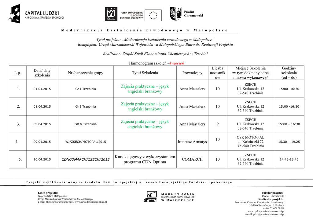 Powiat Chrzanowski M o d e r n i z a c j a k s z t a ł c e n i a z a w o d o w e g o w M a ł o p o l s c e Tytuł projektu: „Modernizacja kształcenia zawodowego w Małopolsce” Beneficjent: Urząd Marszałkowski Województwa Małopolskiego, Biuro ds. Realizacji Projektu Realizator: Zespół Szkół Ekonomiczno-Chemicznych w Trzebini Harmonogram szkoleń –kwiecień L.p. Data/ daty szkolenia Nr /oznaczenie grupy Tytuł Szkolenia Prowadzący Liczba uczestnik ów Miejsce Szkolenia /w tym dokładny adres i nazwa wykonawcy/ Godziny szkolenia (od – do) 1. 01.04.2015 Gr I Trzebinia Zajęcia praktyczne – język angielski branżowy Anna Mastalerz 10 ZSECH Ul. Krakowska 12 32-540 Trzebinia 15:00 -16:30 2. 08.04.2015 Gr I Trzebinia Zajęcia praktyczne – język angielski branżowy Anna Mastalerz 10 ZSECH Ul. Krakowska 12 32-540 Trzebinia 15:00 -16:30 3. 09.04.2015 GR V Trzebinia Zajęcia praktyczne – język angielski branżowy Anna Mastalerz 9 ZSECH Ul. Krakowska 12 32-540 Trzebinia 15:00 – 16:30 09.04.2015 WJ/ZSECH/MOTOPAL/2015 OSK MOTO-PAL ul. Kościuszki 72 32 -540 Trzebinia 15.30 – 19.25 10.04.2015 CDNCOMARCH/ZSECH/2015 ZSECH Ul. Krakowska 12 32-540 Trzebinia 14.45-18.45 4. 5. Ireneusz Armatys Kurs księgowy z wykorzystaniem programu CDN Optima COMARCH 10 10 Projekt współfinansowany ze środków Unii Europejskiej w ramach Europejskiego Funduszu Społecznego Lider projektu: Województwo Małopolskie Urząd Marszałkowski Województwa Małopolskiego e-mail: [email protected], www.zawodowamalopolska.pl Partner projektu: Powiat Chrzanowski Realizator projektu: Powiatowe Centrum Kształcenia Ustawicznego 32-500 Chrzanów, ul. F. Focha 3, tel/fax.32 624 00 18, www. pcku.powiat-chrzanowski.pl e-mail: [email protected] Powiat Chrzanowski M o d e r n i z a c j a 6. 11.04.2015 7. 11.04.2015r. CDNCOMARCH/ZSECH/2015 8. 11.04.2015 WJ/ZSECH/MOTOPAL/2015 9. 13.04.2015 WJ/ZSECH/MOTOPAL/2015 15.04.2015 GR V Trzebinia 15.04.2015 WJ/ZSECH/MOTOPAL/2015 12. 15.04.2015 WJ/ZSECH/MOTOPAL/2015 13. 16.04.2015 GR V Trzebinia 16.04.2015 WJ/ZSECH/MOTOPAL/2015 10. 11. 14. k s z t a ł c e n i a z a w o d o w e g o w M a ł o p o l s c e Kurs księgowy z wykorzystaniem programu CDN Optima COMARCH 10 Kurs florysta Katarzyna Skurzyńska 6 Kierowca - operator wózków jezdniowych, wózków naładownych, ciągnikowych i podnośnikowych z napędem silnikowym wraz z Kierowca - operator wózków bezpieczną wymianą butli gazowej” jezdniowych, wózków naładownych, ciągnikowych i podnośnikowych z napędem silnikowym wraz z bezpieczną butli gazowej” Zajęcia wymianą praktyczne – język angielski branżowy Kierowca - operator wózków jezdniowych, wózków naładownych, ciągnikowych i podnośnikowych z napędem silnikowym wraz z Kierowca - operator wózków bezpieczną wymianą butli gazowej” jezdniowych, wózków naładownych, ciągnikowych i podnośnikowych z napędem silnikowym wraz z bezpieczną butli gazowej” Zajęcia wymianą praktyczne – język angielski branżowy Kierowca - operator wózków jezdniowych, wózków naładownych, ciągnikowych i podnośnikowych z napędem silnikowym wraz z bezpieczną wymianą butli gazowej” Ireneusz Armatys 10 Ireneusz Armatys 10 Anna Mastalerz 9 Rafał Stroiński 5 Rafał Stroiński 5 Anna Mastalerz 9 Ireneusz Armatys 10 ZSECH Ul. Krakowska 12 32-540 Trzebinia 09.30-13.30 Kwiaciarnia Nerina Ul. Armii Krajowej 44 43-600 Jaworzno 9:00 – 15.30 OSK MOTO-PAL ul. Kościuszki 72 32 -540 Trzebinia OSK MOTO-PAL ul. Kościuszki 72 32 -540 Trzebinia ZSECH Ul. Krakowska 12 32-540 Trzebinia OSK MOTO-PAL ul. Głowackiego 1 32 -540 Trzebinia OSK MOTO-PAL ul. Głowackiego 1 32 -540 Trzebinia ZSECH Ul. Krakowska 12 32-540 Trzebinia OSK MOTO-PAL ul. Kościuszki 72 32 -540 Trzebinia 9.00 – 12.55 15.30 – 19.25 15:00 – 16:30 15.00 – 18.00 Grupa 1 18.00 – 21.00 Grupa 2 15:00 – 16:30 15.30 – 19.25 Projekt współfinansowany ze środków Unii Europejskiej w ramach Europejskiego Funduszu Społecznego Lider projektu: Województwo Małopolskie Urząd Marszałkowski Województwa Małopolskiego e-mail: [email protected], www.zawodowamalopolska.pl Partner projektu: Powiat Chrzanowski Realizator projektu: Powiatowe Centrum Kształcenia Ustawicznego 32-500 Chrzanów, ul. F. Focha 3, tel/fax.32 624 00 18, www. pcku.powiat-chrzanowski.pl e-mail: [email protected] Powiat Chrzanowski M o d e r n i z a c j a k s z t a ł c e n i a z a w o d o w e g o w M a ł o p o l s c e 17.04.2015 CDNCOMARCH/ZSECH/2015 Kurs księgowy z wykorzystaniem programu CDN Optima COMARCH 10 16. 18.04.2015 CDNCOMARCH/ZSECH/2015 Kurs księgowy z wykorzystaniem programu CDN Optima COMARCH 10 17. 18.04.2015 Kurs florysta Katarzyna Skurzyńska 6 Ireneusz Armatys 10 Ireneusz Armatys 10 Anna Mastalerz 9 Rafał Stroiński 11 Rafał Stroiński 10 Anna Mastalerz 9 15. 18.04.2015 WJ/ZSECH/MOTOPAL/2015 19. 20.04.2015 WJ/ZSECH/MOTOPAL/2015 20. 22.04.2015 GR V Trzebinia 21. 22.04.2015 WJ/ZSECH/MOTOPAL/2015 22. 22.04.2015 WJ/ZSECH/MOTOPAL/2015 23.04.2015 GR V Trzebinia 18. 23. Kierowca - operator wózków jezdniowych, wózków naładownych, ciągnikowych i podnośnikowych z napędem silnikowym wraz z Kierowca - operator wózków bezpieczną wymianą butli gazowej” jezdniowych, wózków naładownych, ciągnikowych i podnośnikowych z napędem silnikowym wraz z bezpieczną butli gazowej” Zajęcia wymianą praktyczne – język angielski branżowy Kierowca - operator wózków jezdniowych, wózków naładownych, ciągnikowych i podnośnikowych z napędem silnikowym wraz z Kierowca - operator wózków bezpieczną wymianą butli gazowej” jezdniowych, wózków naładownych, ciągnikowych i podnośnikowych z napędem silnikowym wraz z bezpieczną butli gazowej” Zajęcia wymianą praktyczne – język angielski branżowy ZSECH Ul. Krakowska 12 32-540 Trzebinia ZSECH Ul. Krakowska 12 32-540 Trzebinia Kwiaciarnia Nerina Ul. Armii Krajowej 44 43-600 Jaworzno OSK MOTO-PAL ul. Kościuszki 72 32 -540 Trzebinia OSK MOTO-