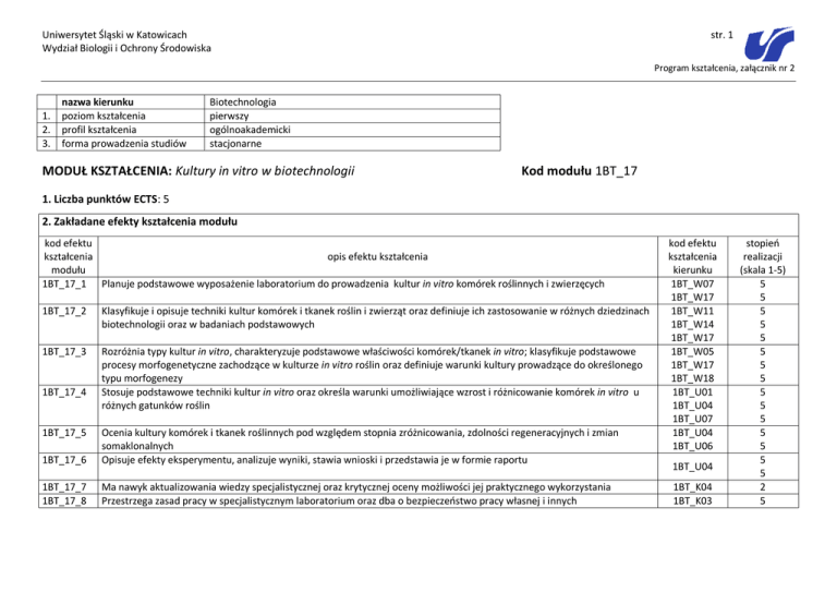 Uniwersytet Śląski w Katowicach Wydział Biologii i Ochrony Środowiska str. 1 Program kształcenia, załącznik nr 2 1. 2. 3. nazwa kierunku poziom kształcenia profil kształcenia forma prowadzenia studiów Biotechnologia pierwszy ogólnoakademicki stacjonarne MODUŁ KSZTAŁCENIA: Kultury in vitro w biotechnologii Kod modułu 1BT_17 1. Liczba punktów ECTS: 5 2. Zakładane efekty kształcenia modułu kod efektu kształcenia opis efektu kształcenia modułu 1BT_17_1 Planuje podstawowe wyposażenie laboratorium do prowadzenia kultur in vitro komórek roślinnych i zwierzęcych 1BT_17_2 Klasyfikuje i opisuje techniki kultur komórek i tkanek roślin i zwierząt oraz definiuje ich zastosowanie w różnych dziedzinach biotechnologii oraz w badaniach podstawowych 1BT_17_3 Rozróżnia typy kultur in vitro, charakteryzuje podstawowe właściwości komórek/tkanek in vitro; klasyfikuje podstawowe procesy morfogenetyczne zachodzące w kulturze in vitro roślin oraz definiuje warunki kultury prowadzące do określonego typu morfogenezy Stosuje podstawowe techniki kultur in vitro oraz określa warunki umożliwiające wzrost i różnicowanie komórek in vitro u różnych gatunków roślin 1BT_17_4 1BT_17_5 1BT_17_6 Ocenia kultury komórek i tkanek roślinnych pod względem stopnia zróżnicowania, zdolności regeneracyjnych i zmian somaklonalnych Opisuje efekty eksperymentu, analizuje wyniki, stawia wnioski i przedstawia je w formie raportu 1BT_17_7 1BT_17_8 Ma nawyk aktualizowania wiedzy specjalistycznej oraz krytycznej oceny możliwości jej praktycznego wykorzystania Przestrzega zasad pracy w specjalistycznym laboratorium oraz dba o bezpieczeństwo pracy własnej i innych kod efektu kształcenia kierunku 1BT_W07 1BT_W17 1BT_W11 1BT_W14 1BT_W17 1BT_W05 1BT_W17 1BT_W18 1BT_U01 1BT_U04 1BT_U07 1BT_U04 1BT_U06 1BT_U04 1BT_K04 1BT_K03 stopień realizacji (skala 1-5) 5 5 5 5 5 5 5 5 5 5 5 5 5 5 5 2 5 Uniwersytet Śląski w Katowicach Wydział Biologii i Ochrony Środowiska str. 2 Program kształcenia, załącznik nr 2 3. Opis modułu Opis Wymagania wstępne modułu Moduł przekazuje specjalistyczną wiedzę z zakresu kultur komórek i tkanek roślin i zwierząt; zapoznaje studenta z zasadami pracy w warunkach sterylnych oraz wymogami i specyfiką laboratorium do kultur in vitro tkanek roślinnych i zwierzęcych. Szczególny nacisk położony jest na opanowanie różnych metod kultur in vitro komórek/tkanek roślin oraz poznanie możliwości ich praktycznego wykorzystania, w tym w hodowli roślin. Ponadto przedstawiana jest biologia kultur komórek zwierzęcych oraz omawiane są możliwości ich wykorzystania w biotechnologii medycznej. W przeprowadzonych samodzielnie eksperymentach student nabywa umiejętności pracy w warunkach aseptycznych, opanowuje technikę zakładania, utrzymywania, monitorowania i analizy kultur roślinnych; zbiera dane empiryczne oraz doskonali umiejętność analizy i interpretacji wyników przeprowadzonych obserwacji. Wiedza z botaniki, zoologii i fizjologii na poziomie liceum 4. Sposoby weryfikacji efektów kształcenia modułu kod nazwa (typ) sposobu opis szczegółowy weryfikacji 1BT_17_w_1 Kolokwium zaliczeniowe Pisemna praca sprawdzająca stopień zrozumienia, opanowania wiadomości i umiejętności nabytych w czasie laboratoriów oraz zagadnienia omawiane w trakcie wykładów. 1BT_17_w_2 Ocena ciągła umiejętności ocena przestrzegania zasad pracy w specjalistycznym laboratorium, w tym praktycznych zachowania aseptyczności warunków pracy; ocena umiejętności przeprowadzenia eksperymentu oraz obserwacji i wyciągania wniosków 1BT_17_w_3 Raport z pracy laboratoryjnej Student przygotowuje raport opisujący sposób, efekty i wnioski z przeprowadzonego doświadczenia efekt(-y) kształcenia modułu 1BT_17_1; 1BT_17_2; 1BT_17_3; 1BT_17_4; 1BT_17_5 1BT_17_6; 1BT_17_7; 1BT_17_8 1BT_17_5; 1BT_17_6 5. Formy prowadzenia zajęć nazwa 1BT_17_fs_1 wykład forma prowadzenia zajęć opis (z uwzględnieniem metod dydaktycznych) wykład wybranych zagadnień z wykorzystaniem liczba godzin 15 praca własna studenta Opis praca z podręcznikiem, lektura liczba godzin 30 sposób weryfikacji efektów kształcenia 1BT_17_w_4 punkty ECTS 2 Uniwersytet Śląski w Katowicach Wydział Biologii i Ochrony Środowiska str. 3 Program kształcenia, załącznik nr 2 pomocy audiowizualnych - prezentacje komputerowe ilustrujące omawiane zagadnienia. 1BT_17_fs_2 laboratorium Praca pod nadzorem prowadzącego wykonywanie doświadczeń na podstawie instrukcji, analiza uzyskanych wyników konsultacje indywidualna praca ze studentem nad przygotowaniem raportu z pracy laboratoryjnej suma godzin: uzupełniająca 45 Przyswojenie wiedzy z wykładów, praca z podręcznikiem, lektura uzupełniająca 30 1BT_17_w_1 1BT_17_w_2 1BT_17_w_3 1BT_17_3 3 60 suma godzin: 60 suma punktów: 5