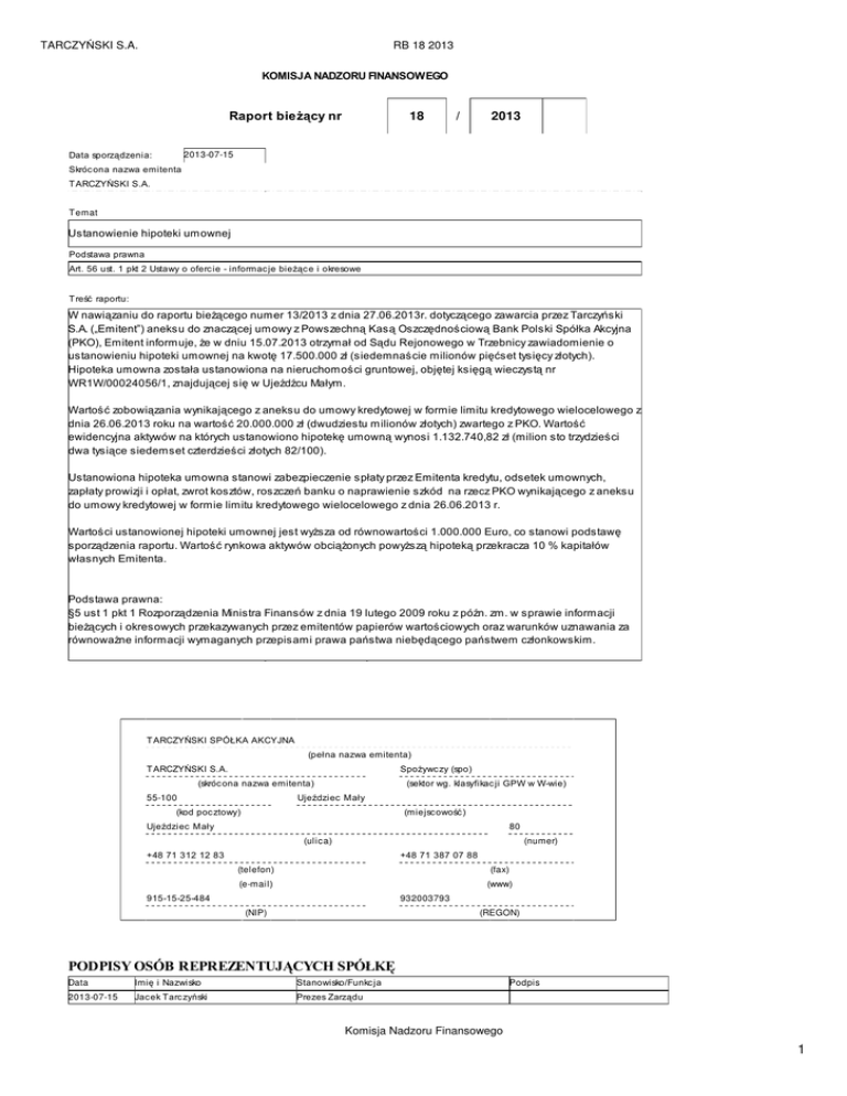 TARCZYŃSKI S.A. RB 18 2013 KOMISJA NADZORU FINANSOWEGO Raport bieżący nr 18 / 2013 2013-07-15 Data sporządzenia: Skróc ona nazwa emitenta TARCZYŃSKI S.A. Temat Ustanowienie hipoteki umownej Podstawa prawna Art. 56 ust. 1 pkt 2 Ustawy o oferc ie - informac je bieżąc e i okresowe Treść raportu: W nawiązaniu do raportu bieżącego numer 13/2013 z dnia 27.06.2013r. dotyczącego zawarcia przez Tarczyński S.A. („Emitent”) aneksu do znaczącej umowy z Powszechną Kasą Oszczędnościową Bank Polski Spółka Akcyjna (PKO), Emitent informuje, że w dniu 15.07.2013 otrzymał od Sądu Rejonowego w Trzebnicy zawiadomienie o ustanowieniu hipoteki umownej na kwotę 17.500.000 zł (siedemnaście milionów pięćset tysięcy złotych). Hipoteka umowna została ustanowiona na nieruchomości gruntowej, objętej księgą wieczystą nr WR1W/00024056/1, znajdującej się w Ujeźdźcu Małym. Wartość zobowiązania wynikającego z aneksu do umowy kredytowej w formie limitu kredytowego wielocelowego z dnia 26.06.2013 roku na wartość 20.000.000 zł (dwudziestu milionów złotych) zwartego z PKO. Wartość ewidencyjna aktywów na których ustanowiono hipotekę umowną wynosi 1.132.740,82 zł (milion sto trzydzieści dwa tysiące siedemset czterdzieści złotych 82/100). Ustanowiona hipoteka umowna stanowi zabezpieczenie spłaty przez Emitenta kredytu, odsetek umownych, zapłaty prowizji i opłat, zwrot kosztów, roszczeń banku o naprawienie szkód na rzecz PKO wynikającego z aneksu do umowy kredytowej w formie limitu kredytowego wielocelowego z dnia 26.06.2013 r. Wartości ustanowionej hipoteki umownej jest wyższa od równowartości 1.000.000 Euro, co stanowi podstawę sporządzenia raportu. Wartość rynkowa aktywów obciążonych powyższą hipoteką przekracza 10 % kapitałów własnych Emitenta. Podstawa prawna: §5 ust 1 pkt 1 Rozporządzenia Ministra Finansów z dnia 19 lutego 2009 roku z późn. zm. w sprawie informacji bieżących i okresowych przekazywanych przez emitentów papierów wartościowych oraz warunków uznawania za równoważne informacji wymaganych przepisami prawa państwa niebędącego państwem członkowskim. TARCZYŃSKI SPÓŁKA AKCYJNA (pełna nazwa emitenta) TARCZYŃSKI S.A. Spożywc zy (spo) (skróc ona nazwa emitenta) 55-100 (sektor wg. klasyfikac ji GPW w W-wie) Ujeździec Mały (kod poc ztowy) (miejscowość) 80 Ujeździec Mały (ulica) (numer) +48 71 312 12 83 +48 71 387 07 88 (telefon) (fax) (e-mail) (www) 932003793 915-15-25-484 (NIP) (REGON) PODPISY OSÓB REPREZENTUJĄCYCH SPÓŁKĘ Data Imię i Nazwisko Stanowisko/Funkc ja 2013-07-15 Jacek Tarc zyński Prezes Zarządu Podpis Komisja Nadzoru Finansowego 1 TARCZYŃSKI S.A. RB 18 2013 Komisja Nadzoru Finansowego 2