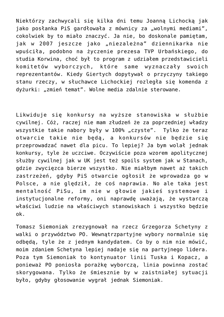 Niektórzy zachwycali się kilka dni temu Joanną Lichocką jak jako posłanka PiS gardłowała z mównicy za „wolnymi mediami”, cokolwiek by to miało znaczyć. Ja nie, bo doskonale pamiętam, jak w 2007 jeszcze jako „niezależna” dziennikarka nie wpuściła, podobno na życzenie prezesa TVP Urbańskiego, do studia Korwina, choć był to program z udziałem przedstawicieli komitetów wyborczych, które same wyznaczały swoich reprezentantów. Kiedy Giertych dopytywał o przyczyny takiego stanu rzeczy, w słuchawce Lichockiej rozległa się komenda z dyżurki: „zmień temat”. Wolne media zdalnie sterowane. Likwiduje się konkursy na wyższe stanowiska w służbie cywilnej. Cóż, raczej nie mam złudzeń że za poprzedniej władzy wszystkie takie nabory były w 100% „czyste”. Tylko że teraz otwarcie takie nie będą, a konkursów nie będzie się przeprowadzać nawet dla picu. To lepiej? Ja bym wolał jednak konkursy, tyle że uczciwe. Oczywiście poza wzorem apolitycznej służby cywilnej jak w UK jest też spoils system jak w Stanach, gdzie zwycięzca bierze wszystko. Nie miałbym nawet aż takich zastrzeżeń, gdyby PiS otwarcie ogłosił że wprowadza go w Polsce, a nie ględził, że coś naprawia. No ale taka jest mentalność PiSu, im nie w głowie jakieś systemowe i instytucjonalne reformy, oni naprawdę uważają, że wystarczą właściwi ludzie na właściwych stanowiskach i wszystko będzie ok. Tomasz Siemoniak zrezygnował na rzecz Grzegorza Schetyny z walki o przywództwo PO. Wewnątrzpartyjne wybory normalnie się odbędą, tyle że z jednym kandydatem. Co by o nim nie mówić, moim zdaniem Schetyna lepiej nadaje się na partyjnego lidera. Poza tym Siemoniak to kontynuator linii Tuska i Kopacz, a ponieważ PO poniosła porażkę wyborczą, linia powinna zostać skorygowana. Tylko że śmiesznie by w zaistniałej sytuacji było, gdyby głosowanie wygrał jednak Siemoniak.
