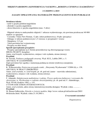 MIĘDZYNARODOWA KONFERENCJA NAUKOWA „RODZINA CENIONA I ZAGROŻONA” 2 CZERWCA 2015 ZASADY OPRACOWANIA MATERIAŁÓW PRZEZNACZONYCH DO PUBLIKACJI Struktura tekstu: - tytuł w języku polskim/angielskim - abstrakt w języku angielskim - słowa kluczowe w języku angielskim (max. 5 słów) Objętość tekstu to maksymalnie objętość 1 arkusza wydawniczego, nie powinna przekraczać 40 000 znaków ze spacjami · Czcionka: Times New Roman, 12 pkt. (tekst podstawowy), 10 pkt. (przypisy) · Odstępy w tekście podstawowym 1,5 wiersza; w przypisach 1 wiersz · Marginesy: 2,5 cm · Tekst powinien być wyjustowany · Przypisy na dole strony Sposób sporządzania przypisów: · Przypisy sporządzane są w formie przecinkowej wg obowiązującego wzoru: DRUK ZWARTY (książka): Autor, tytuł książki, wydawnictwo, miejsce i rok wydania, strona (strony). Przykład: M. Nowak, Podstawy pedagogiki otwartej, Wyd. KUL, Lublin 2001, s. 5. ARTYKUŁ W CZASOPIŚMIE: Zapis powinien być zgodny z numeracją podaną na stronie tytułowej czasopisma. Przykład: K. Wilkoszewska, Estetyczna przygoda sztuki, „Horyzonty Wychowania“ 3/2004 (6), s. 158. ARTYKUŁ W PRACY ZBIOROWEJ: Autor, tytuł artykułu, w: tytuł książki, pr. zb. pod red. (autor – nazwisko odmienione), wydawnictwo, miejsce i rok wydania, strona (strony). Przykład: F. Adamski, Sekularyzacja małżeństwa i rodziny. Proces społeczno-kulturowy i wyzwanie dla chrześcijan, w: Wychowanie w rodzinie chrześcijańskiej, pr. zb. pod red. F. Adamskiego, Wyd. WAM, Kraków 1982, s. 155. CYTOWANIE STRON INTERNETOWYCH: Autor, tytuł artykułu, adres strony internetowej (ścieżka dostępu). Wydruk z dnia ............ . Przykład: M. Braun-Gałkowska, Dziecko w świecie mediów, http://www.vulcan.pl/eid/archiwum/2003/ 06/dziecko.html. Wydruk z dnia 21.10.2003 r. Z wyrazami szacunku! Organizatorzy