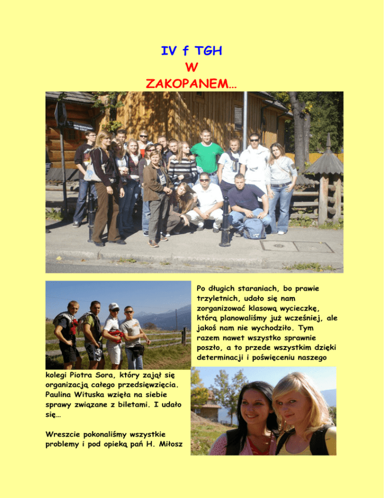 IV f TGH W ZAKOPANEM… Po długich staraniach, bo prawie trzyletnich, udało się nam zorganizować klasową wycieczkę, którą planowaliśmy już wcześniej, ale jakoś nam nie wychodziło. Tym razem nawet wszystko sprawnie poszło, a to przede wszystkim dzięki determinacji i poświęceniu naszego kolegi Piotra Sora, który zajął się organizacją całego przedsięwzięcia. Paulina Wituska wzięła na siebie sprawy związane z biletami. I udało się… Wreszcie pokonaliśmy wszystkie problemy i pod opieką pań H. Miłosz i M. Grabowskiej wyruszyliśmy nocnym pociągiem do… stolicy polskich Tatr. No cóż…podróż do najłatwiejszych nie należała, ale szczęśliwie dotarliśmy na miejsce. W Zakopanem i okolicach spędziliśmy trzy dni, od 24 IX do 26 IX. Wrażeń i emocji było co niemiara, bawiliśmy się znakomicie, a przede wszystkim dopisała nam pogoda, było prześlicznie. Mieszkaliśmy w przeuroczym pensjonacie „ Cztery pory roku” w Kościelisku. Pierwszego dnia zaraz po śniadaniu wyruszyliśmy na górską wędrówkę z Kościeliska przez Butorowy na Gubałówkę, potem zjazd wyciągiem krzesełkowym z Szymoszkowej do Zakopanego i powrót do Kościeliska. Przeszliśmy pieszo ok. 15 km., wrażeń mieliśmy wiele, bo wokół piękne, górskie krajobrazy i mieniąca się kolorami jesieni tatrzańska przyroda. Następnego dnia zwiedzanie Zakopanego, atrakcji również moc, a wieczorem grill i dyskoteka. Dzień był tak wyczerpujący, że niektórzy z nas mocno znużeni wrażeniami, zabawą i upojeni górskim powietrzem zasnęli jak zabici… dopiero o 3 nad ranem. Trzeciego dnia wyprawa do Doliny Kościeliskiej, piękny spacer wzdłuż wartkiego, górskiego potoku i zwiedzanie Jaskini Mroźnej. A po południu przygotowanie do powrotu do Warszawy. I znowu nocna podróż pociągiem. Wyjeżdżając z Zakopanego bardzo żałowaliśmy, że nasza wyprawa trwała tak krótko, chętnie zostalibyśmy jeszcze trochę, chociaż parę dni dłużej, a tu trzeba było wracać. No cóż, wszystko, co piękne trwa krótko. … .. Leżakowanie (po lewej stronie).Poniżej traperzy na górskim szlaku. Śniadanie na trawie… Śladami wielkich pokonujemy wszystkie mosty… ZAKOPANE, ZAKOPANE…. Góry znane i kochane… Kraina szczęścia taka- dla każdego Polaka! Zdjęcia i materiał merytoryczny –Halina Miłosz Opracowanie graficzne- Ewa Bielak