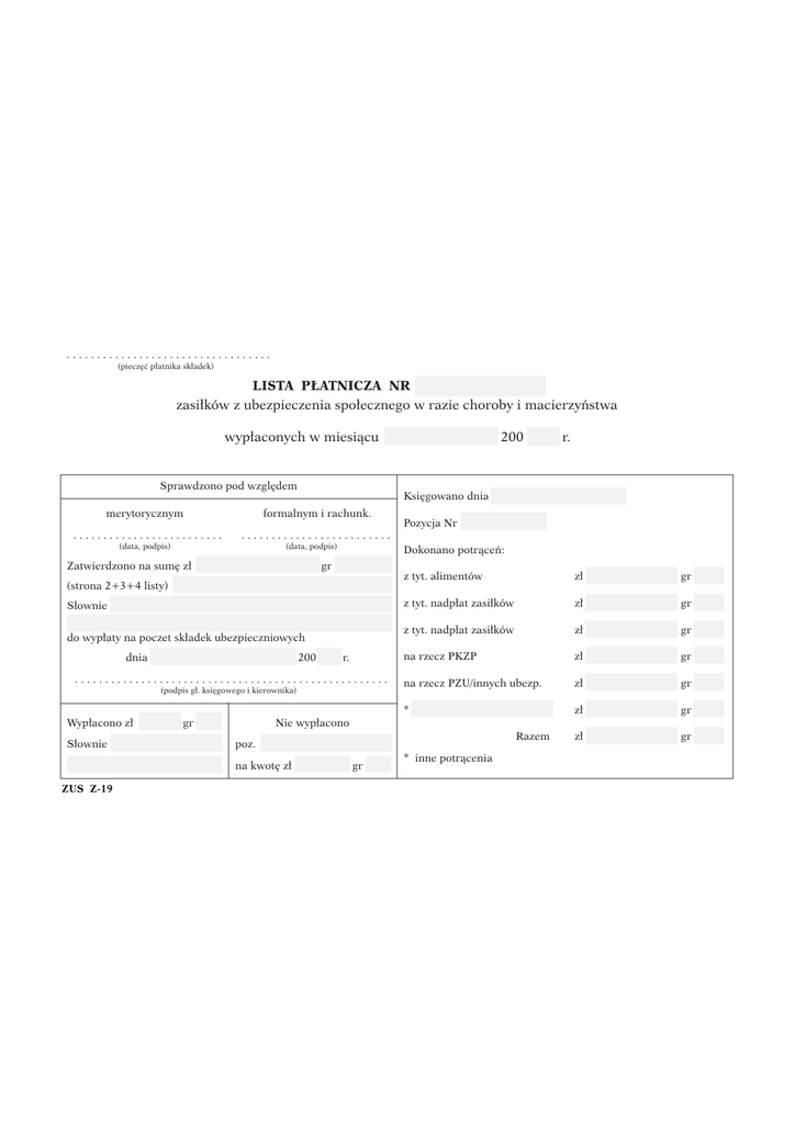 .................................. (piecz´ç p∏atnika sk∏adek) LISTA P¸ATNICZA NR . . . . . . . . . . . . . . . . . zasi∏ków z ubezpieczenia spo∏ecznego w razie choroby i macierzyƒstwa wyp∏aconych w miesiàcu . . . . . . . . . . . . . . . 200 . . . . r. Sprawdzono pod wzgl´dem Ksi´gowano dnia . . . . . . . . . . . . . . . . . . . . . . merytorycznym formalnym i rachunk. ......................... ......................... (data, podpis) (data, podpis) Pozycja Nr . . . . . . . . . . . . . . Dokonano potràceƒ: Zatwierdzono na sum´ z∏ . . . . . . . . . . . . . . . . . . . . gr . . . . . . . . . z tyt. alimentów z∏ . . . . . . . . . . . . . . . gr . . . . . S∏ownie . . . . . . . . . . . . . . . . . . . . . . . . . . . . . . . . . . . . . . . . . . . . . . z tyt. nadp∏at zasi∏ków z∏ . . . . . . . . . . . . . . . gr . . . . . ..................................................... do wyp∏aty na poczet sk∏adek ubezpieczniowych z tyt. nadp∏at zasi∏ków z∏ . . . . . . . . . . . . . . . gr . . . . . na rzecz PKZP z∏ . . . . . . . . . . . . . . . gr . . . . . na rzecz PZU/innych ubezp. z∏ . . . . . . . . . . . . . . . gr . . . . . * ....................... z∏ . . . . . . . . . . . . . . . gr . . . . . Razem z∏ . . . . . . . . . . . . . . . gr . . . . . (strona 2+3+4 listy) . . . . . . . . . . . . . . . . . . . . . . . . . . . . . . . . . . . . dnia . . . . . . . . . . . . . . . . . . . . . . . . 200 . . . r. .................................................... (podpis g∏. ksi´gowego i kierownika) Wyp∏acono z∏ . . . . . . . gr . . . . Nie wyp∏acono S∏ownie . . . . . . . . . . . . . . . . . . poz. . . . . . . . . . . . . . . . . . . . . . ......................... na kwot´ z∏ . . . . . . . . . gr . . . . ZUS Z-19 * inne potràcenia Lp. 1 ZUS Z-19 Nazwisko i imi´ ubezpieczonego Rodzaj zasi∏ku Kwota brutto 2 3 4 Potràcenia rodzaj kwota 5 6 Podatek Okres Liczba dni 7 8 9 Kwota Pokwitowanie netto (data, podpis) 10 11 Lp. 1 ZUS Z-19 Nazwisko i imi´ ubezpieczonego Rodzaj zasi∏ku Kwota brutto 2 3 4 Potràcenia rodzaj kwota 5 6 Podatek Okres Liczba dni 7 8 9 Kwota Pokwitowanie netto (data, podpis) 10 11 Lp. 1 ZUS Z-19 Nazwisko i imi´ ubezpieczonego Rodzaj zasi∏ku Kwota brutto 2 3 4 Potràcenia rodzaj kwota 5 6 Podatek Okres Liczba dni 7 8 9 Kwota Pokwitowanie netto (data, podpis) 10 11