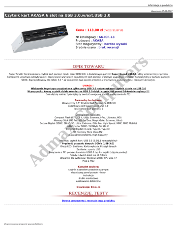 Informacje o produkcie Utworzono 07-03-2017 Czytnik kart AKASA 6 slot na USB 3.0,w/ext.USB 3.0 Cena : 113,00 zł (netto: 91,87 zł) te r s Nr katalogowy : AK-ICR-13 Producent : AKASA Stan magazynowy : bardzo wysoki Średnia ocena : brak recenzji Super Szybki Sześcioslotowy czytnik kart pamięci (podł. przez USB 3.0) z dodatkowym portem Super Speed USB3.0, który umieszczony z przodu komputera umożliwia odczytywanie i zapisywanie wszystkich popularnych kart pamięci w jednym wygodnym miejscu. Kompatybilny z kartami pamięci SDXC. Zaprojektowany dla zatoki 3,5 ". W komplecie dwa panele przednie, z możliwiścią wyboru koloru: czarnym lub białym. pu UWAGA ! Większość tego typu urządzeń ma tylko porty USB 3.0 natomiast sam czytnik działa na USB 2.0 W przypadku Akasy czytnik działa również na USB 3.0 dzięki czemu jest ponad 10-krotnie szybszy !!! ( nie daj się nabrać ! pamiętaj by zwrócić uwagę na sposób podłączania do PC) C om Parametry techniczne: Wewnętrzny 3.5" Czytnik Kart Pamięci na USB 3.0 Dodatkowy port Super Speed USB 3.0 Ilość slotów kart pamięci: 6 Ad m ax Obsługiwane typy kart: Compact Flash (CF I, CF II, Ultra, Extreme, I-Pro, Ultimate, MD) Memory Stick (MS Pro, MS Pro Duo, Magic Gate, Extreme, Ultra) Secure Digital (SDXC, SDHC, SD, Ultra, Extreme, Elite Pro, High Speed, MMC, MMC Mobile) 64GByte for SDXC / 32GByte for SDHC Extreme Digital (X card, Type H, Type M) M2 (Memory Stick Micro M2) microSD (microSDHC, High Capacity) Interfejs: czytnik kart: USB 3.0 (2.0/1.1 kompatybilny) Prędkość przesyłu danych: 5Gb/s (USB 3.0) Diody LED: Zasilanie, Karta wykryta, Przesył danych Zasilanie: z portu USB Połączenie z PC: poprzez konektor USB3.0 typ A - męski (zdjęcia poniżej) /każdy z dwóch kabli ma dł. 90cm/ Wsparcie dla systemów: Windows 2000/ XP / Visa / 7 Plug & Play Komplet zawiera: czytnik z panelem przednim czarnym dodatkowy panel przedni - biały instrukcja śrubki montażowe opakowanie detaliczne Gwarancja: 24 m-ce kod1014 Strona producenta / recenzje tego produktu Wygenerowano w programie www.oscGold.com