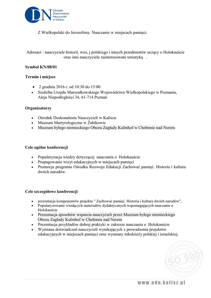 Z Wielkopolski do Jerozolimy. Nauczanie w miejscach pamięci. Adresaci : nauczyciele historii, wos, j polskiego i innych przedmiotów uczący o Holokauście oraz inni nauczyciele zainteresowani tematyką . Symbol KN/08/01 Termin i miejsce 2 grudnia 2016 r. od 10:30 do 15:00 Siedziba Urzędu Marszałkowskiego Województwa Wielkopolskiego w Poznaniu, Aleja Niepodległości 34, 61-714 Poznań Organizatorzy Ośrodek Doskonalenia Nauczycieli w Kaliszu Muzeum Martyrologiczne w Żabikowie Muzeum byłego niemieckiego Obozu Zagłady Kulmhof w Chełmnie nad Nerem Cele ogólne konferencji Popularyzacja wiedzy dotyczącej nauczania o Holokauście Propagowanie wizyt edukacyjnych w miejscach pamięci Promocja programu Ośrodka Rozwoju Edukacji Zachować pamięć. Historia i kultura dwóch narodów. Cele szczegółowe konferencji prezentacja komponentów projektu " Zachować pamięć. Historia i kultura dwóch narodów", Popularyzowanie wiodących materiałów dydaktycznych wspomagających nauczanie o Holokauście Prezentacja sposobów wsparcia nauczycieli przez Muzeum byłego niemieckiego Obozu Zagłady Kulmhof w Chełmnie nad Nerem Prezentacja przykładów dobrej praktyki w zakresie nauczania o Holokauście Wymiana doświadczeń nauczycieli wynikających z prowadzenia projektów edukacyjnych w miejscach pamięci oraz wymiany młodzieży polskiej i izraelskiej. www.odn.kalisz.pl Porządek konferencji l.p. godzina 1. 10:00-10:30 2. prowadzący wydarzenie Rejestracja uczestników ODN Kalisz Otwarcie Konferencji Marzena Wodzińska – członek Zarządu Województwa Wielkopolskiego Wiesława Araszkiewicz Zespół Szkół Nr 1 w Szamotułach 10:30-10:45 3. 10:45-11:15 Prezentacja programu Zachować pamięć. Historia i kultura dwóch narodów. 4. Zasady nauczania w miejscach pamięci. Jan Bartczak Dyrektor ODN Kalisz 11:15-11:45 11:45-12:15 Oferta edukacyjna Muzeum Martyrologicznego w Żabikowie Jacek Nawrocik, Renata Wełniak 5. 6. 12:15-12:45 Oferta edukacyjna Muzeum byłego niemieckiego Obozu Zagłady Kulmhof w Chełmnie nad Nerem dr Piotr Wąsowicz – dyrektor muzeum 7 12:45-13:00 Przerwa Panel Dyskusyjny www.odn.kalisz.pl 7. 13:00-13:30 Wizyty szkół w miejscach pamięci – przykłady dobrych praktyk Nauczyciele wielkopolskich szkół Nauczyciele wielkopolskich szkół Wiesława Araszkiewicz, Jan Bartczak 8. 13:30 – 14:00 Organizacja spotkań uczniów polskich i izraelskich – przykłady dobrych praktyk 9 14:00 – 14:20 Zakończenie Konferencji Kontakt : [email protected] 62 7676300, Rejestracja na konferencję na stronie www.odn.kalisz.pl w zakładce ISOS ( Internetowy System Obsługi Szkoleń ) Symbol szkolenia , KN/08/01 www.odn.kalisz.pl