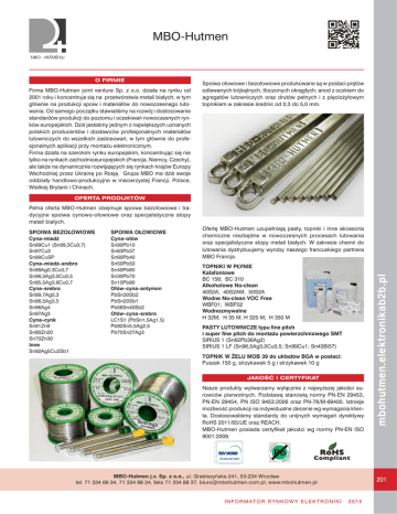 MBO-Hutmen OFIRMIE Firma MBO-Hutmen joint venture Sp. z o.o. działa na rynku od 2001 roku ikoncentruje się na przetwórstwie metali białych, wtym głównie na produkcji spoiw imateriałów do nowoczesnego lutowania. Od samego początku stawialiśmy na rozwój idostosowanie standardów produkcji do poziomu ioczekiwań nowoczesnych rynków europejskich. Dziś jesteśmy jednym znajwiększych uznanych polskich producentów i dostawców profesjonalnych materiałów lutowniczych do wszelkich zastosowań, wtym głównie do profesjonalnych aplikacji przy montażu elektronicznym. Firma działa na szerokim rynku europejskim, koncentrując się nie tylko na rynkach zachodnioeuropejskich (Francja, Niemcy, Czechy), ale także na dynamicznie rozwijających się rynkach krajów Europy Wschodniej przez Ukrainę po Rosję. Grupa MBO ma dziś swoje oddziały handlowo-produkcyjne w macierzystej Francji, Polsce, Wielkiej Brytanii iChinach. Spoiwa ołowiowe i bezołowiowe produkowane są w postaci prętów odlewanych trójkątnych, tłoczonych okrągłych, anod z oczkiem do agregatów lutowniczych oraz drutów pełnych i z pięciożyłowym topnikiem w zakresie średnic od 0,3 do 5,0 mm. OFERTA PRODUKTÓW Pełna oferta MBO-Hutmen obejmuje spoiwa bezołowiowe i tradycyjne spoiwa cynowo-ołowiowe oraz specjalistyczne stopy metali białych. SPOIWA OŁOWIOWE Cyna–miedź Sn99Cu1 (Sn99,3Cu0,7) Sn97Cu3 Sn99CuSP Cyna–miedź–srebro Sn99Ag0,3Cu0,7 Sn96,5Ag3,0Cu0,5 Sn95,5Ag3,8Cu0,7 Cyna–srebro Sn99,7Ag0,3 Sn96,5Ag3,5 Sn96Ag4 Sn97Ag3 Cyna–cynk Sn91Zn9 Sn80Zn20 Sn70Zn30 Inne Sn92Ag5Cu2Sb1 Cyna–ołów Sn90Pb10 Sn63Pb37 Sn60Pb40 Sn50Pb50 Sn40Pb60 Sn30Pb70 Sn10Pb90 Ołów–cyna–antymon PbSn30Sb2 PbSn20Sb1 Pb58Sn40Sb2 Ołów–cyna–srebro LC1S1 (PbSn1,5Ag1,5) Pb92Sn5,5Ag2,5 Pb70Sn27Ag3 Ofertę MBO-Hutmen uzupełniają pasty, topniki i inne akcesoria chemiczne niezbędne w nowoczesnych procesach lutowania oraz specjalistyczne stopy metali białych. W zakresie chemii do lutowania dystrybuujemy wyroby naszego francuskiego partnera MBO Francja. TOPNIKI W PŁYNIE Kalafoniowe BC 156; BC 310 Alkoholowe No-clean 40S2A; 40S2AM; 50S2A Wodne No-clean VOC Free WBF01; WBF02 Wodnozmywalne H 32M; H 35 M; H 325 M; H 350 M PASTY LUTOWNICZE typu fine pitch i super fine pitch do montażu powierzchniowego SMT SIRIUS 1 (Sn62Pb36Ag2) SIRIUS 1 LF (Sn96,5Ag3,0Cu0,5; Sn99Cu1; Sn43Bi57) TOPNIK W ŻELU MOB 39 do układów BGA w postaci: Puszek 150 g, strzykawek 5 g i strzykawek 10 g JAKOŚĆ ICERTYFIKAT Nasze produkty wytwarzamy wyłącznie z najwyższej jakości surowców pierwotnych. Podstawę stanowią normy PN-EN 29453, PN-EN 29454, PN ISO 9453:2006 oraz PN-76/M-69400. Istnieje możliwość produkcji na indywidualne zlecenie wg wymagania klienta. Dostosowaliśmy standardy do unijnych wymagań dyrektywy RoHS 2011/65/UE oraz REACH. MBO-Hutmen posiada certyfikat jakości wg normy PN-EN ISO 9001:2009. MBO-Hutmen j.v. Sp. zo.o., ul. Grabiszyńska 241, 53-234 Wrocław tel. 71334 86 34, 71334 88 34, faks 71334 88 37, [email protected], www.mbohutmen.pl I N F O R M AT O R R Y N KO W Y E L E K T R O N I K I mbohutmen.elektronikab2b.pl SPOIWA BEZOŁOWIOWE 201 2015