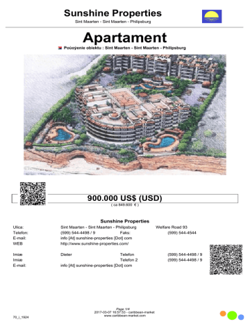 Sunshine Properties Sint Maarten - Sint Maarten - Philipsburg Apartament Poùoýenie obiektu : Sint Maarten - Sint Maarten - Philipsburg 900.000 US$ (USD) ( ca 849.600 € ) Sunshine Properties Ulica: Telefon: E-mail: WEB Sint Maarten - Sint Maarten - Philipsburg (599) 544-4498 / 9 Faks: info [At] sunshine-properties [Dot] com http://www.sunshine-properties.com/ Imiæ Imiæ E-mail: Dieter 70_i_1924 Telefon Telefon 2 info [At] sunshine-properties [Dot] com Page 1/4 2017-03-07 16:57:53 - caribbean-market www.caribbean-market.com Welfare Road 93 (599) 544-4544 (599) 544-4498 / 9 (599) 544-4498 / 9 Sunshine Properties Sint Maarten - Sint Maarten - Philipsburg Numer kodu Typ budynku Poùoýenie Materiaùy Property Address Powierzchnia dziaùki Firma Ýycie Kuchnia Sypialnie Zùy Opinie Toaleta 70_i_1924 Apartament Woda Ziemia Stein Cupecoy Beachfront Numer kodu Nr referencyjny Status objektet Rok Powierzchnia 1 1 2 2 Biznes Inne Usùugi Garaý Carport zadaszony taras Akcesoria Dzierýawa Taras Balkon Jetty Pokój Party Klimatyzacja Resort Ogród Pralnia Goràcy zadaszony taras ogrodzony / murem 70_i_1924 Page 2/4 2017-03-07 16:57:53 - caribbean-market www.caribbean-market.com 66 po uzgodnieniu Nowy Sunshine Properties Sint Maarten - Sint Maarten - Philipsburg 70_i_1924 Page 3/4 2017-03-07 16:57:53 - caribbean-market www.caribbean-market.com Sunshine Properties Sint Maarten - Sint Maarten - Philipsburg 70_i_1924 Page 4/4 2017-03-07 16:57:53 - caribbean-market www.caribbean-market.com
