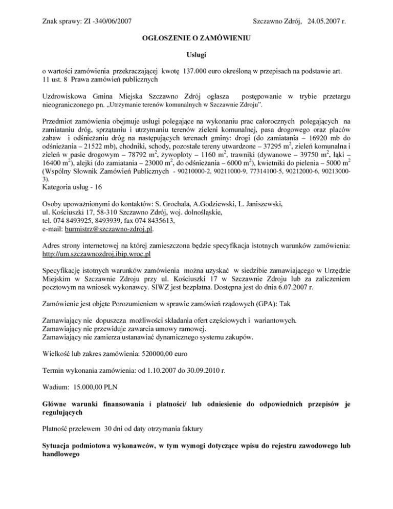 Znak sprawy: ZI -340/06/2007 Szczawno Zdrój, 24.05.2007 r. 2*à26=(1,(2=$0Ï:,(1,8 8VáXJL RZDUWR FL]DPyZLHQLDSU]HNUDF]DM FHMNZRW HXURRNUH ORQ ZSU]HSLV 11 ust. 8 ach na podstawie art. 3UDZD]DPyZLH SXEOLF]Q\FK 8]GURZLVNRZD *PLQD 0LHMVND 6]F]DZQR =GUyM RJáDV]D SRVW SRZDQLH Z WU\ELH SU]HWDUJX nieograniczonego pn. „Utrzymanie terenów komunalnych w Szczawnie Zdroju”. 3U]HGPLRW ]DPyZLHQLD REHMPXMH XVáXJL SROHJDM FH QD Z\NRQDQLX SUDF FDáRURF]Q\FK SROHJDM F\FK QD ]DPLDWDQLX GUyJ VSU] WDQLX L XWU]\PDQLX WHUHQyZ ]LHOHQL NRPXQDOQHM SDVD GURJRZHJR RUD] SODFyZ * – 16920 mb do – 37295 m2]LHOHNRPXQDOQDL 2 2 2 ]LHOH Z SDVLH GURJRZ\P – 78792 m *\ZRSáRW\ – 1160 m , trawniki (dywanowe – 39750 m áNL – 16400 m2), alejki (do zamiatania – 23000 m2GRRGQLH*DQLD– 6000 m2), kwietniki do pielenia – 5000 m2 :VSyOQ\ 6áRZQLN =DPyZLH 3XEOLF]Q\FK - 90210000-2, 90211000-9, 77314100-5, 90212000-6, 90213000- ]DEDZ L RG QLH DQLX GUyJ QD QDVW SXM F\FK WHUHQDFK JPLQ\ GURJL GR ]DPLDWDQLD * – RG QLH DQLD PEFKRGQLNLVFKRG\SR]RVWDáHWHUHQ\XWZDUG]RQH 3). .DWHJRULDXVáXJ - 16 * 2VRE\XSRZD QLRQ\PLGRNRQWDNWyZ6*URFKDOD$*RG]LHZVNL/-DQLV]HZVNL zki 17, 58-6]F]DZQR=GUyMZRMGROQROVNLH tel. 074 8493925, 8493939, fax 074 8435613, e-mail: [email protected]. XO.R FLXV $GUHV VWURQ\ LQWHUQHWRZHM QD NWyUHM ]DPLHV]F]RQD E G]LH VSHF\ILNDFMD LV totnych warunków zamówienia: http://um.szczawnozdroj.ibip.wroc.pl * 6SHF\ILNDFM LVWRWQ\FK ZDUXQNyZ ]DPyZLHQLD PR QD X]\VNDü Z VLHG]LELH ]DPDZLDM FHJR Z 8U] G]LH Miejskim w Szczawnie Zdroju przy ul. KoFLXV]NL Z 6]F]DZQLH =GURMX OXE ]D ]DOLF]HQLHP SRF]WRZ\PQDZQLRVHNZ\NRQDZF\6,:=MHVWEH]SáDWQD'RVW SQDMHVWGRGQLDU =DPyZLHQLHMHVWREM WH3RUR]XPLHQLHPZVSUDZLH]DPyZLH U] GRZ\FK*3$7DN * FLRZ\FKLZDULDQWRZ\FK =DPDZLDMF\QLH]DPLHU]DXVWDQDZLDüG\QDPLF]QHJRV\VWHPX]DNXSyZ =DPDZLDM F\QLHGRSXV]F]D PR OLZR FLVNáDGDQLDRIHUWF] =DPDZLDM F\QLHSU]HZLGXMH]DZDUFLDXPRZ\UDPRZHM :LHONR üOXE]DNUHV]DPyZLHQLDHXUR Termin wykonania zamówienia: od 1.10.2007 do 30.09.2010 r. Wadium: 15.000,00 PLN *áyZQH ZDUXQNL ILQDQVRZDQLD L SáDWQR FL OXE RGQLHVLHQLH GR RGSRZLHGQLFK SU]HSLVyZ MH UHJXOXM F\FK 3áDWQR üSU]HOHZHPGQLRGGDW\RWU]\PDQLDIDNWXU\ 6\WXDFMD SRGPLRWRZD Z\NRQDZFyZ Z W\P Z\PRJL GRW\F] FH ZSLVX handlowego do rejestru zawodowego lub ,QIRUPDFMHLIRUPDOQR FLNRQLHF]QHGRGRNRQDQLDRFHQ\VSHáQLHQLDZ\PRJyZ 2]DPyZLHQLHSXEOLF]QHPRJ XELHJDüVL Z\NRQDZF\ NWyU]\ QLHSRGOHJDM Z\NOXF]HQLXSRVW SRZDQLD o udzielenie zamówienia na podstawie art. 24XVWLXVWDZ\VSHáQLDMZ\PRJL]DZDUWHZDUWXVW ustawy: 1) SRVLDGDM XSUDZQLHQLD GR Z\NRQ\ZDQLD RNUHORQHM G]LDáDOQRFL OXE F]\QQRFL MH*HOL ustawy QDNáDGDM RERZL ]HNSRVLDGDQLDWDNLFKXSUDZQLH 2) z SRVLDGDM QLH]E GQ ZLHG] L GR ZLDGF]HQLH RUD G\VSRQXM SRWHQFMDáHP WHFKQLF]Q\P L osobami zdolnymi, do wykonania zamówienia; 3) 4) ]QDMGXM VL ZV\WXDFMLHNRQRPLF]QHMLILQDQVRZHM]DSHZQLDM FHMZ\NRQDQLH]DPyZLHQLD QLHSRGOHJDM Z\NOXF]HQLX]SRVW SRZDQLDRXG]LHOHQLH]DPyZLHQLD Wykaz dokumentów poWZLHUG]DMF\FKVSHáQLHQLHZDUXQNyZXG]LDáXZ SRVW SRZDQLX 2 ZLDGF]HQLH]JRGQLH]DUWXVW3UDZD]DPyZLH SXEOLF]Q\FK $NWXDOQ\ RGSLV ] ZáD FLZHJR UHMHVWUX DOER DNWXDOQHJR ]D ZLDGF]HQLD R ZSLVLH GR HZLGHQFML * G]LDáDOQR FL JRVSRGDUF]HM MH HOL RGU EQH SU]HSLV\ Z\PDJDM ZSLVX GR UHMHVWUX OXE ]JáRV]HQLD GR * HZLGHQFMLG]LDáDOQR FLJRVSRGDUF]HMZ\VWDZLRQHJRQLHZF]H QLHMQL PLHVL F\SU]HGXSá\ZHPWHUPLQX VNáDGDQLDZQLRVNyZRGRSXV]F]HQLHGRXG]LDáXZSRVW SRZDQLX RXG]LHOHQLH]DPyZLHQLD DOERVNáD dania ofert; $NWXDOQH]D ZLDGF]HQLDZáD FLZHJRQDF]HOQLNDXU] GXVNDUERZHJRRUD]ZáD FLZHJRRGG]LDáX=DNáDGX 6SRáHF]Q\FK OXE .DV\ 5ROQLF]HJR 8EH]SLHF]HQLD 6SRáHF]QHJR SRWZLHUG]DMF\FK *H Z\NRQDZFD QLH ]DOHJD ] RSáDFDQLHP SRGDWNyZ RSáDW RUD] VNáDGHN QD XEH]SLHF]HQLH ]GURZRWQH L VSRáHF]QH OXE ]DZLDGF]H *H X]\VNDá SU]HZLG]LDQH SUDZHP ]ZROQLHQLH RGURF]HQLH OXE UR]áR*HQLHQDUDW\]DOHJá\FKSáDWQRFLOXEZVWU]\PDQLHZFDáRFLZ\NRQDQLDGHF\]MLZáDFLZHJRRUJDQX– wystawionych niHZF]HQLHMQL*PLHVLFHSU]HGXSá\ZHPWHUPLQXVNáDGDQLDVNáDGDQLDRIHUW 8EH]SLHF]H RGSRZLHGQLR $NWXDOQD LQIRUPDFMD ] .UDMRZHJR 5HMHVWUX .DUQHJR Z ]DNUHVLH RNUH ORQ\P Z DUW XVW SNW * XVWDZ\Z\VWDZLRQHMQLHZF]H QLHMQL PLHVL F\SU]HGXSá\ZHPWHUPLQXVNáDGDQLD -8 ofert; $NWXDOQD LQIRUPDFMD ] .UDMRZHJR 5HMHVWUX .DUQHJR Z ]DNUHVLH RNUH ORQ\P Z DUW XVW SNW * XVWDZ\ Z\VWDZLRQHM QLH ZF]H QLHM QL PLHVL F\ SU]HG XSá\ZHP WHUPLQX VNáDGDQLD RIHUW MH OL dotyczy). 'DQH GRW\F] FH Z\NRQDZF\ QD SRWZLHUG]HQLH SRVLDGDQHM SU]H] QLHJR QLH]E GQHM * ZLHG]\ L GR ZLDGF]HQLD RUD] G\VSRQRZDQLX SRWHQFMDáHP WHFKQLF]Q\P D WDN H RVREDPL ]GROQ\PL GR Z\NRQDQLD zamówienia: Z\ND] SRWZLHUG]DM F\ Z\NRQDQLH XVáXJL ] RNUHVX RVWDWQLFK WU]HFK ODW SU]HG ZV]F] FLHP * SRVW SRZDQLD R XG]LHOHQLH ]DPyZLHQLD D MH HOL RNUHV SURZDG]HQLD G]LDáDOQR FL MHVW NUyWV]\ – tym w RNUHVLH RGSRZLDGDM FHM VZRLP URG]DMHP L ZDUWR FL XVáXJRP VWDQRZL F\P SU]HGPLRW ]DPyZLHQLD ] SRGDQLHP LFK ZDUWR FL * SU]HGPLRWX GDW Z\NRQDQLD L RGELRUFyZ * RUD] referencji ]Dá F]D SRWZLHUG]DM F\FK HXVáXJLWH]RVWDá\Z\NRQDQHQDOH \FLH LQIRUPDFMDQDWHPDWSU]HFL WQHMOLF]E\]DWUXGQLRQ\FKSUDFRZQLNyZZRNUHVLHRVWDWQLFKWU]HFKODWDZ SU]\SDGNXJG\RNUHVSURZDG]HQLDG]LDáDOQR FLMHVWNUyWV]\ – w tym okresie; 3) :\ND]QLH]E GQ\FKGRZ\NRQDQLD]DPyZLHQLDXU]G]H 3ROLVD OXE LQQ\ GRNXPHQW XEH]SLHF]HQLD SRWZLHUG]DM F\ *H Z\NRQDZFD MHVW XEH]SLHF]RQ\ RG RGSRZLHG]LDOQR FLF\ZLOQHMZ]DNUHVLHSURZDG]RQHMG]LDáDOQR FLJRVSRGDUF]HM (W przypadku wykonawców, którzy * * VNáDGDM RIHUW á F]Q =DPDZLDM F\ GRSXV]F]D PR OLZR ü ]áR HQLD SU]H]WHSRGPLRW\SROLV\Z\VWDZLRQHMá F]QLHQDWHSRGPLRW\ * 'DQH GRW\F] FH Z\NRQDZF\ SRWZLHUG]DM FH H ]QDMGXMHVL RQ Z V\WXDFML HNRQRPLF]QHM LILQDQVRZHM ienia. ]DSHZQLDM FHMZ\NRQDQLH]DPyZ *H SROLVD OXE LQQ\ GRNXPHQW XEH]SLHF]HQLD SRWZLHUG]DM F\ RGSRZLHG]LDOQR FL F\ZLOQHM Z ]DNUHVLH SURZDG]RQHM SRGPLRW\SROLV\Z\VWDZLRQHMáF]QLHQDWHSRGPLRW\ Z\NRQDZFD MHVW XEH]SLHF]RQ\ RG G]LDáDOQR FL JRVSRGDUF]HM * : SU]\SDGNX * Z\NRQDZFyZ NWyU]\ VNáDGDM RIHUW á F]Q =DPDZLDM F\ GRSXV]F]D PR OLZR ü ]áR HQLD SU]H] WH :\NRQDZF\ PDM F\ VLHG]LE OXE PLHMVFH ]DPLHV]NDQLD SR]D WHU\WRULXP 5]HF]SRVSROLWHM 3ROVNLHM zamiast dokument