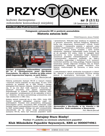 PRZYS T A NEK nr 3 (111) kultowe darmopismo miłośników komunikacji miejskiej 18 kwietnia 2010 r. www.kmps.org.pl/przystanek ISSN 1730-6388 Pożegnanie autosanów H9 w powiecie poznańskim Historia zatacza koło Witold Karpowicz, Janusz Podolak Przejazd pożegnalny realizowaliśmy autosanem H9 nr 4, udostępnionym przez Eko-Rondo Puszczykowo. Na zdjęciu: autobus na kilka minut przed rozpoczęciem imprezy, na pętli Dębiec. Fot.: Marcin Jurczak i sprawdzonym. Wskutek tego autobusy te pojawiły się w gminach: Komorniki, Tarnowo Podgórne, Rokietnica, Suchy Las, Kleszczewo, Puszczykowo i Kórnik. Proste w obsłudze i niezawodne pojazdy z upływem czasu poddano modernizacjom i remontom, podczas których wymieniano nawet ściany przednie i tylne tychże autobusów. Popularne hadziewiątki nieźle trzymały się aż do początku XXI wieku, kiedy to nastąpiło duże poruszenie na rynku autobusów dzięki dostawom używanych pojazdów niskopodłogowych z Niemiec. U przewoźników stopniowo pojawiały się MAN-y i mercedesy, wygrywając z Autosanem m.in. wyższym komfortem podróży czy niską podłogą. Pojazdy krajowej konstrukcji zaczęły odgrywać mniejszą rolę na liniach podmiejskich, obsługując przede wszystkim linie lokalne, niedocierające do Poznania, a także kursy szkolne. Z kilkudziesięciu takich autobusów kursujących w latach 90., obecnie w powiecie poznańskim fizycznie istnieje jeszcze 5 egzemplarzy harmonijek. Dwa z nich Historię autobusów Autosan H9-35 w naszym mieście i okolicach można podzielić na dwa etapy. W roku 1976 autobusy te pojawiły się w MPK Poznań i zaczęły obsługiwać linie typowo miejskie. Szybko jednak okazało się, iż są one zbyt mało pojemne w stosunku do lokalnych warunków oraz popytu pasażerskiego. Poskutkowało to szybkim wycofaniem większej ilości tych pojazdów i przekazaniem ich do oddziałów w Kórniku i Gnieźnie. Ze stanu poznańskiego przewoźnika zniknęły ostatecznie w 1981 roku. Kolejny epizod rozpoczął się w roku 1991, kiedy MPK Poznań przestało obsługiwać znaczną część linii podmiejskich. Powstali nowi przewoźnicy, obsługujący poszczególne gminy. Oczywiście MPK przekazało część swojego taboru nowopowstałym firmom, jednak nie była to ilość wystarczająca. Dlatego też paru przewoźników zdecydowało się na zakup wciąż produkowanego autosana H9-35, który był wówczas pojazdem tanim Harmonijka z Eko-Rondo, w tle klamka z ZK Kleszczewo. Pętla autobusowa w Kleszczewie. Fot.: Marcin Jurczak Ratujmy Stare Bimby! Przekaż 1% podatku na ratowanie zabytkowych pojazdów! Klub Miłośników Pojazdów Szynowych, KRS nr 0000074961 3/2010 (11 1) 1/10 Klubowicze w akcji / Nowinki z Pyrogrodu to autobusy wycofane z eksploatacji po zakończeniu działalności firmy Mistral, oczekujące na sprzedaż. Taką samą ilość tych pojazdów posiada firma Eko-Rondo Puszczykowo, z tym, że tylko jeden z nich jest nadal zdolny do ruchu. Ostatni egzemplarz należy do Zakładu Komunalnego w Kleszczewie, posiada on jednak wymienione ściany przednią i tylną oraz zmodernizowane wnętrze. Przy łucie szczęścia można go spotkać na dworcu Rataje, gdyż nadal obsługuje on linię KL1, wespół z niskopodłogowymi autobusami z zachodu. To właśnie zakończenie eksploatacji autobusów H9 w powiecie poznańskim stało się argumentem za organizacją pożegnalnego przejazdu tym typem Autosana. Przejazd odbył się w dniu 14 marca 2010 roku, imprezę dzięki uprzejmości przewoźnika EkoRondo z Puszczykowa zorganizował Klub Miłośników Pojazdów Szynowych. Do przejazdu wytypowano ostatni sprawny egzemplarz tego przewoźnika, oznaczony numerem taborowym 4. Jeszcze cztery lata temu autosany stanowiły 100% taboru tego przewoźnika, w roku 2007 zakupiono jednak dwa krótkie MAN-y (NM152 i NM182), a tym samym rozpoczęto wycofywanie kolejnych egzemplarzy H9. „Czwórka” pełni obecnie funkcję rezerwy technicznej – wyjeżdża na trasę dopiero wówczas, gdy jeden z nowszych pojazdów ulegnie awarii. W zajezdni EkoRondo uchował się także egzemplarz oznaczony numerem 1 – autobus wycofany został z eksploatacji po awarii sprzęgła i nie pojawia się już na trasach. Impreza rozpoczęła się o godz. 10.00 na tzw. małej pętli Dębiec. Przez Komorniki i Konarzewo dojechaliśmy do Dopiewa, gdzie byliśmy o godz. 10.58. Tutaj autobus chwilowo odmówił posłuszeństwa, udało się jednak odpalić silnik i kontynuować jazdę. Dalej odwiedziliśmy Gołuski (11.26), jechaliśmy przez Komorniki, wzdłuż Wielkopolskiego Parku Narodowego. Na drodze przed Szreniawą autobus zgasł po raz drugi i trzeba było go pchać. Szczęśliwie udało się dojechać do bazy, gdzie rozpoczęto naprawę (trwała od 12.15 do 12.39). Czas wolny wykorzystano na zwiedzanie bazy i fotki autosanów. Szczęśliwie usterka okazała się drobna (uszkodzenie kabla doprowadzającego prąd do akumulatorów) – po ekspresowej wymianie przewodu pojazd mógł bardzo szybko wrócić na trasę przejazdu. W dalszą drogę udaliśmy się przez Sasinowo (12.46), Daszewice, Kamionki do Kórnika (plac Niepodległości – W drugiej połowie lat 60. Sanocka Fabryka Autobusów prowadziła intensywne prace nad następcą przestarzałego Sana H100. Na początku światło dzienne ujrzało pięć wersji turystycznych i międzymiastowych, oznaczonych jako Autosan H9-01, H9-02, H9-03, H9-04 i H9-15. W 1975 roku skierowano do produkcji wersje miejskie: H9-33 i H9-35, posiadające po 24+1 miejsc siedzących i silnik o mocy 150 (.33) lub 138 KM (.35), o długości – podobnie jak wcześniejsze wersje – 9 310 mm. W 1980 roku do produkcji wprowadzono modele turystycznego H9-20 i międzymiastowego H9-21 – wykorzystujących nieco dłuższe (10 000 mm) nadwozie. Fot.: Janusz Podolak 13.48). Do Kleszczewa dotarliśmy zahaczając jeszcze o końcówkę Kórnik Dworzec PKP (do stacji towarzyszył nam mercedes z Kórnika). Ok. 14.03 dotarliśmy do Kleszczewa. Tu czek