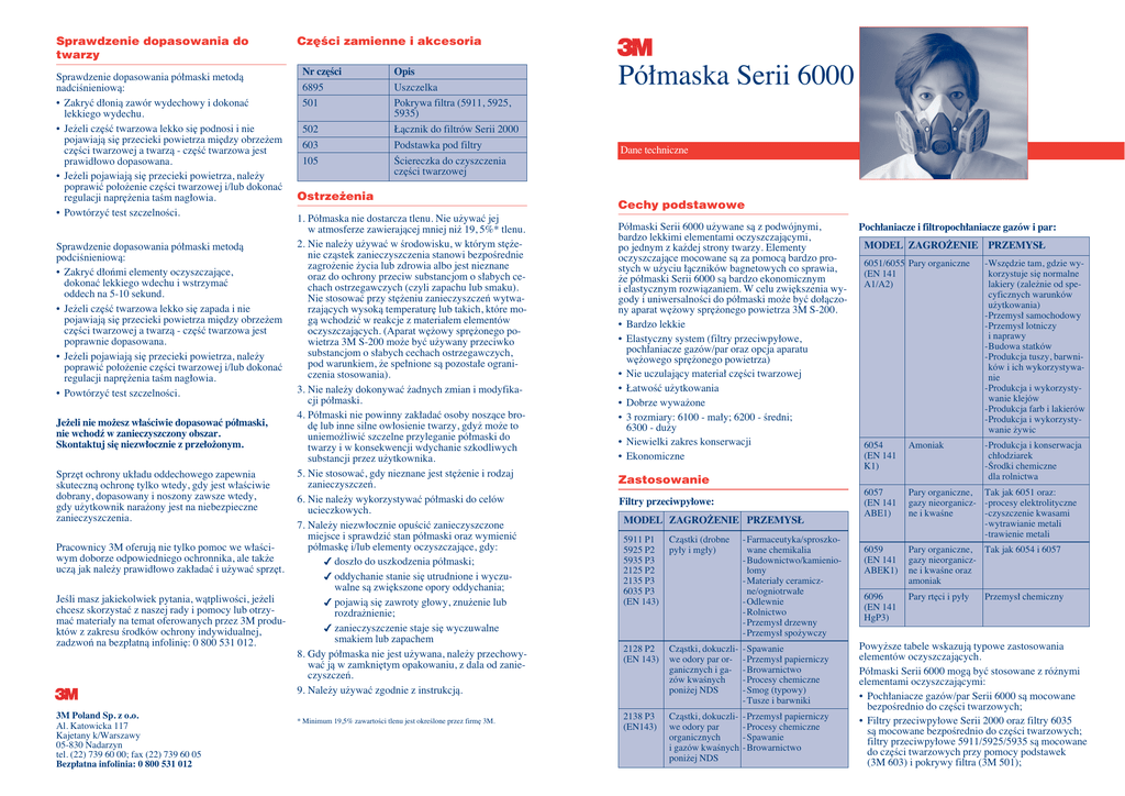 Sprawdzenie dopasowania do twarzy Cz´Êci zamienne i akcesoria Nr cz´Êci Opis 6895 Uszczelka • Zakryç d∏onià zawór wydechowy i dokonaç lekkiego wydechu. 501 Pokrywa filtra (5911, 5925, 5935) • Je˝eli cz´Êç twarzowa lekko si´ podnosi i nie pojawiajà si´ przecieki powietrza mi´dzy obrze˝em cz´Êci twarzowej a twarzà - cz´Êç twarzowa jest prawid∏owo dopasowana. 502 ¸àcznik do filtrów Serii 2000 603 Podstawka pod filtry 105 Âciereczka do czyszczenia cz´Êci twarzowej Sprawdzenie dopasowania pó∏maski metodà nadciÊnieniowà: • Je˝eli pojawiajà si´ przecieki powietrza, nale˝y poprawiç po∏o˝enie cz´Êci twarzowej i/lub dokonaç regulacji napr´˝enia taÊm nag∏owia. • Powtórzyç test szczelnoÊci. Sprawdzenie dopasowania pó∏maski metodà podciÊnieniowà: • Zakryç d∏oƒmi elementy oczyszczajàce, dokonaç lekkiego wdechu i wstrzymaç oddech na 5-10 sekund. • Je˝eli cz´Êç twarzowa lekko si´ zapada i nie pojawiajà si´ przecieki powietrza mi´dzy obrze˝em cz´Êci twarzowej a twarzà - cz´Êç twarzowa jest poprawnie dopasowana. • Je˝eli pojawiajà si´ przecieki powietrza, nale˝y poprawiç po∏o˝enie cz´Êci twarzowej i/lub dokonaç regulacji napr´˝enia taÊm nag∏owia. Ostrze˝enia 1. Pó∏maska nie dostarcza tlenu. Nie u˝ywaç jej w atmosferze zawierajàcej mniej ni˝ 19, 5%* tlenu. 2. Nie nale˝y u˝ywaç w Êrodowisku, w którym st´˝enie czàstek zanieczyszczenia stanowi bezpoÊrednie zagro˝enie ˝ycia lub zdrowia albo jest nieznane oraz do ochrony przeciw substancjom o s∏abych cechach ostrzegawczych (czyli zapachu lub smaku). Nie stosowaç przy st´˝eniu zanieczyszczeƒ wytwarzajàcych wysokà temperatur´ lub takich, które mogà wchodziç w reakcje z materia∏em elementów oczyszczajàcych. (Aparat w´˝owy spr´˝onego powietrza 3M S-200 mo˝e byç u˝ywany przeciwko substancjom o s∏abych cechach ostrzegawczych, pod warunkiem, ˝e spe∏nione sà pozosta∏e ograniczenia stosowania). Pó∏maska Serii 6000 Dane techniczne Cechy podstawowe Pó∏maski Serii 6000 u˝ywane sà z podwójnymi, bardzo lekkimi elementami oczyszczajàcymi, po jednym z ka˝dej strony twarzy. Elementy oczyszczajàce mocowane sà za pomocà bardzo prostych w u˝yciu ∏àczników bagnetowych co sprawia, ˝e pó∏maski Serii 6000 sà bardzo ekonomicznym i elastycznym rozwiàzaniem. W celu zwi´kszenia wygody i uniwersalnoÊci do pó∏maski mo˝e byç do∏àczony aparat w´˝owy spr´˝onego powietrza 3M S-200. • Nie uczulajàcy materia∏ cz´Êci twarzowej • ¸atwoÊç u˝ytkowania Je˝eli nie mo˝esz w∏aÊciwie dopasowaç pó∏maski, nie wchodê w zanieczyszczony obszar. Skontaktuj si´ niezw∏ocznie z prze∏o˝onym. 4. Pó∏maski nie powinny zak∏adaç osoby noszàce brod´ lub inne silne ow∏osienie twarzy, gdy˝ mo˝e to uniemo˝liwiç szczelne przyleganie pó∏maski do twarzy i w konsekwencji wdychanie szkodliwych substancji przez u˝ytkownika. • 3 rozmiary: 6100 - ma∏y; 6200 - Êredni; 6300 - du˝y Pracownicy 3M oferujà nie tylko pomoc we w∏aÊciwym doborze odpowiedniego ochronnika, ale tak˝e uczà jak nale˝y prawid∏owo zak∏adaç i u˝ywaç sprz´t. JeÊli masz jakiekolwiek pytania, wàtpliwoÊci, je˝eli chcesz skorzystaç z naszej rady i pomocy lub otrzymaç materia∏y na temat oferowanych przez 3M produktów z zakresu Êrodków ochrony indywidualnej, zadzwoƒ na bezp∏atnà infolini´: 0 800 531 012. • Dobrze wywa˝one • Niewielki zakres konserwacji • Ekonomiczne 5. Nie stosowaç, gdy nieznane jest st´˝enie i rodzaj zanieczyszczeƒ. Zastosowanie 6. Nie nale˝y wykorzystywaç pó∏maski do celów ucieczkowych. Filtry przeciwpy∏owe: 4 dosz∏o do uszkodzenia pó∏maski; 4 oddychanie stanie si´ utrudnione i wyczuwalne sà zwi´kszone opory oddychania; 4 pojawià si´ zawroty g∏owy, znu˝enie lub rozdra˝nienie; MODEL ZAGRO˚ENIE PRZEMYS¸ * Minimum 19,5% zawartoÊci tlenu jest okreÊlone przez firm´ 3M. -Wsz´dzie tam, gdzie wykorzystuje si´ normalne lakiery (zale˝nie od specyficznych warunków u˝ytkowania) -Przemys∏ samochodowy -Przemys∏ lotniczy i naprawy -Budowa statków -Produkcja tuszy, barwników i ich wykorzystywanie -Produkcja i wykorzystywanie klejów -Produkcja farb i lakierów -Produkcja i wykorzystywanie ˝ywic -Produkcja i konserwacja ch∏odziarek -Ârodki chemiczne dla rolnictwa 6054 (EN 141 K1) Amoniak 6057 (EN 141 ABE1) Pary organiczne, Tak jak 6051 oraz: gazy nieorganicz- -procesy elektrolityczne ne i kwaÊne -czyszczenie kwasami -wytrawianie metali -trawienie metali 6059 (EN 141 ABEK1) Pary organiczne, Tak jak 6054 i 6057 gazy nieorganiczne i kwaÊne oraz amoniak 6096 (EN 141 HgP3) Pary rt´ci i py∏y Czàstki (drobne py∏y i mg∏y) 2128 P2 (EN 143) Czàstki, dokuczliwe odory par organicznych i gazów kwaÊnych poni˝ej NDS - Spawanie - Przemys∏ papierniczy - Browarnictwo - Procesy chemiczne - Smog (typowy) - Tusze i barwniki Powy˝sze tabele wskazujà typowe zastosowania elementów oczyszczajàcych. Czàstki, dokuczliwe odory par organicznych i gazów kwaÊnych poni˝ej NDS - Przemys∏ papierniczy - Procesy chemiczne - Spawanie - Browarnictwo • Filtry przeciwpy∏owe Serii 2000 oraz filtry 6035 sà mocowane bezpoÊrednio do cz´Êci twarzowych; filtry przeciwpy∏owe 5911/5925/5935 sà mocowane do cz´Êci twarzowych przy pomocy podstawek (3M 603) i pokrywy filtra (3M 501); 9. Nale˝y u˝ywaç zgodnie z instrukcjà. 3M Poland Sp. z o.o. Al. Katowicka 117 Kajetany k/Warszawy 05-830 Nadarzyn tel. (22) 739 60 00; fax (22) 739 60 05 Bezp∏atna infolinia: 0 800 531 012 - Farmaceutyka/sproszkowane chemikalia - Budownictwo/kamienio∏omy - Materia∏y ceramiczne/ogniotrwa∏e - Odlewnie - Rolnictwo - Przemys∏ drzewny - Przemys∏ spo˝ywczy PRZEMYS¸ 5911 P1 5925 P2 5935 P3 2125 P2 2135 P3 6035 P3 (EN 143) 4 zanieczyszczenie staje si´ wyczuwalne smakiem lub zapachem 8. Gdy pó∏maska nie jest u˝ywana, nale˝y przechowywaç jà w zamkni´t
