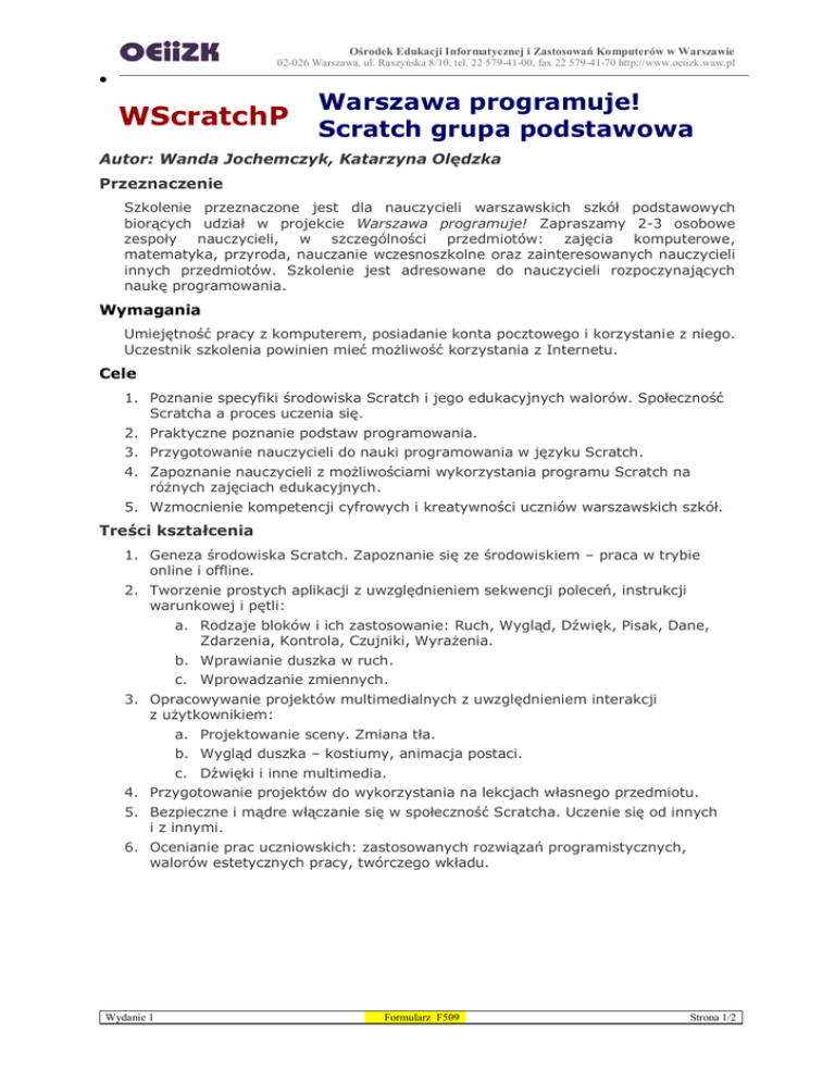 Ośrodek Edukacji Informatycznej i Zastosowań Komputerów w Warszawie 02-026 Warszawa, ul. Raszyńska 8/10, tel. 22 579-41-00, fax 22 579-41-70 http://www.oeiizk.waw.pl WScratchP Warszawa programuje! Scratch grupa podstawowa Autor: Wanda Jochemczyk, Katarzyna Olędzka Przeznaczenie Szkolenie przeznaczone jest dla nauczycieli warszawskich szkół podstawowych biorących udział w projekcie Warszawa programuje! Zapraszamy 2-3 osobowe zespoły nauczycieli, w szczególności przedmiotów: zajęcia komputerowe, matematyka, przyroda, nauczanie wczesnoszkolne oraz zainteresowanych nauczycieli innych przedmiotów. Szkolenie jest adresowane do nauczycieli rozpoczynających naukę programowania. Wymagania Umiejętność pracy z komputerem, posiadanie konta pocztowego i korzystanie z niego. Uczestnik szkolenia powinien mieć możliwość korzystania z Internetu. Cele 1. Poznanie specyfiki środowiska Scratch i jego edukacyjnych walorów. Społeczność Scratcha a proces uczenia się. 2. Praktyczne poznanie podstaw programowania. 3. Przygotowanie nauczycieli do nauki programowania w języku Scratch. 4. Zapoznanie nauczycieli z możliwościami wykorzystania programu Scratch na różnych zajęciach edukacyjnych. 5. Wzmocnienie kompetencji cyfrowych i kreatywności uczniów warszawskich szkół. Treści kształcenia 1. Geneza środowiska Scratch. Zapoznanie się ze środowiskiem – praca w trybie online i offline. 2. Tworzenie prostych aplikacji z uwzględnieniem sekwencji poleceń, instrukcji warunkowej i pętli: a. Rodzaje bloków i ich zastosowanie: Ruch, Wygląd, Dźwięk, Pisak, Dane, Zdarzenia, Kontrola, Czujniki, Wyrażenia. b. Wprawianie duszka w ruch. c. Wprowadzanie zmiennych. 3. Opracowywanie projektów multimedialnych z uwzględnieniem interakcji z użytkownikiem: a. Projektowanie sceny. Zmiana tła. b. Wygląd duszka – kostiumy, animacja postaci. c. Dźwięki i inne multimedia. 4. Przygotowanie projektów do wykorzystania na lekcjach własnego przedmiotu. 5. Bezpieczne i mądre włączanie się w społeczność Scratcha. Uczenie się od innych i z innymi. 6. Ocenianie prac uczniowskich: zastosowanych rozwiązań programistycznych, walorów estetycznych pracy, twórczego wkładu. Wydanie 1 Formularz F509 Strona 1/2 Ośrodek Edukacji Informatycznej i Zastosowań Komputerów w Warszawie 02-026 Warszawa, ul. Raszyńska 8/10, tel. 22 579-41-00, fax 22 579-41-70 http://www.oeiizk.waw.pl Informacje o organizacji Szkolenie trwa 3 tygodnie. Obejmuje 15 godzin wykładów oraz ćwiczeń w formie stacjonarnej (3 spotkania po 5 godzin lub 1 spotkanie 7 godzin i 2 spotkania po 4 godziny) 15 godzin online między zajęciami stacjonarnymi. Zajęcia metodą online prowadzone są na platformie edukacyjnej OEIiZK http://moodle.oeiizk.edu.pl. Warunkiem zaliczenia szkolenia jest uzyskanie przynajmniej 60% punktów z zadań obowiązkowych oraz obecność na minimum dwóch spotkaniach stacjonarnych. Uczestnik, który zaliczy szkolenie otrzymuje na ostatnich zajęciach stacjonarnych zaświadczenie o ukończeniu szkolenia. Literatura The LEAD Project, Scratch. Komiksowa przygoda z programowaniem, Helion 2015. Vorderman C., PROGRAMOWANIE. Jakie to proste!, Arkady 2015. http://scratch.mit.edu – strona domowa i portal społecznościowy środowiska. http://mistrzowiekodowania.pl – w dziale Materiały do pobrania instrukcje i scenariusze zajęć. http://www.enauczanie.com/metodyka/scratch - podręcznik i materiały dotyczące programowania w Scratchu. Wydanie 1 Formularz F509 Strona 2/2