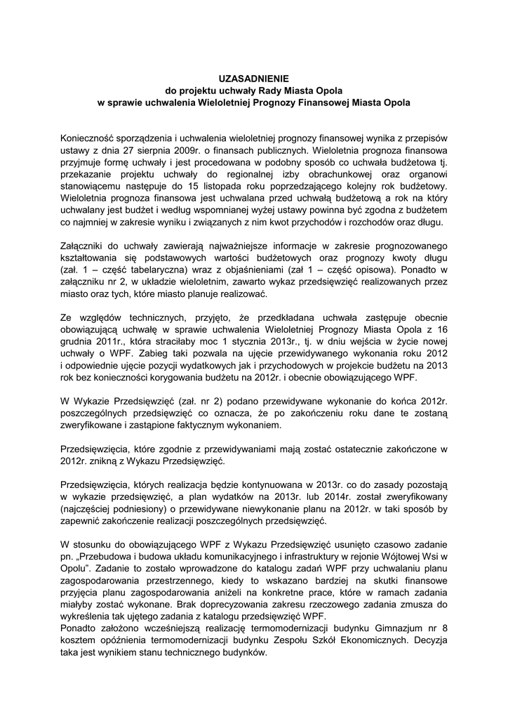 UZASADNIENIE do projektu uchwały Rady Miasta Opola w sprawie uchwalenia Wieloletniej Prognozy Finansowej Miasta Opola Konieczność sporządzenia i uchwalenia wieloletniej prognozy finansowej wynika z przepisów ustawy z dnia 27 sierpnia 2009r. o finansach publicznych. Wieloletnia prognoza finansowa przyjmuje formę uchwały i jest procedowana w podobny sposób co uchwała budŜetowa tj. przekazanie projektu uchwały do regionalnej izby obrachunkowej oraz organowi stanowiącemu następuje do 15 listopada roku poprzedzającego kolejny rok budŜetowy. Wieloletnia prognoza finansowa jest uchwalana przed uchwałą budŜetową a rok na który uchwalany jest budŜet i według wspomnianej wyŜej ustawy powinna być zgodna z budŜetem co najmniej w zakresie wyniku i związanych z nim kwot przychodów i rozchodów oraz długu. Załączniki do uchwały zawierają najwaŜniejsze informacje w zakresie prognozowanego kształtowania się podstawowych wartości budŜetowych oraz prognozy kwoty długu (zał. 1 – część tabelaryczna) wraz z objaśnieniami (zał 1 – część opisowa). Ponadto w załączniku nr 2, w układzie wieloletnim, zawarto wykaz przedsięwzięć realizowanych przez miasto oraz tych, które miasto planuje realizować. Ze względów technicznych, przyjęto, Ŝe przedkładana uchwała zastępuje obecnie obowiązującą uchwałę w sprawie uchwalenia Wieloletniej Prognozy Miasta Opola z 16 grudnia 2011r., która straciłaby moc 1 stycznia 2013r., tj. w dniu wejścia w Ŝycie nowej uchwały o WPF. Zabieg taki pozwala na ujęcie przewidywanego wykonania roku 2012 i odpowiednie ujęcie pozycji wydatkowych jak i przychodowych w projekcie budŜetu na 2013 rok bez konieczności korygowania budŜetu na 2012r. i obecnie obowiązującego WPF. W Wykazie Przedsięwzięć (zał. nr 2) podano przewidywane wykonanie do końca 2012r. poszczególnych przedsięwzięć co oznacza, Ŝe po zakończeniu roku dane te zostaną zweryfikowane i zastąpione faktycznym wykonaniem. Przedsięwzięcia, które zgodnie z przewidywaniami mają zostać ostatecznie zakończone w 2012r. znikną z Wykazu Przedsięwzięć. Przedsięwzięcia, których realizacja będzie kontynuowana w 2013r. co do zasady pozostają w wykazie przedsięwzięć, a plan wydatków na 2013r. lub 2014r. został zweryfikowany (najczęściej podniesiony) o przewidywane niewykonanie planu na 2012r. w taki sposób by zapewnić zakończenie realizacji poszczególnych przedsięwzięć. W stosunku do obowiązującego WPF z Wykazu Przedsięwzięć usunięto czasowo zadanie pn. „Przebudowa i budowa układu komunikacyjnego i infrastruktury w rejonie Wójtowej Wsi w Opolu”. Zadanie to zostało wprowadzone do katalogu zadań WPF przy uchwalaniu planu zagospodarowania przestrzennego, kiedy to wskazano bardziej na skutki finansowe przyjęcia planu zagospodarowania aniŜeli na konkretne prace, które w ramach zadania miałyby zostać wykonane. Brak doprecyzowania zakresu rzeczowego zadania zmusza do wykreślenia tak ujętego zadania z katalogu przedsięwzięć WPF. Ponadto załoŜono wcześniejszą realizację termomodernizacji budynku Gimnazjum nr 8 kosztem opóźnienia termomodernizacji budynku Zespołu Szkół Ekonomicznych. Decyzja taka jest wynikiem stanu technicznego budynków. Zrezygnowano równieŜ z realizacji rzeczowej części zadania pn. „Rozbudowa stadionu miejskiego przy ul. Oleskiej w Opolu”. Odstąpiono takŜe od koncepcji budowy lokali socjalnych. Przedmiotowy projekt uchwały podlega zaopiniowaniu przez Regionalną Izbę Obrachunkową w Opolu. Następnie, po uchwaleniu przez Radę Miasta Opola uchwały w sprawie uchwalenia Wieloletniej Prognozy Finansowej Miasta Opola, Izba wydaje opinię o prawidłowości planowanej kwoty długu.