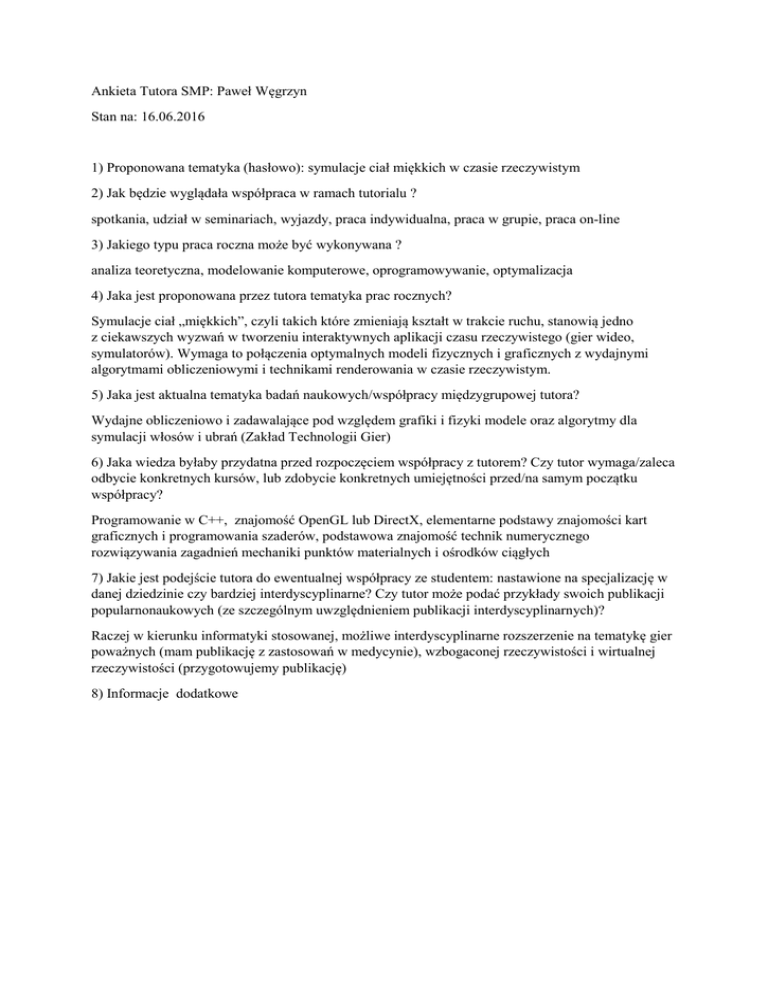 Ankieta Tutora SMP: Paweł Węgrzyn Stan na: 16.06.2016 1) Proponowana tematyka (hasłowo): symulacje ciał miękkich w czasie rzeczywistym 2) Jak będzie wyglądała współpraca w ramach tutorialu ? spotkania, udział w seminariach, wyjazdy, praca indywidualna, praca w grupie, praca on-line 3) Jakiego typu praca roczna może być wykonywana ? analiza teoretyczna, modelowanie komputerowe, oprogramowywanie, optymalizacja 4) Jaka jest proponowana przez tutora tematyka prac rocznych? Symulacje ciał „miękkich”, czyli takich które zmieniają kształt w trakcie ruchu, stanowią jedno z ciekawszych wyzwań w tworzeniu interaktywnych aplikacji czasu rzeczywistego (gier wideo, symulatorów). Wymaga to połączenia optymalnych modeli fizycznych i graficznych z wydajnymi algorytmami obliczeniowymi i technikami renderowania w czasie rzeczywistym. 5) Jaka jest aktualna tematyka badań naukowych/współpracy międzygrupowej tutora? Wydajne obliczeniowo i zadawalające pod względem grafiki i fizyki modele oraz algorytmy dla symulacji włosów i ubrań (Zakład Technologii Gier) 6) Jaka wiedza byłaby przydatna przed rozpoczęciem współpracy z tutorem? Czy tutor wymaga/zaleca odbycie konkretnych kursów, lub zdobycie konkretnych umiejętności przed/na samym początku współpracy? Programowanie w C++, znajomość OpenGL lub DirectX, elementarne podstawy znajomości kart graficznych i programowania szaderów, podstawowa znajomość technik numerycznego rozwiązywania zagadnień mechaniki punktów materialnych i ośrodków ciągłych 7) Jakie jest podejście tutora do ewentualnej współpracy ze studentem: nastawione na specjalizację w danej dziedzinie czy bardziej interdyscyplinarne? Czy tutor może podać przykłady swoich publikacji popularnonaukowych (ze szczególnym uwzględnieniem publikacji interdyscyplinarnych)? Raczej w kierunku informatyki stosowanej, możliwe interdyscyplinarne rozszerzenie na tematykę gier poważnych (mam publikację z zastosowań w medycynie), wzbogaconej rzeczywistości i wirtualnej rzeczywistości (przygotowujemy publikację) 8) Informacje dodatkowe