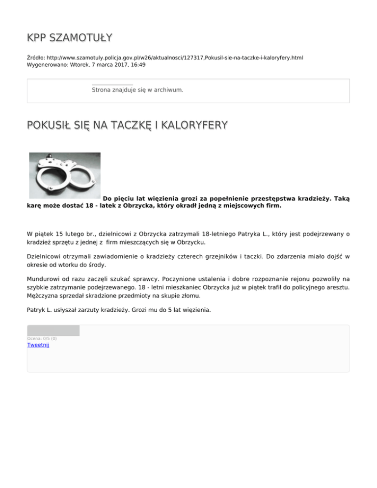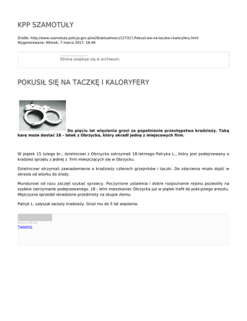 KPP SZAMOTUŁY Źródło: http://www.szamotuly.policja.gov.pl/w26/aktualnosci/127317,Pokusil-sie-na-taczke-i-kaloryfery.html Wygenerowano: Wtorek, 7 marca 2017, 16:49 Strona znajduje się w archiwum. POKUSIŁ SIĘ NA TACZKĘ I KALORYFERY Do pięciu lat więzienia grozi za popełnienie przestępstwa kradzieży. Taką karę może dostać 18 - latek z Obrzycka, który okradł jedną z miejscowych firm. W piątek 15 lutego br., dzielnicowi z Obrzycka zatrzymali 18-letniego Patryka L., który jest podejrzewany o kradzież sprzętu z jednej z firm mieszczących się w Obrzycku. Dzielnicowi otrzymali zawiadomienie o kradzieży czterech grzejników i taczki. Do zdarzenia miało dojść w okresie od wtorku do środy. Mundurowi od razu zaczęli szukać sprawcy. Poczynione ustalenia i dobre rozpoznanie rejonu pozwoliły na szybkie zatrzymanie podejrzewanego. 18 - letni mieszkaniec Obrzycka już w piątek trafił do policyjnego aresztu. Mężczyzna sprzedał skradzione przedmioty na skupie złomu. Patryk L. usłyszał zarzuty kradzieży. Grozi mu do 5 lat więzienia. Ocena: 0/5 (0) Tweetnij