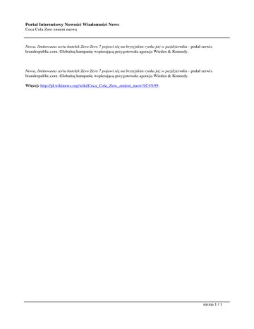 Portal Internetowy Nowości Wiadomości News Coca Cola Zero zmieni nazwę Nowa, limitowana seria butelek Zero Zero 7 pojawi się na brytyjskim rynku już w październiku - podał serwis brandrepublic.com. Globalną kampanię wspierającą przygotowała agencja Wieden & Kennedy. Nowa, limitowana seria butelek Zero Zero 7 pojawi się na brytyjskim rynku już w październiku - podał serwis brandrepublic.com. Globalną kampanię wspierającą przygotowała agencja Wieden & Kennedy. Więcej: http://pl.wikinews.org/wiki/Coca_Cola_Zero_zmieni_nazw%C4%99. strona 1 / 1